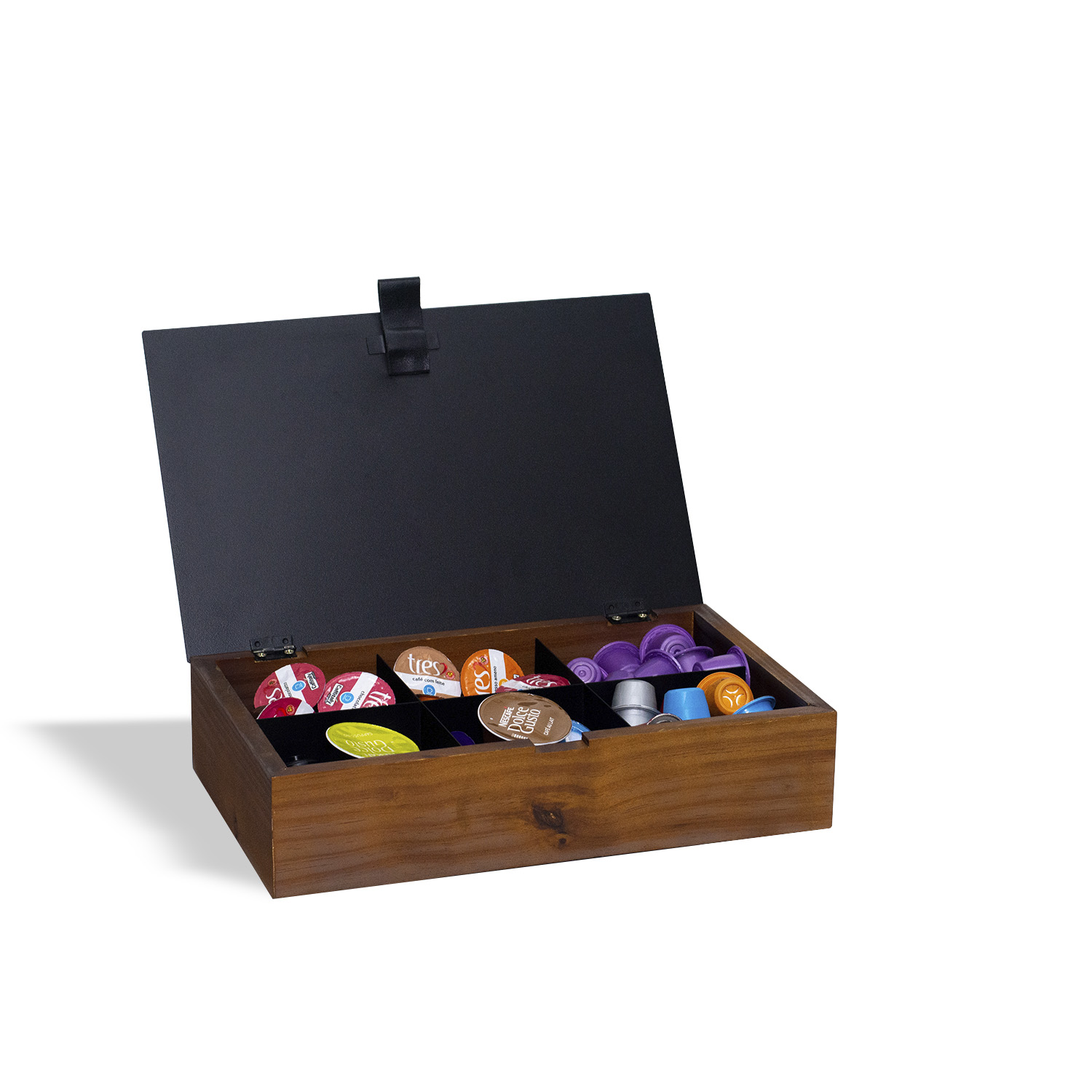Capacidade: aproximadamente 60 cápsulas de Nespresso ou 48 cápsulas de Três Corações ou 30 cápsulas de Dolce Gusto ou 60 sachês de chá.