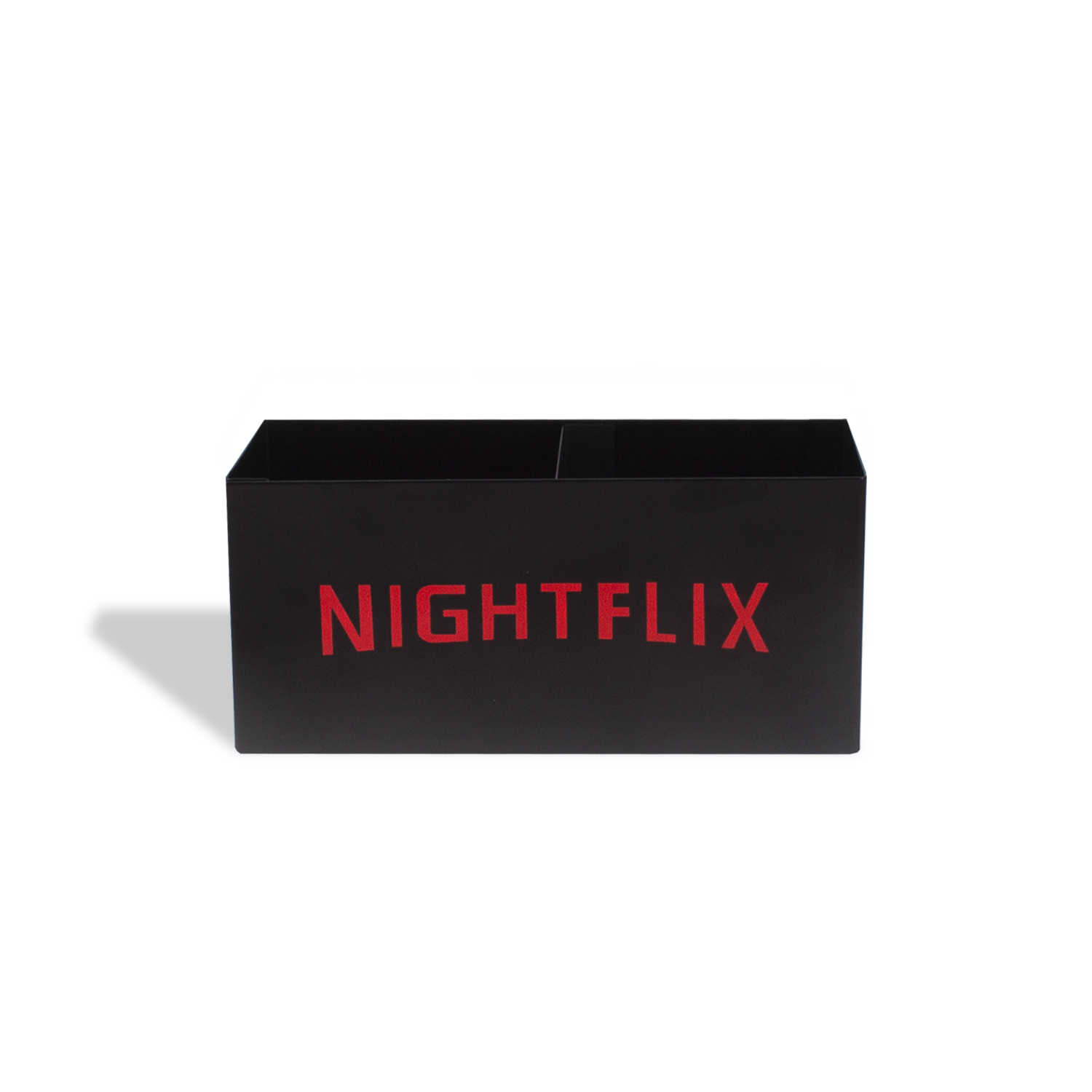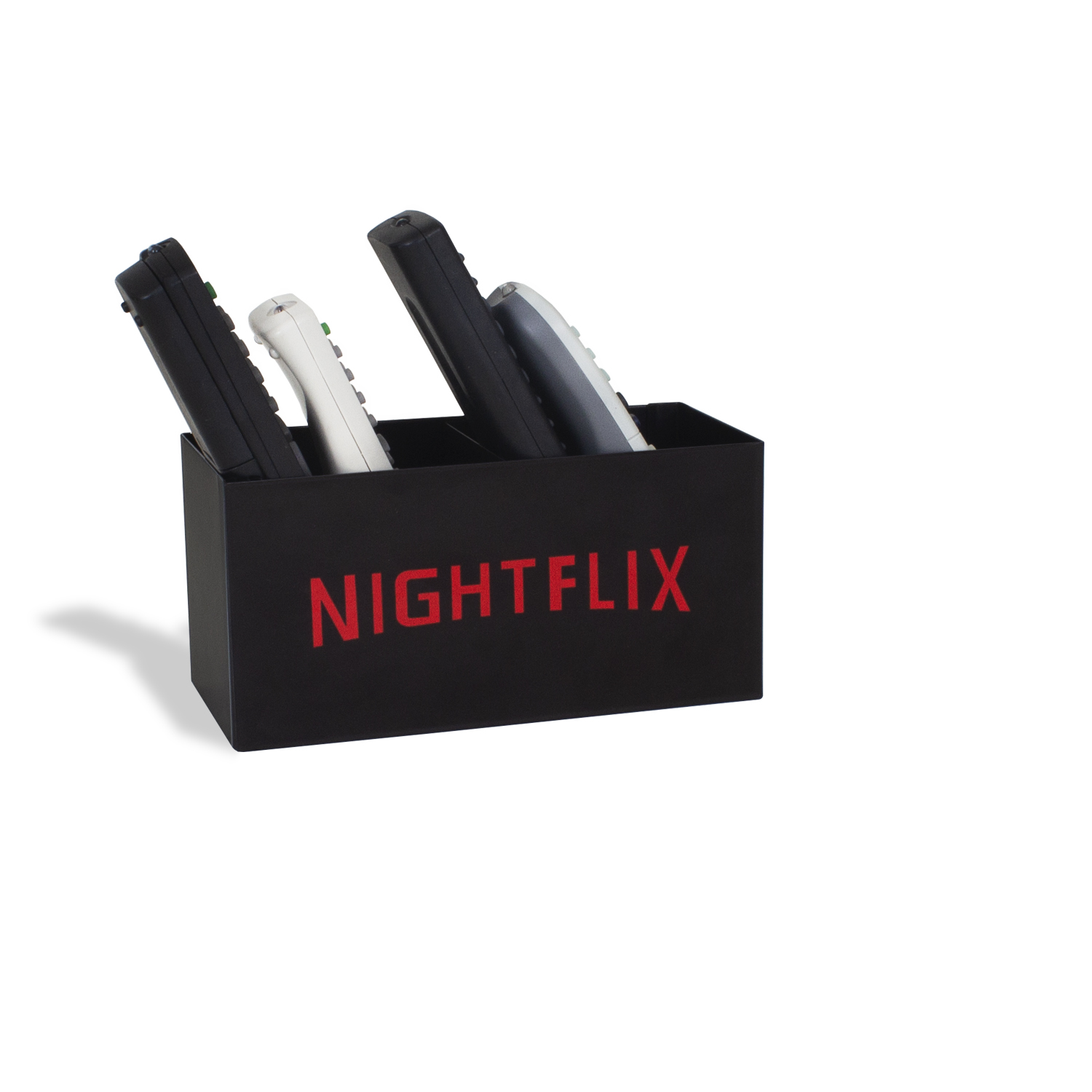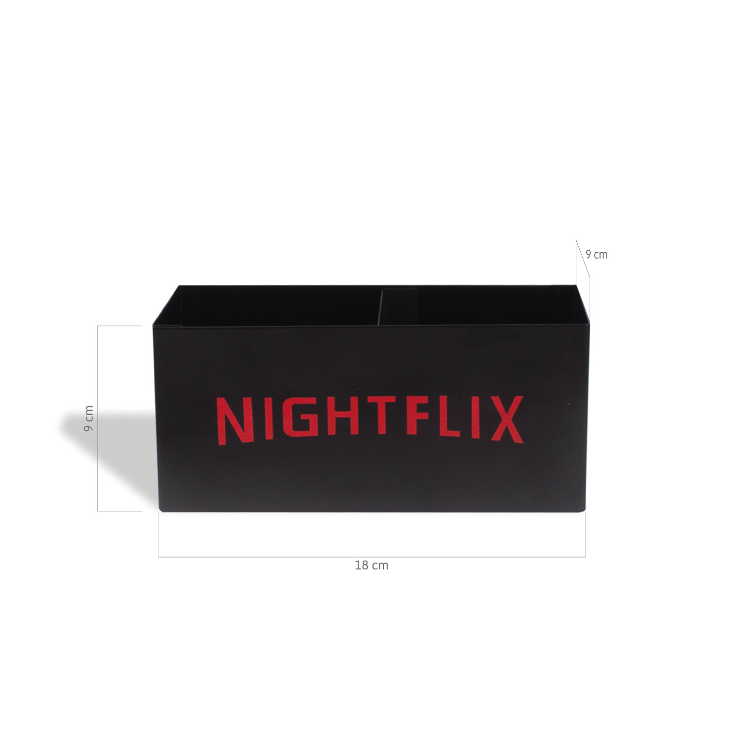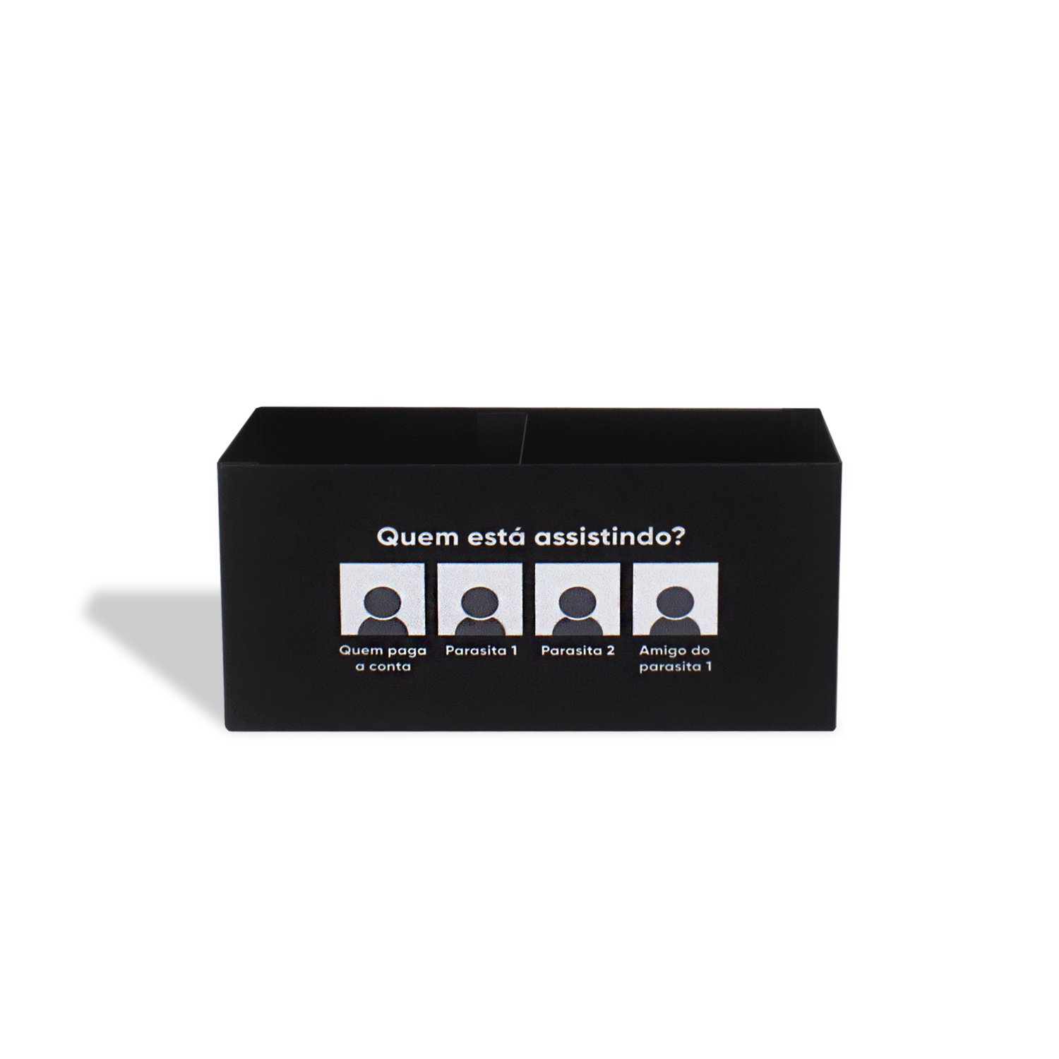 Nightflix. Quem está assistindo? Quem paga a conta, parasita 1, parasita 2, amigo do parasita 1. Divertido, jovem e compacto - possui 2 compartimentos para organizar os controles (tv, ar-condicionado) do seu ambiente. Produto de aço fabricado no Brasil. Todo dia é dia de se divertir! Em qualquer hora e em qualquer lugar! Então, por que não decorar os nossos ambientes com produtos que além de funcionais e práticos sejam divertidos? Lembrou de alguém? Os controles não acompanham o produto.