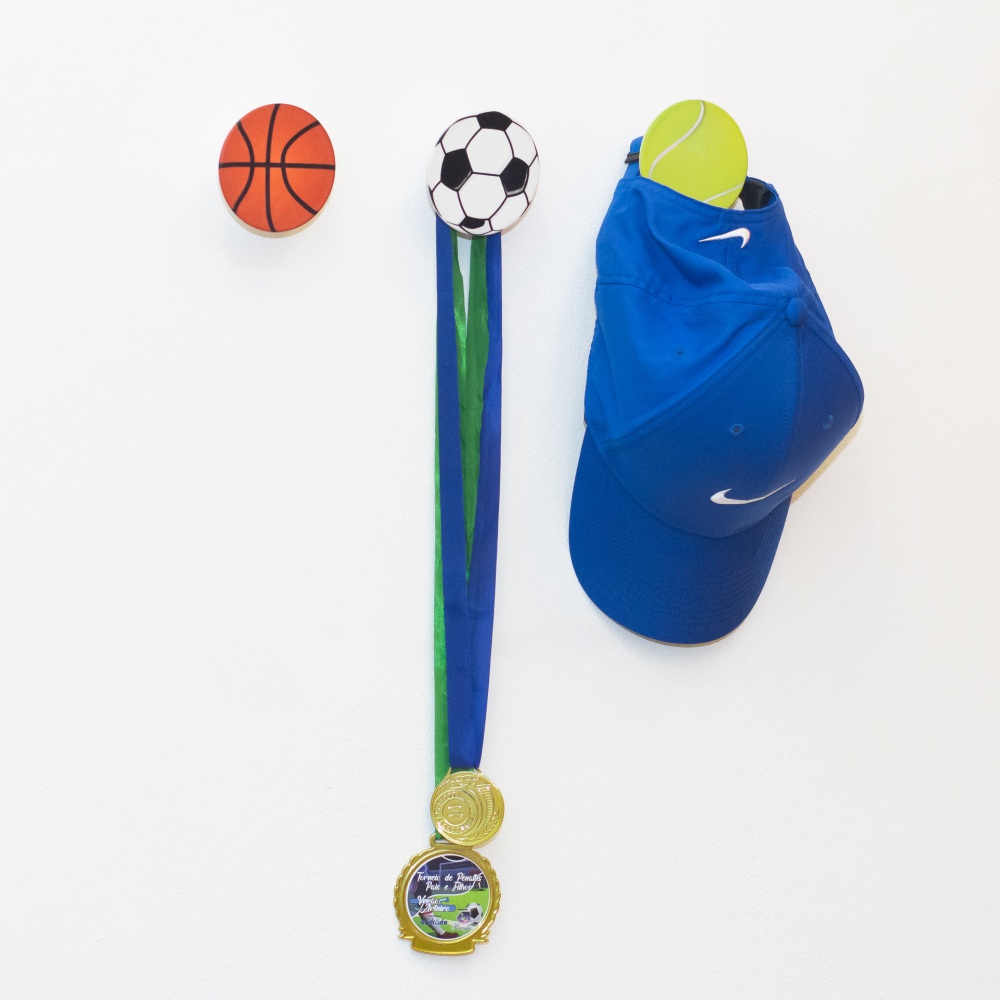 Gancho em formato de bola de tênis, prático e funcional, para organizar e decorar fazendo composições. Também temos ganchos em formato de bola de futebol e de bola de basquete. Para fixar em paredes de alvenaria, o parafuso está embutido no gancho, acompanha 1 bucha. Produto de aço e madeira certificada de reflorestamento fabricado no Brasil. Os acessórios pendurados nos ganchos não acompanham o produto.