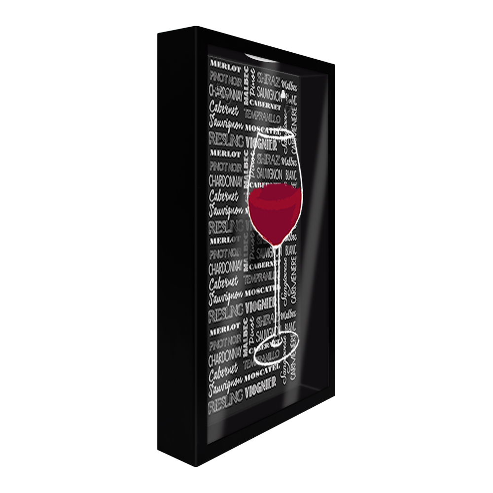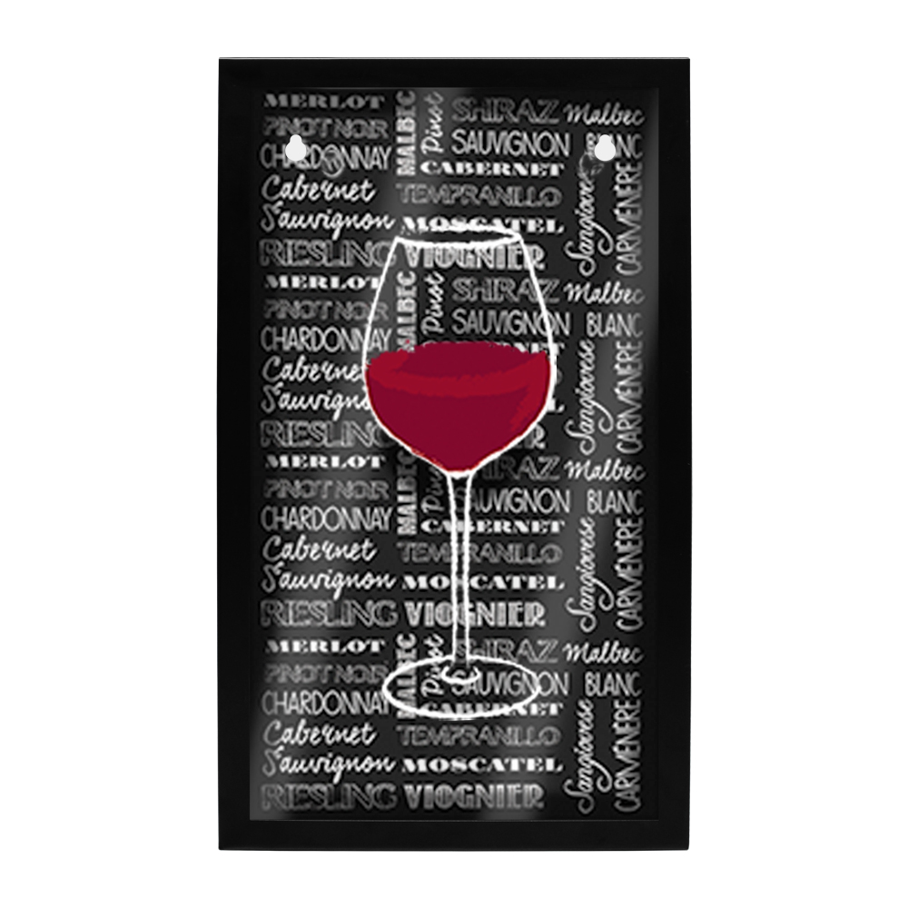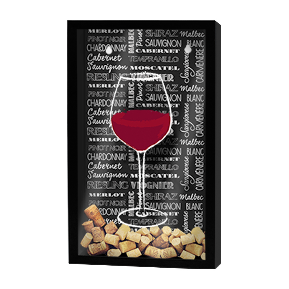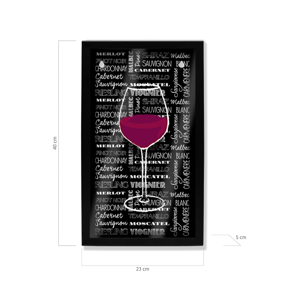 Merlot, Malbec, Blanc, Cabernet, Shraz, Riesling, Moscatel, Sauvignon, Chardonnay, Pinot, qual é o seu favorito? Para colocar as rolhas dos vinhos que bebemos dentro do quadro porta rolhas, decorar e recordar bons momentos. Produto de aço e vidro fabricado no Brasil. Para fixar em parede de alvenaria com os parafusos e buchas que acompanham o produto. A Coleção Happy Hour é uma celebração à vida. A vida não é só para ser vivida. É para ser celebrada. Reuna a família e os amigos. As rolhas não acompanham o produto.