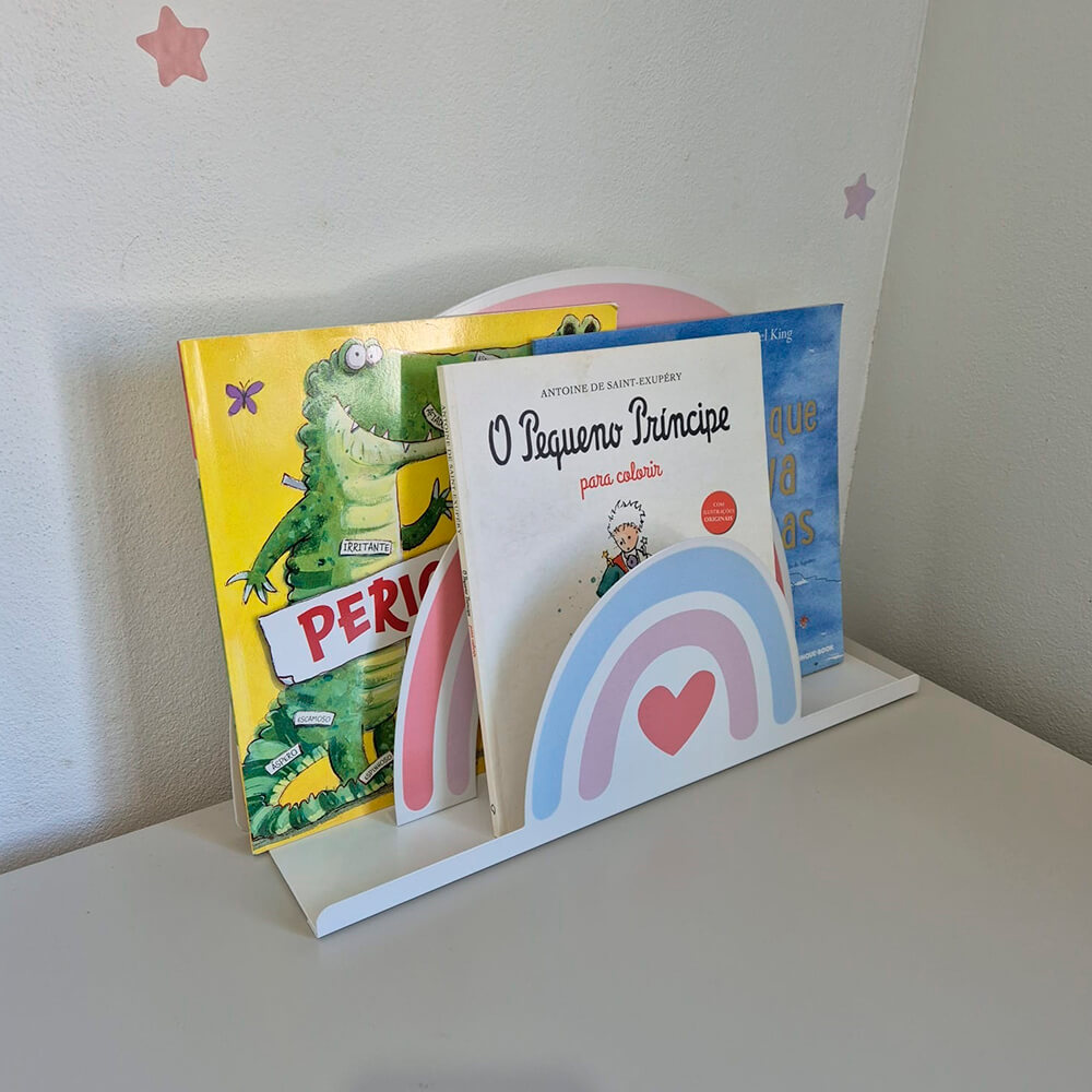 prateleira de livros infantil arco-íris