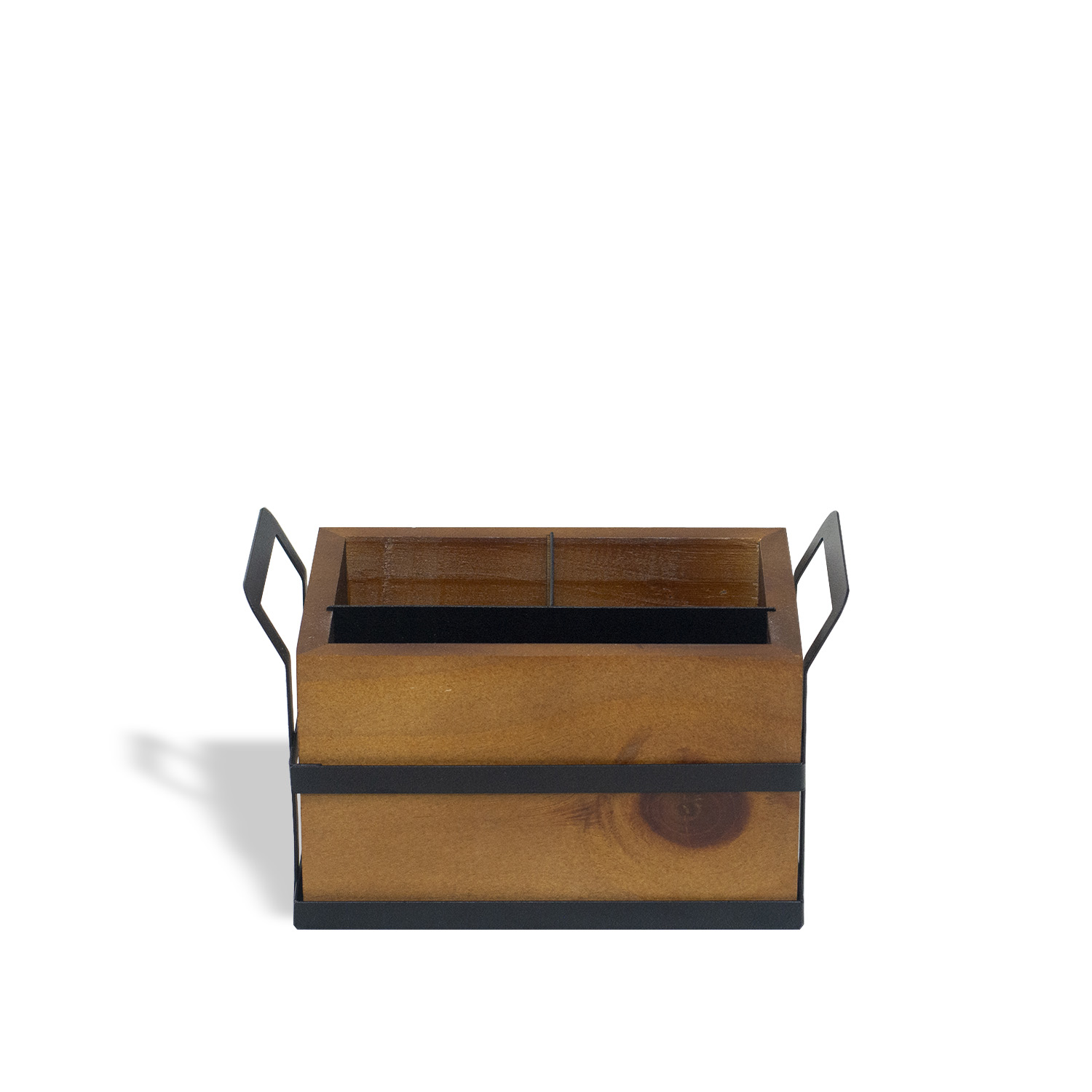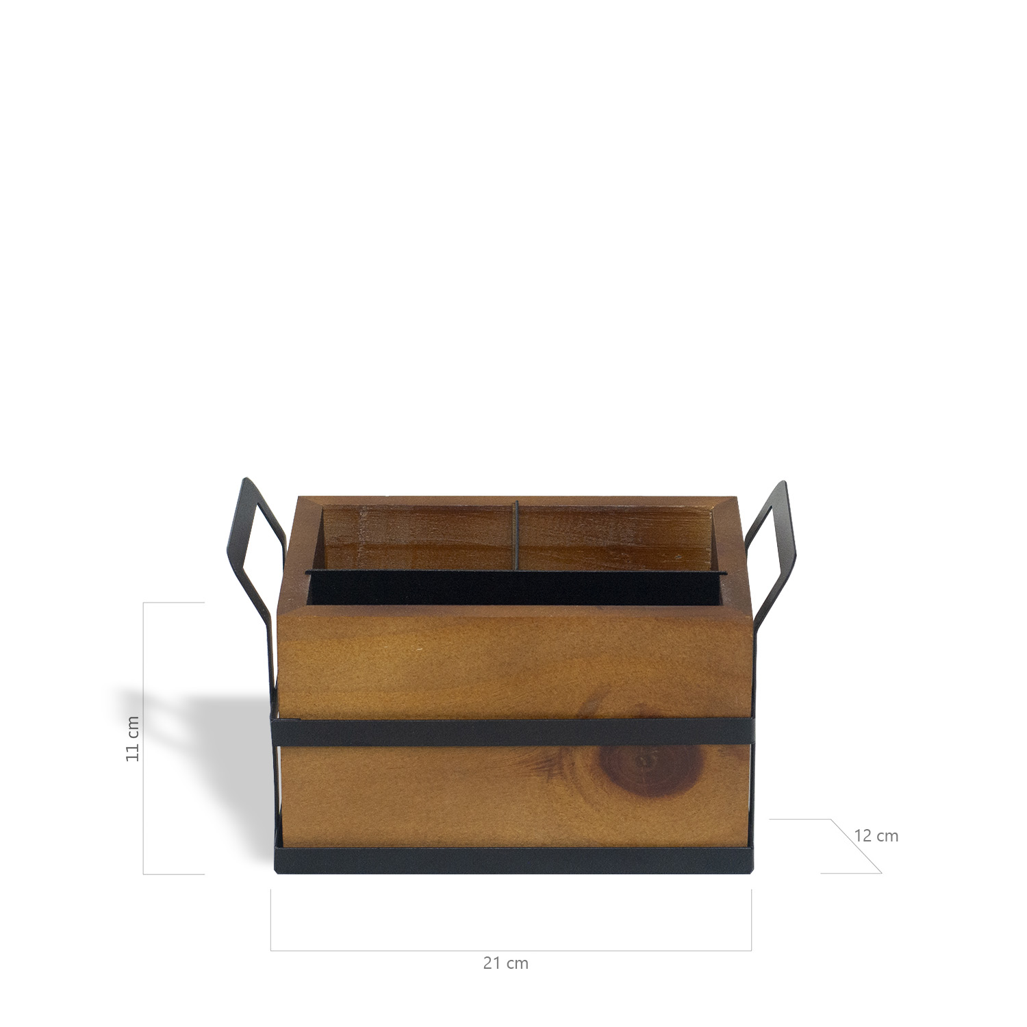 Apresenta toda a beleza do aço recortado e da madeira com suas variações de tonalidades e veios que levam para a sua casa uma identidade única que esbanja charme e autenticidade. Possui 2 compartimentos para talheres e 1 compatimento para guardanapos. Também pode ser utilizado separadamente, o suporte de aço para colocar o azeite, sal, pimenta e vinagre e a caixa de madeira para os talheres e guardanapos. Produto de aço e madeira fabricado no Brasil. A Coleção Bistrô é inspirada nos aconchegantes e pequenos restaurantes franceses que servem uma refeição caseira, trabalham com comida, bebidas alcoólicas, chás e cafés, como um bar e restaurante. Reuna os amigos e a família. Os talheres, azeite, saleiro, pimenteiro e vinagre não acompanham o produto.