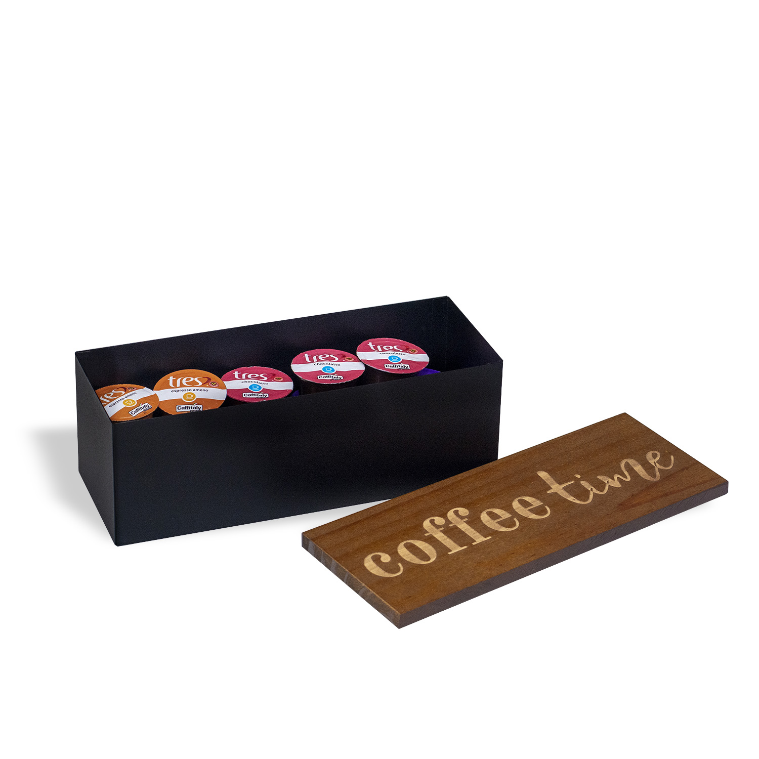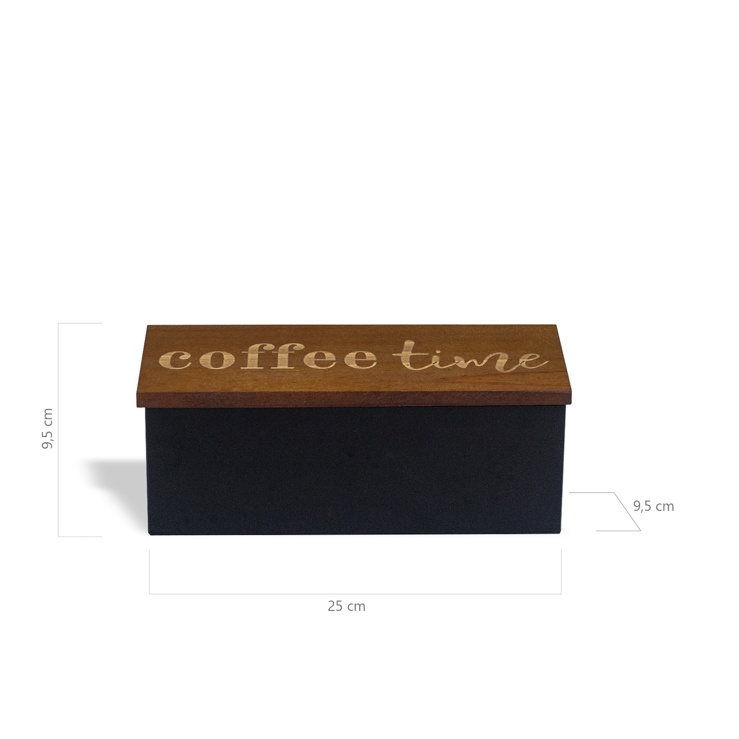 Coffee time, hora do café. Caixa com capacidade para aproximadamente 9 cápsulas de Dolce Gusto ou 12 cápsulas de Três Corações ou 18 cápsulas de Nespresso. Decore, inspire e organize seu cantinho do café. Produto de aço e madeira certificada de reflorestamento fabricado no Brasil. A Coleção Bistrô é inspirada nos aconchegantes e pequenos restaurantes franceses que servem uma refeição caseira, trabalham com comida, bebidas alcoólicas, chás e cafés, como um bar e restaurante. Sugestão de presente para quem ama café. As cápsulas não acompanham o produto.