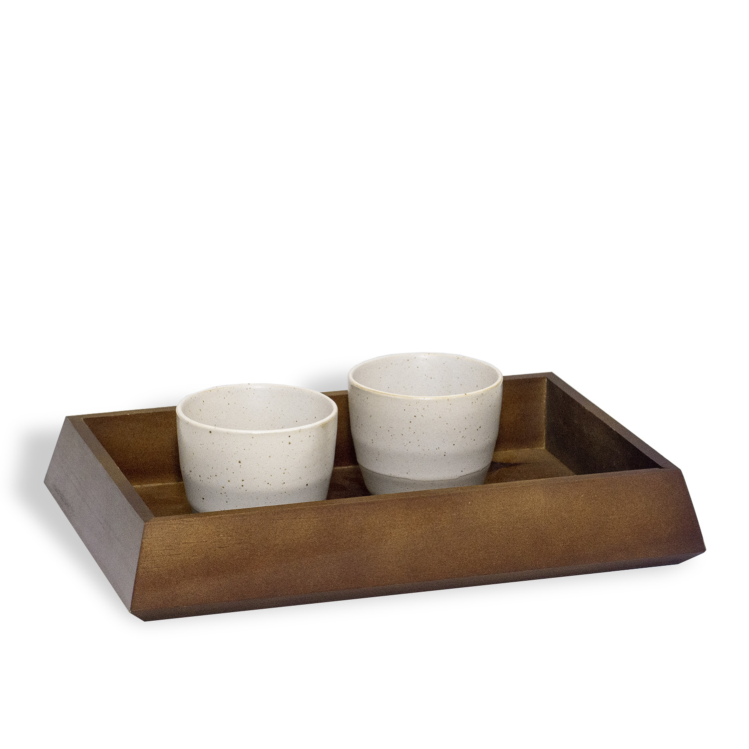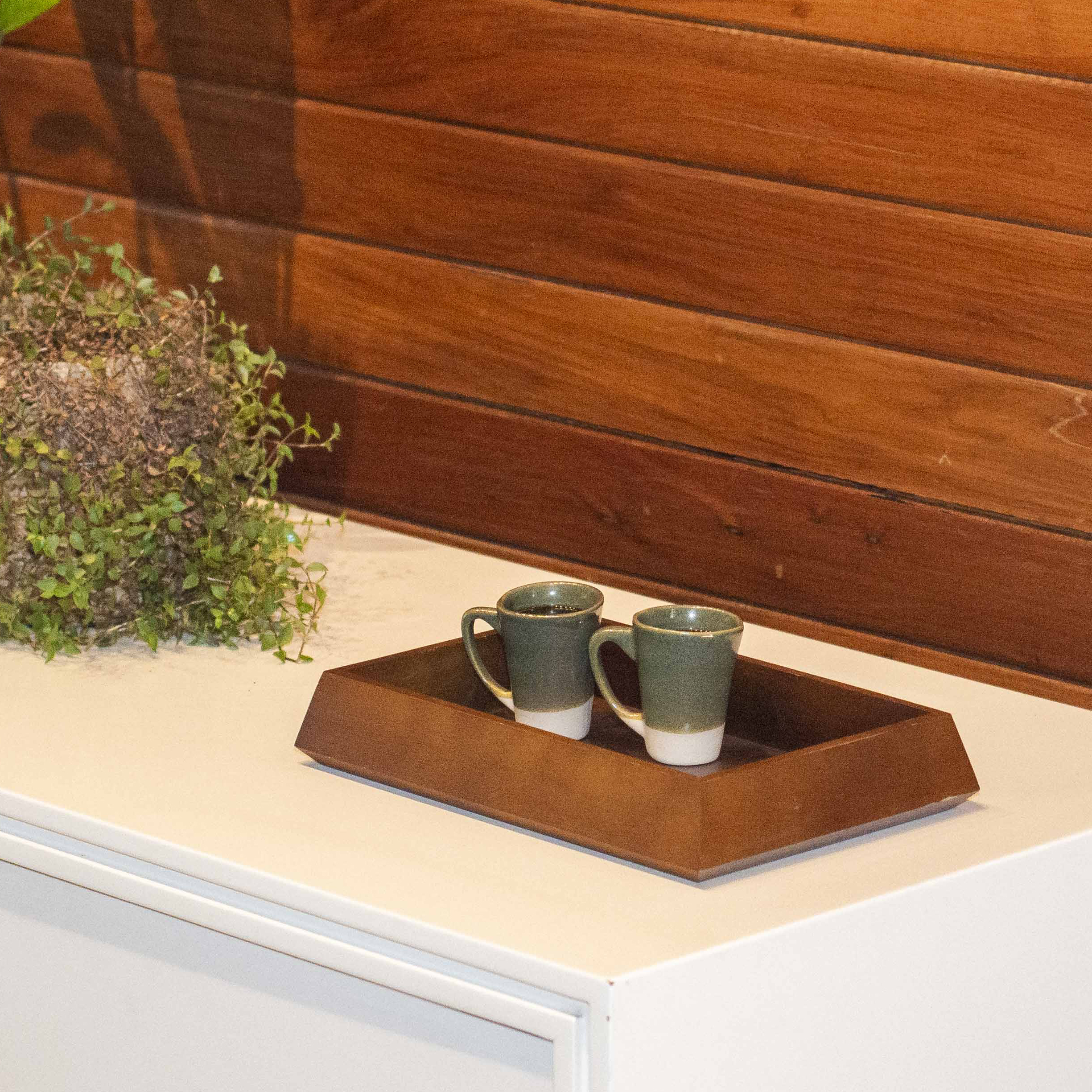Inspirada no formato de pirâmide, sofisticada e funcional, para organizar, servir e decorar, esta bandeja apresenta toda a beleza da madeira maciça com suas variações de tonalidades e veios que levam para a sua casa uma identidade única que esbanja charme e autenticidade. Produto de maderia certificada de reflorestamento fabricado no Brasil. A coleção Floresta Urbana decora e traz um pouco da natureza para o seu dia-a-dia. As xícaras não acompanham o produto.