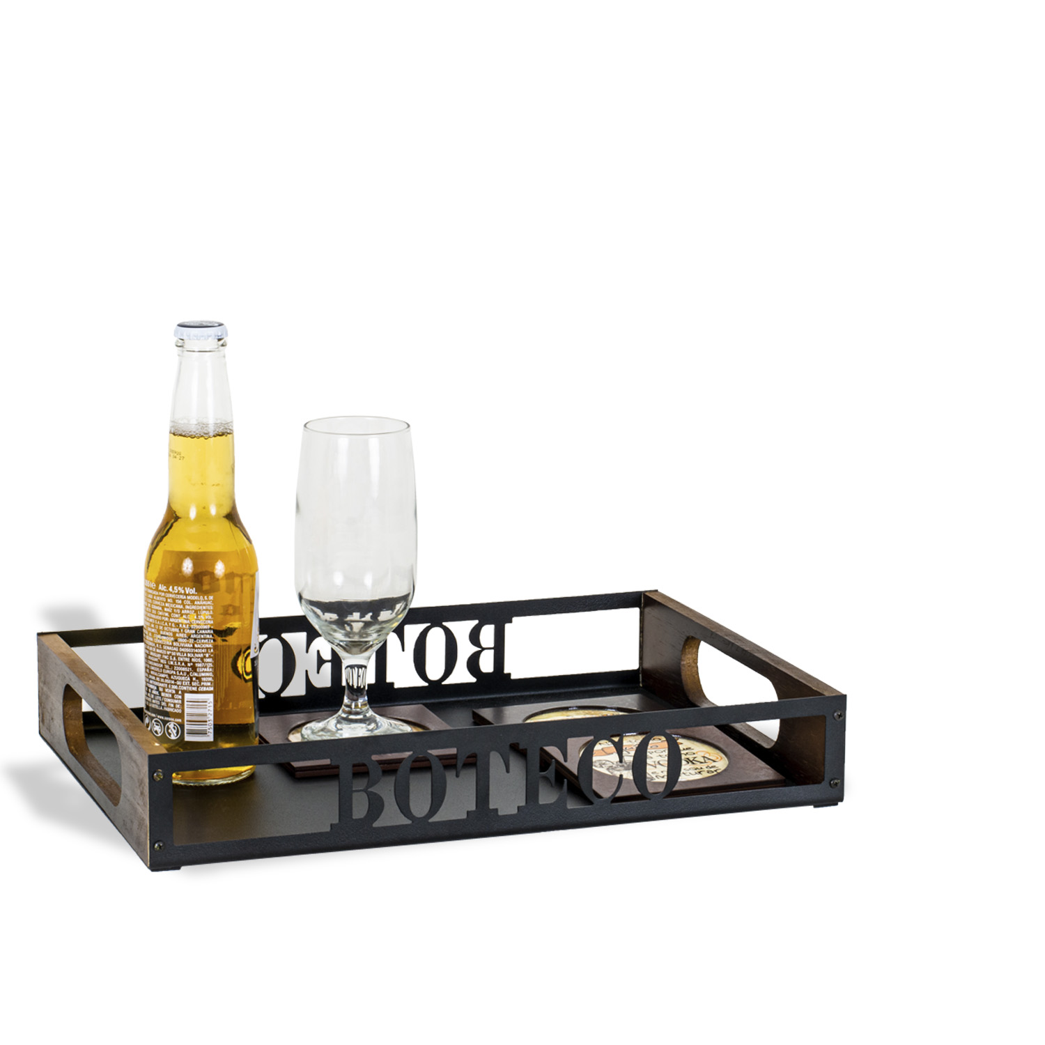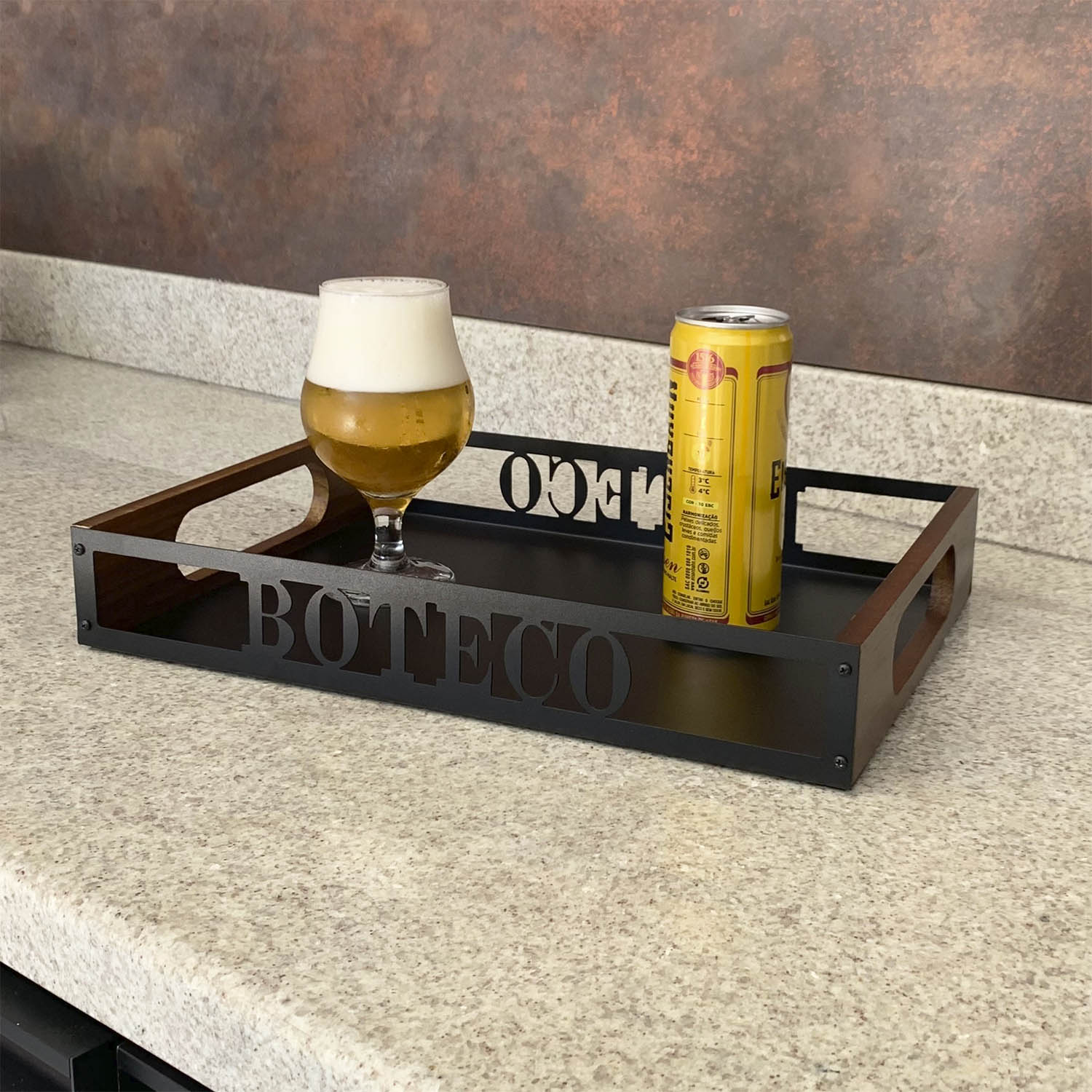 A bandeja Boteco apresenta toda a beleza do aço recortado e da madeira maciça com suas variações de tonalidades e veios que levam para a sua casa uma identidade única que esbanja charme e autenticidade. A madeira utilizada é certificada de reflorestamento. Produto fabricado no Brasil. A Coleção Happy Hour é uma celebração à vida. A vida não é só para ser vivida. É para ser celebrada. Sugestão de presente para homens. A lata, taça de cerveja não acompanham o produto
