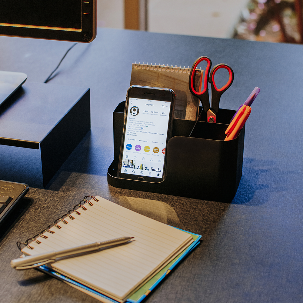 Para organizar e decorar a mesa de trabalho. Nele você pode colocar o celular, lápis, caneta, tesoura... Produto de aço fabricado no Brasil. A Coleção Básica é atemporal, minimalista e neutra. Minimalismo é simplificar a vida eliminando os excessos e mantendo apenas o que é essencial, sem abrir mão da funcionalidade e da praticidade. Sugestão de presente para o dia dos pais. Os lápis, canetas, tesoura, celular não acompanham o produto.