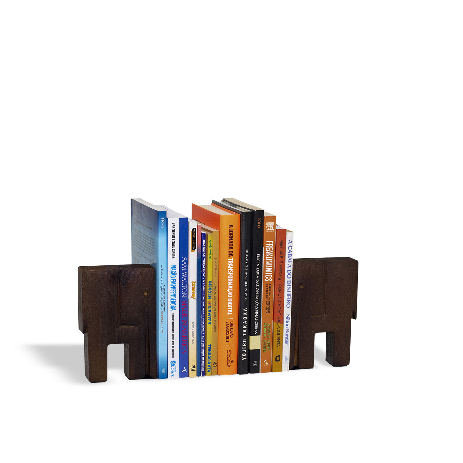 Para segurar e organizar livros decorando. O elefante é símbolo de boa sorte, sabedoria, poder e sucesso. Também é considerado referência de lealdade, companheirismo e unidade por seu comportamento em manada. Produto fabricado no Brasil de aço e madeira certificada de reflorestamento. A coleção Floresta Urbana decora e traz um pouco da natureza para o seu dia-a-dia. Os livros não acompanham o produto.