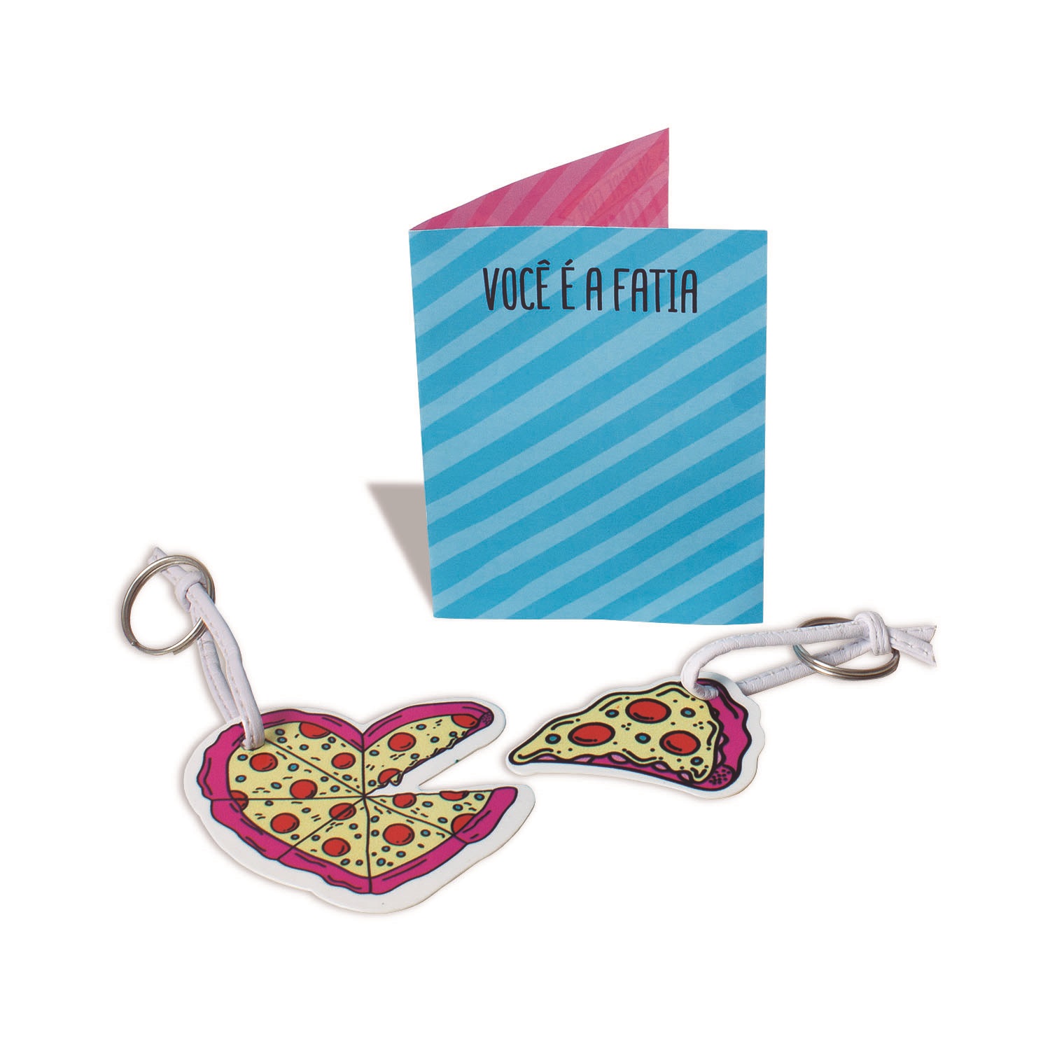 Você pode presentear alguém com um chaveiro e ainda escrever uma mensagem no cartão. Dimensões das Peças: Pizza: 7 x 0,6 x 6,5 cm, Fatia Pizza: 5 x 0,6 x 3,5 cm Imagens meramente ilustrativas.
