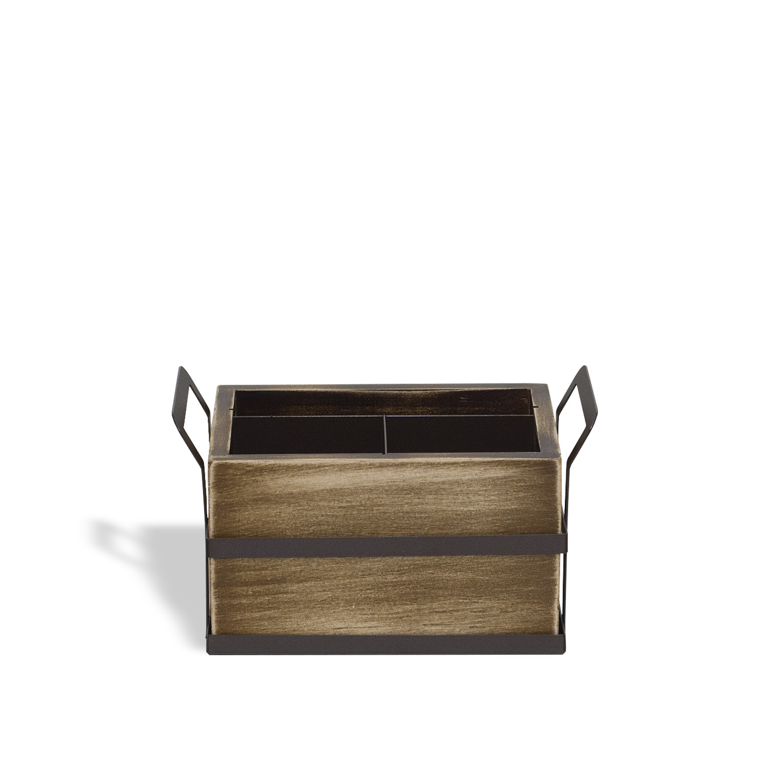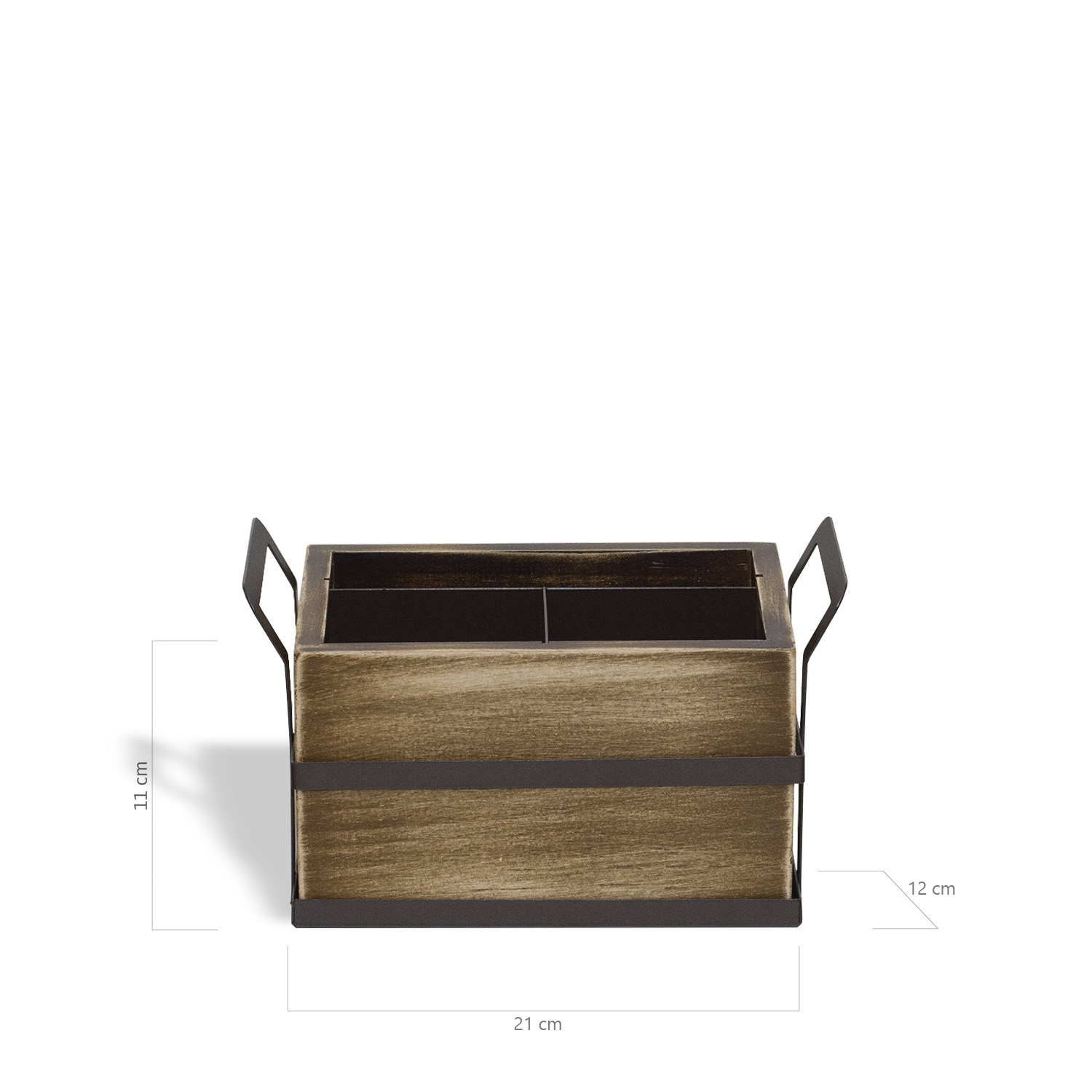 Apresenta toda a beleza do aço recortado e da madeira com pintura rústica, com suas variações de tonalidades que levam para a sua casa uma identidade única que esbanja charme e autenticidade. Possui 2 compartimentos para talheres e 1 compatimento para guardanapos. Também pode ser utilizado separadamente, o suporte de aço para colocar o azeite, sal, pimenta e vinagre e a caixa de madeira para os talheres e guardanapos. Produto de aço e madeira certificada de reflorestamento fabricado no Brasil. A Coleção Bistrô é inspirada nos aconchegantes e pequenos restaurantes franceses que servem uma refeição caseira, trabalham com comida, bebidas alcoólicas, chás e cafés, como um bar e restaurante. Reuna os amigos e a família. Os talheres, azeite, saleiro, pimenteiro e vinagre não acompanham o produto.