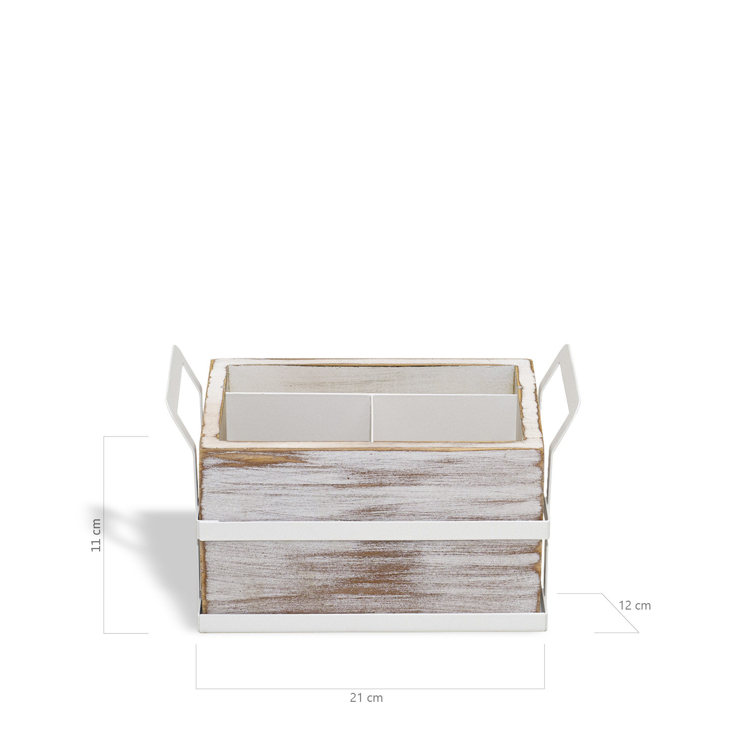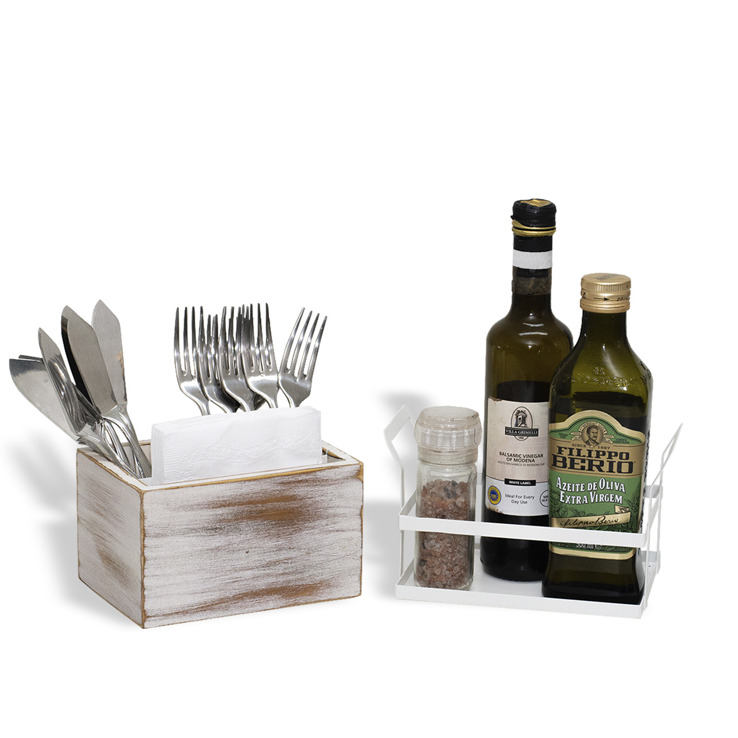 Apresenta toda a beleza do aço recortado e da madeira com pintura provençal, com suas variações de tonalidades que levam para a sua casa uma identidade única que esbanja charme e autenticidade. Possui 2 compartimentos para talheres e 1 compatimento para guardanapos. Também pode ser utilizado separadamente, o suporte de aço para colocar o azeite, sal, pimenta e vinagre e a caixa de madeira para os talheres e guardanapos. Produto de aço e madeira certificada de reflorestamento fabricado no Brasil. A Coleção Bistrô é inspirada nos aconchegantes e pequenos restaurantes franceses que servem uma refeição caseira, trabalham com comida, bebidas alcoólicas, chás e cafés, como um bar e restaurante. Reuna os amigos e a família. Os talheres, azeite, saleiro, pimenteiro e vinagre não acompanham o produto.