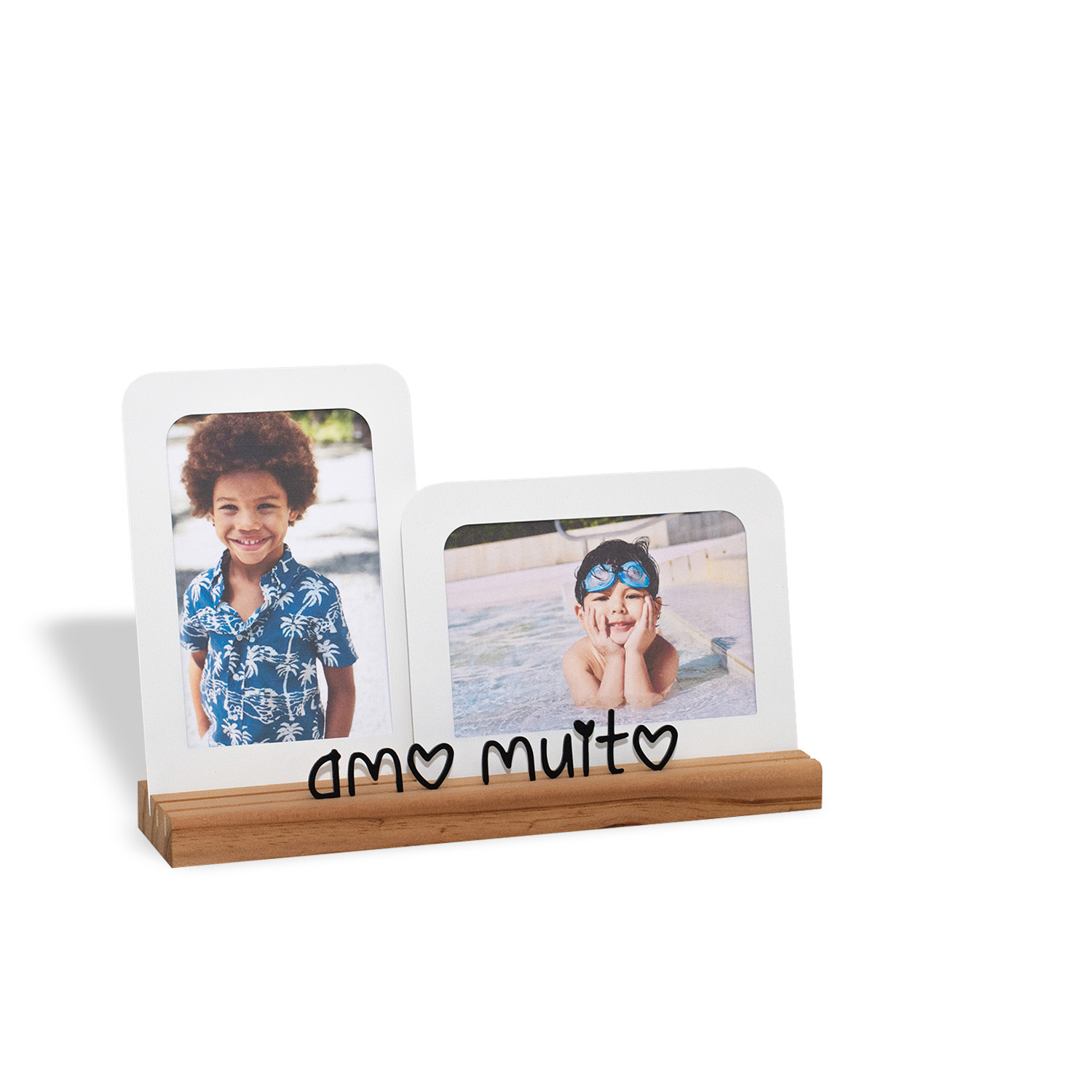 Amo Muito. Para eternizar momentos, presentear e decorar. Para duas fotos 10x15cm, uma na posição horizontal e outra na posição vertical. Produto de aço, acrílico e madeira certificada de reflorestamento fabricado no Brasil. A coleção Amor é inspirada nesse sentimento afetivo que faz com que uma pessoa queira o bem de outra. Faça a diferença compartilhando o amor: cuide, respeite, encante, supreenda, presenteie e ame.