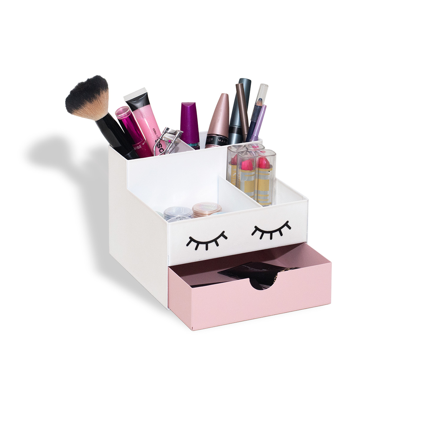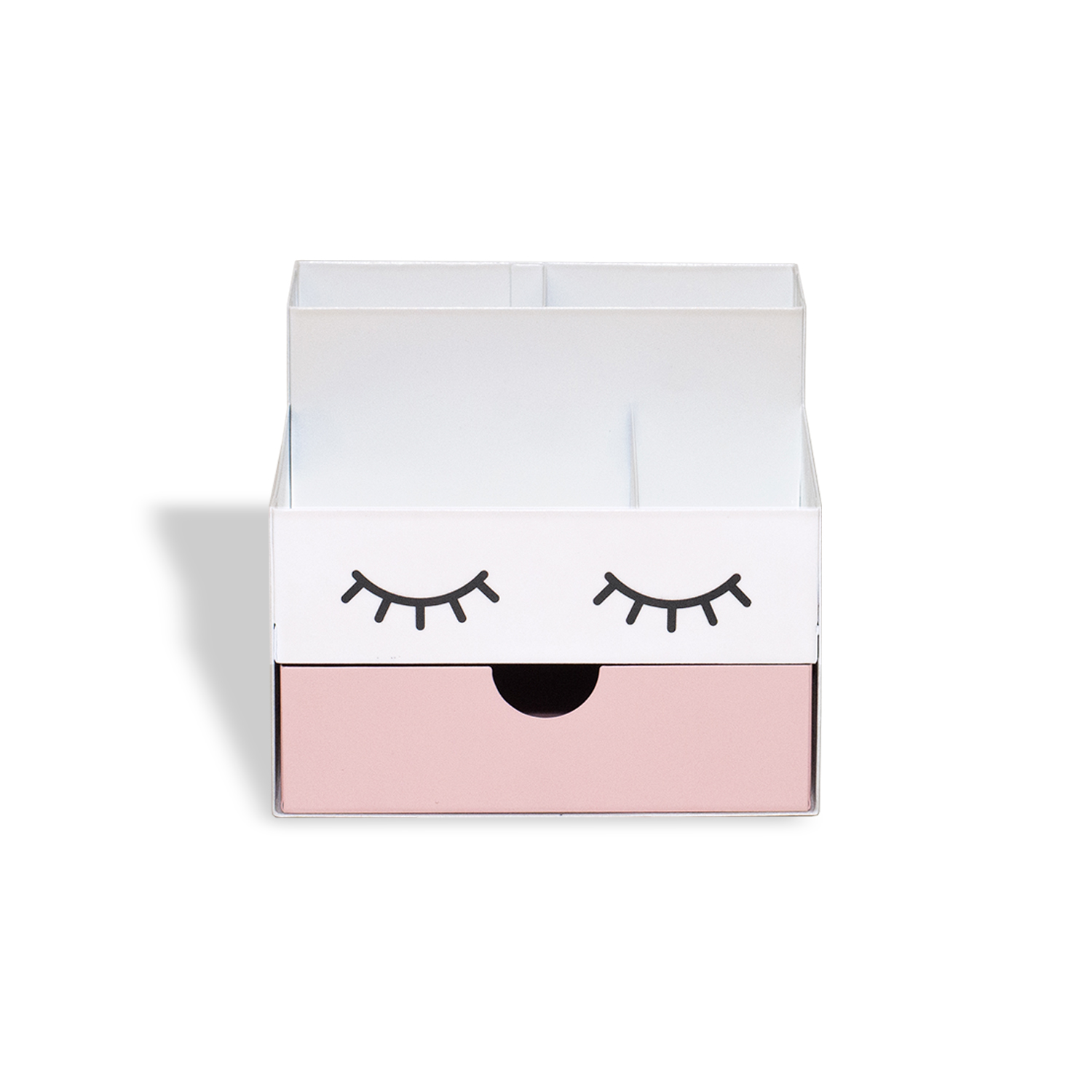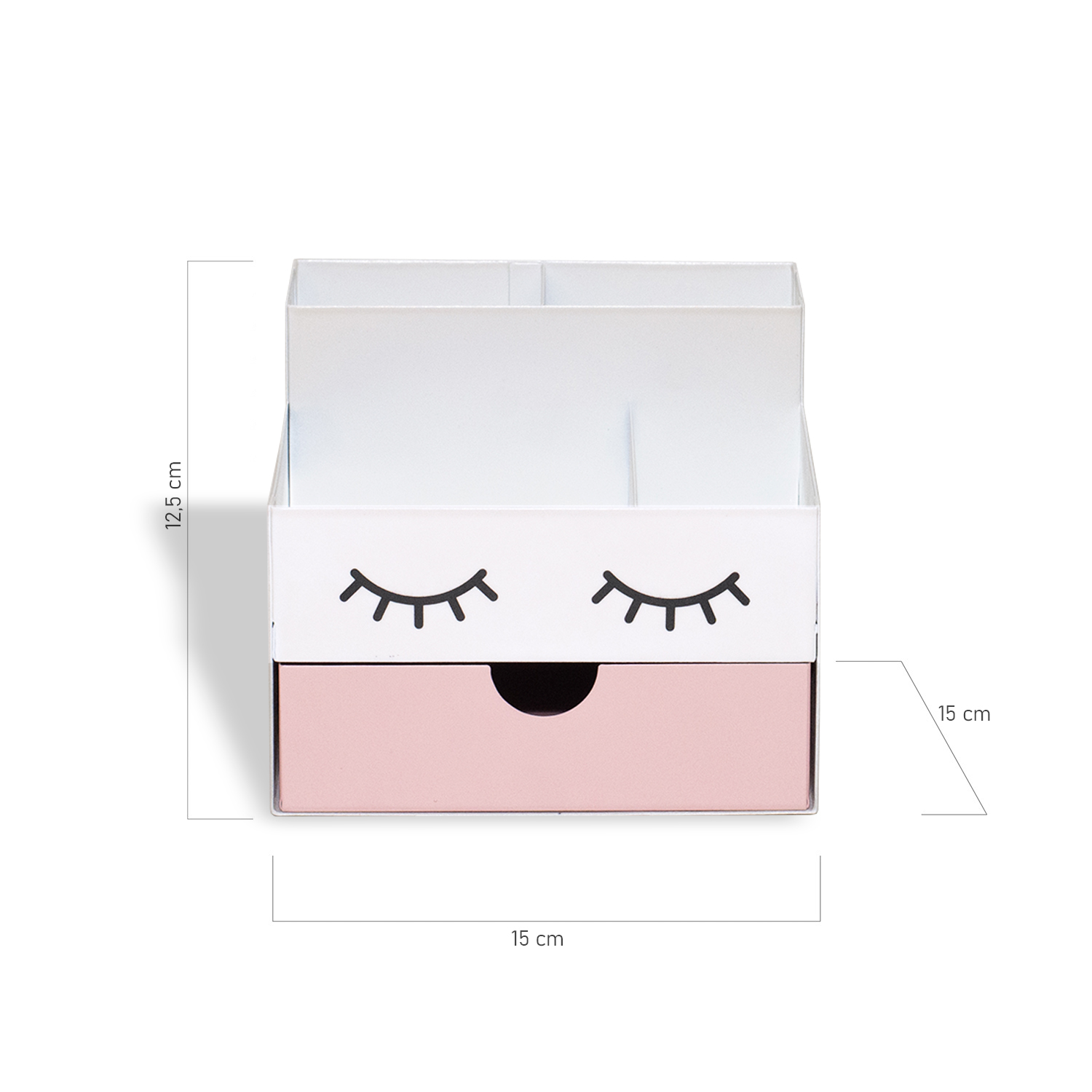 Para organizar de maneira fácil e prática suas maquiagens: rímel, lápis, pincéis, batons... Produto de aço com dois compartimentos e uma gaveta, fabricado no Brasil. A Coleção Beauty é inspirada em meninas sonhadoras apaixonadas por maquiagens e acessórios, que curtem moda e beleza, arrasam no look e são uma inspiração para outras meninas. Também pode ser utilizado como porta lápis, porta caneta, porta controle, porta escova de cabelo. Dê de presente para uma princesa. Os pincéis e maquiagens não acompanham o produto.