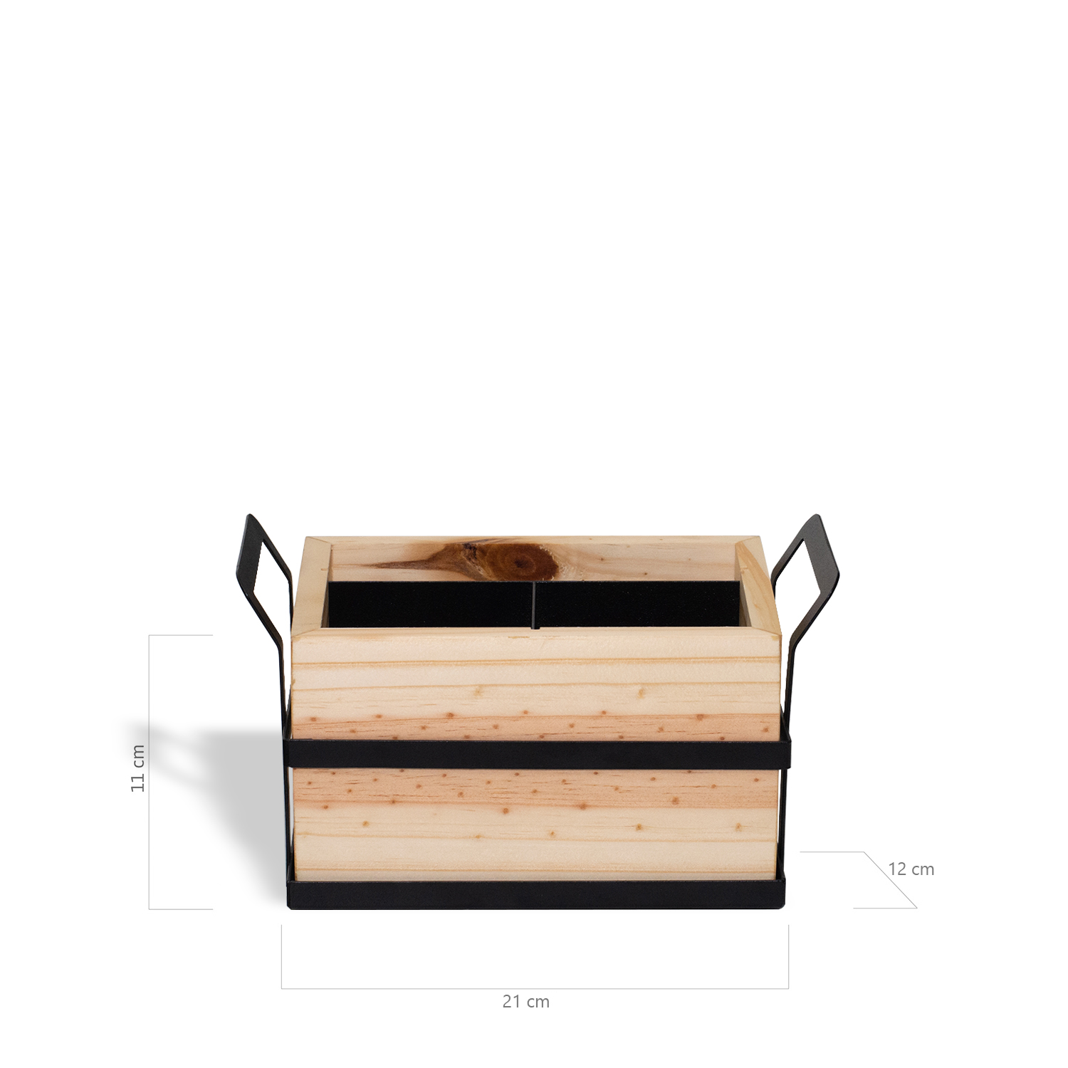 Apresenta toda a beleza do aço recortado e da madeira com suas variações de tonalidades e veios que levam para a sua casa uma identidade única que esbanja charme e autenticidade. Possui 2 compartimentos para talheres e 1 compatimento para guardanapos. Também pode ser utilizado separadamente, o suporte de aço para colocar o azeite, sal, pimenta e vinagre e a caixa de madeira para os talheres e guardanapos. Produto de aço e madeira fabricado no Brasil. A Coleção Bistrô é inspirada nos aconchegantes e pequenos restaurantes franceses que servem uma refeição caseira, trabalham com comida, bebidas alcoólicas, chás e cafés, como um bar e restaurante. Reuna os amigos e a família. Os talheres e guardanapos não acompanham o produto.