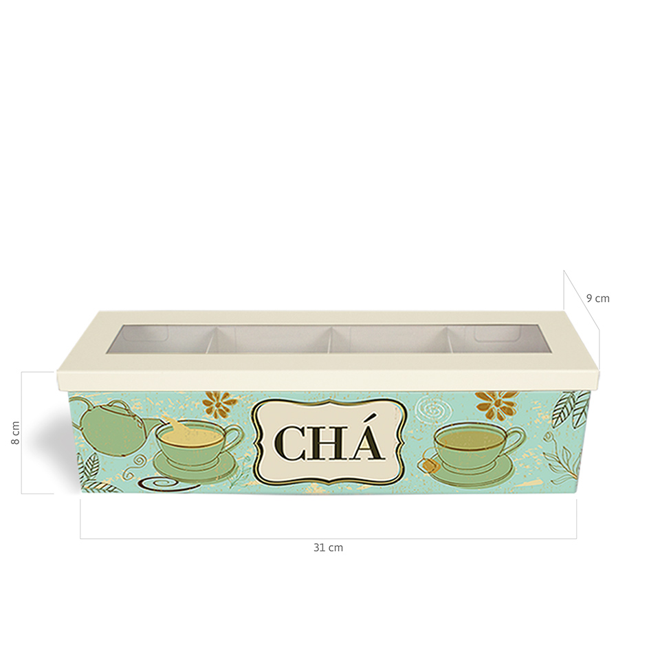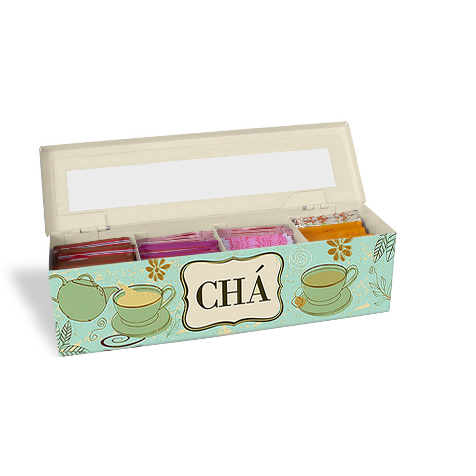Para organizar sachês de chá e decorar. Caixa com 3 divisórias para melhor visualizar os sachês de chá, visor transparente e tampa com dobradiças. Produto de aço fabricado no Brasil. A Coleção Bistrô é inspirada nos aconchegantes e pequenos restaurantes franceses que servem uma refeição caseira, trabalham com comida, bebidas alcoólicas, chás e cafés, como um bar e restaurante. Sugestão de presente para a mãe, filha, irmã, avó, neta, tia, dinda, sogra, cunhada, amiga. Os sachês de chá não acompanham o produto.