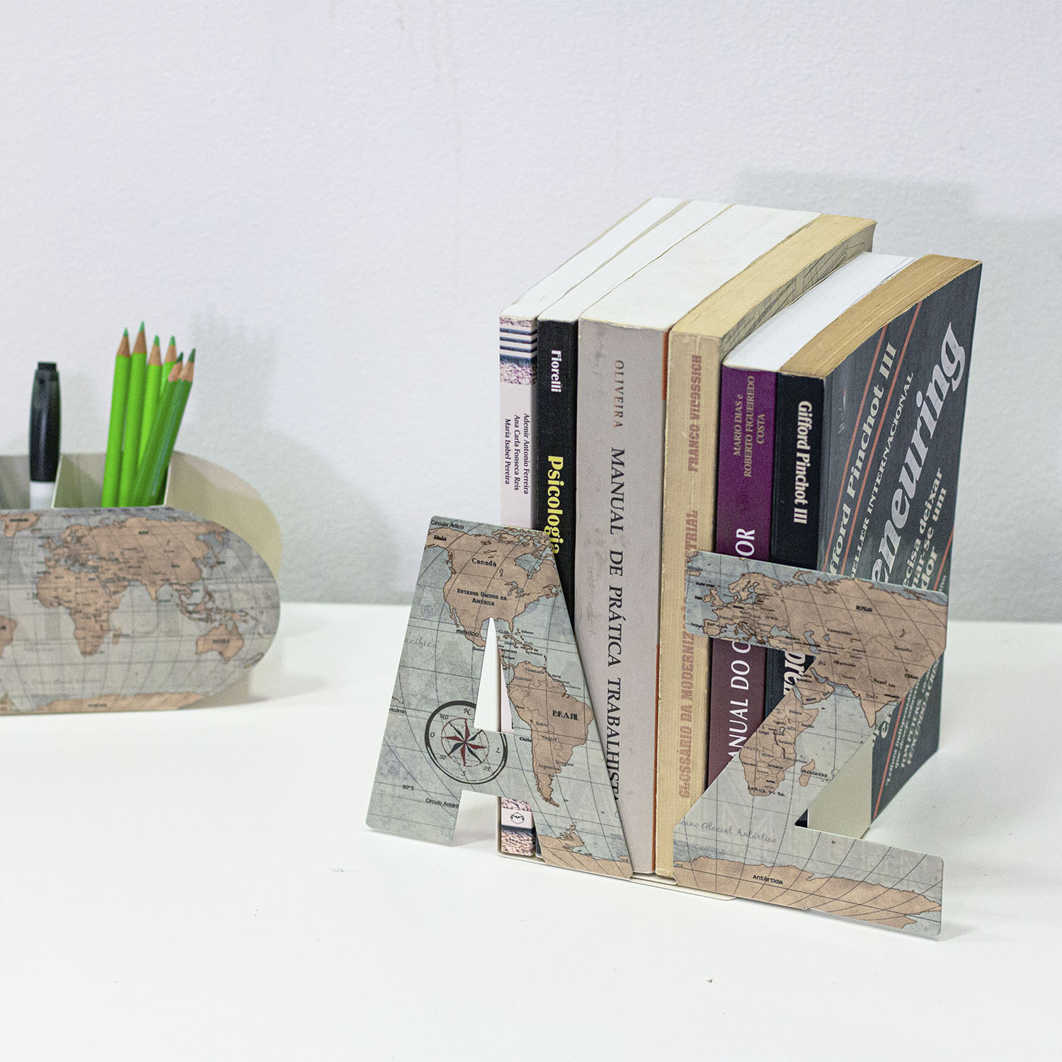 De A à Z organize seus livros preferidos com o charme do aço recortado com a estampa mapa mundi vintage. Produto fabricado no Brasil. Porque viajar é trocar a roupa da alma, apurar os sentidos, abrir os horizontes, pintar o mundo com novas cores, e desafiar os nossos limites. Vamos viajar, estudar, explorar o mundo. Os livros não acompanham o produto.