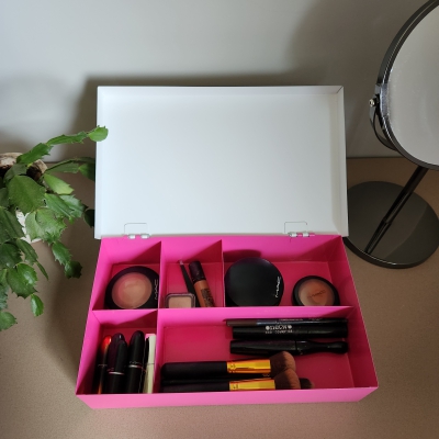 Caixa com divisórias internas para organizar de maneira fácil e prática maquiagens: rímel, lápis, pó, base, sombras, pincéis, batons. A tampa abre com dobradiças. Produto de aço fabricado no Brasil. A Coleção Beauty é inspirada nas mulheres apaixonadas por maquiagens e acessórios, que curtem moda e beleza, arrasam no look e são uma inspiração para outras mulheres. Sugestão de presente para quem ama maquiagem. As maquiagens e acessórios não acompanham o produto.
