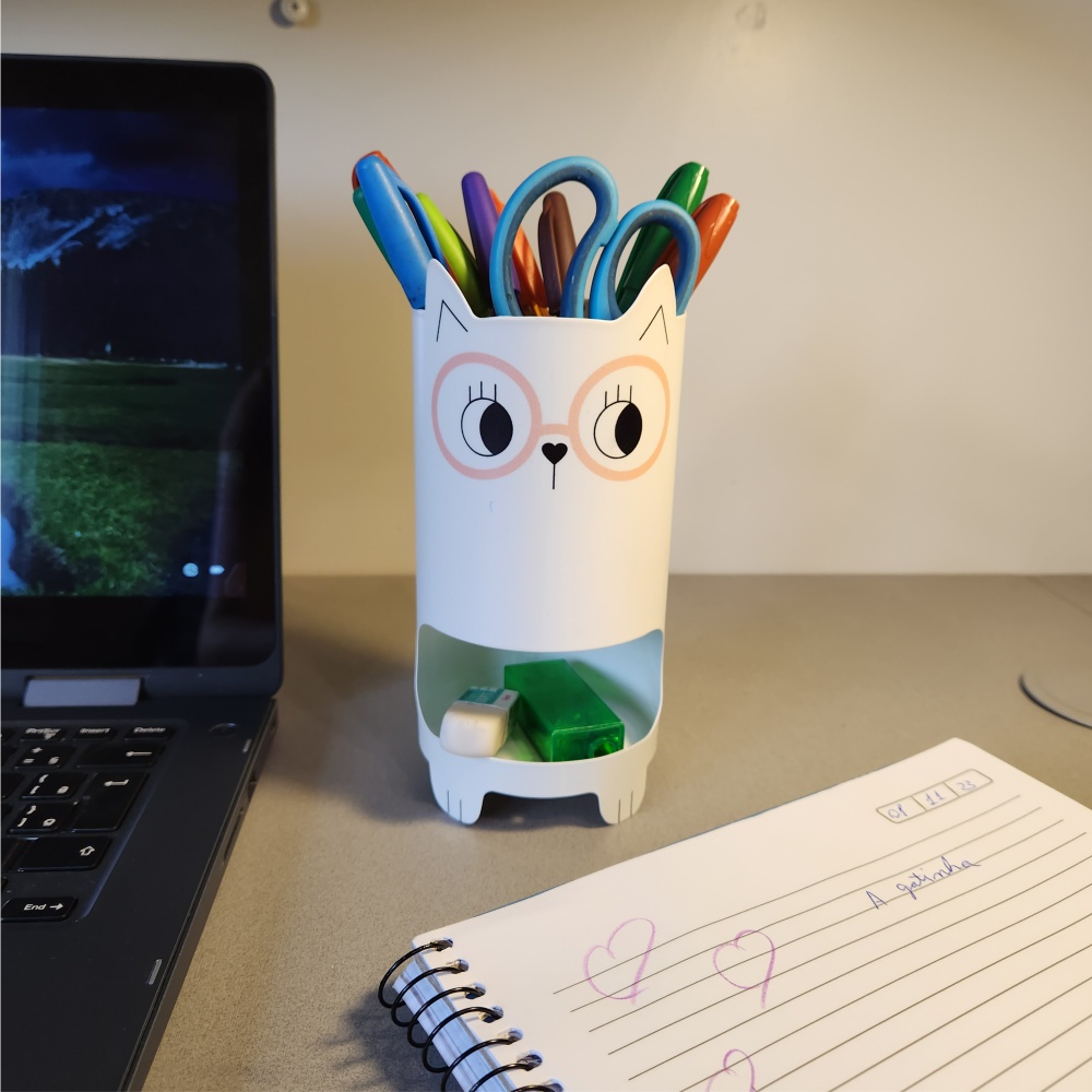 Para gatinhas, organizarem e decorarem a mesa de trabalho. O formato torre possibilita colocar clips, borracha, apontador na parte de baixo do porta caneta, lápis, caneta e tesoura na parte de cima. Também pode ser utilizado para colocar pincéis de maquiagem, escova de cabelo, tic-tac e grampos na parte de baixo. Produto de aço fabricado no Brasil. Todo dia é dia de se divertir! Em qualquer hora e em qualquer lugar! Então, por que não decorar os nossos ambientes com produtos que além de funcionais e práticos sejam divertidos? Sugestão de presente para meninas. Os lápis, clips não acompanham o produto.