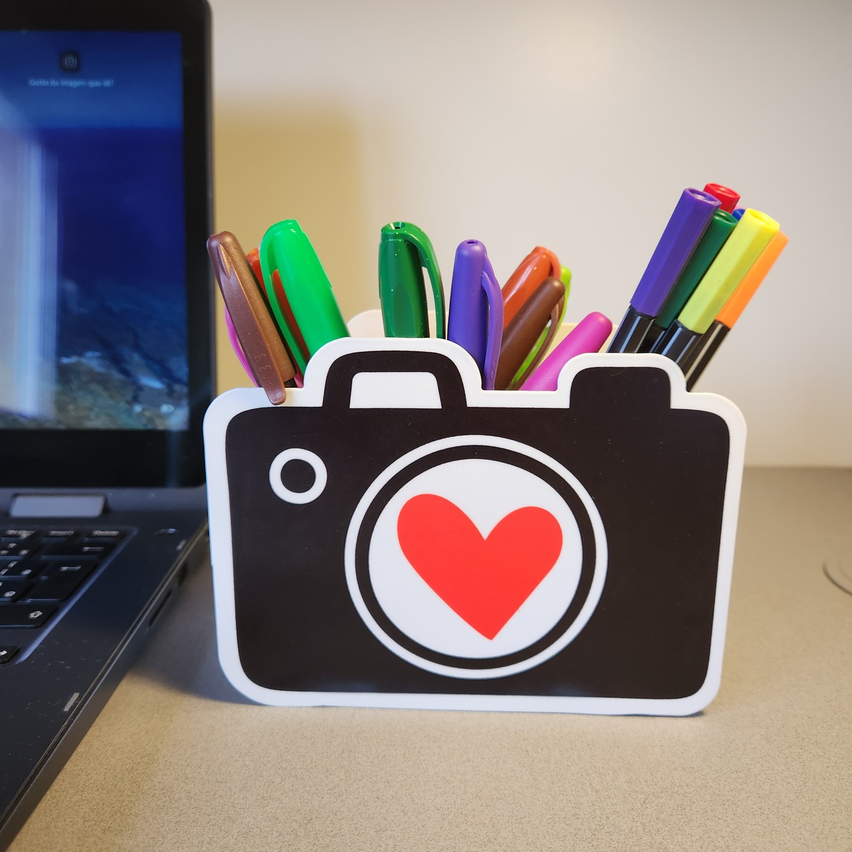 Em formato de câmera fotográfica, esse porta caneta de aço organiza e decora a mesa de trabalho de forma romântica e divertida. A coleção Amor é inspirada nesse sentimento afetivo que faz com que uma pessoa queira o bem de outra. Faça a diferença compartilhando o amor: cuide, respeite, encante, supreenda, presenteie e ame. Os lápis, canetas, tesoura não acompanham o produto.
