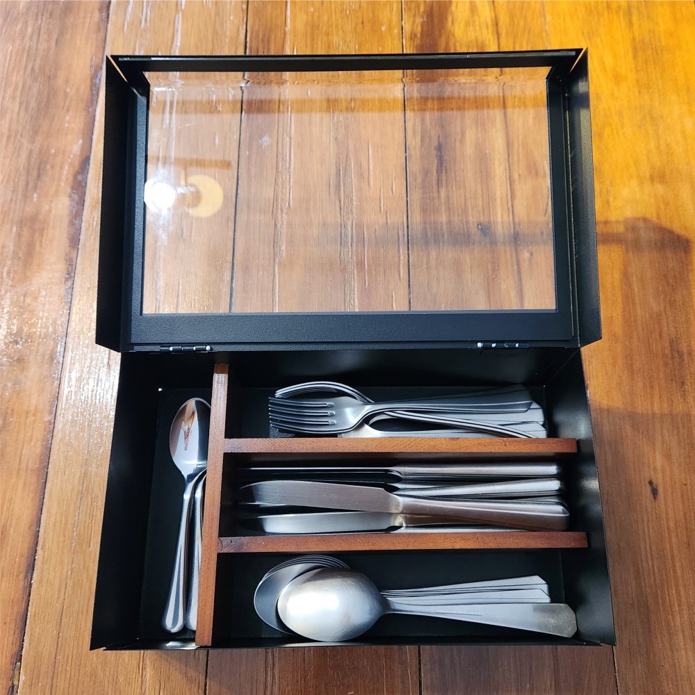 Capacidade: aproximadamente 8 garfos, 8 facas, 8 colheres, 8 colheres de sobremesa.