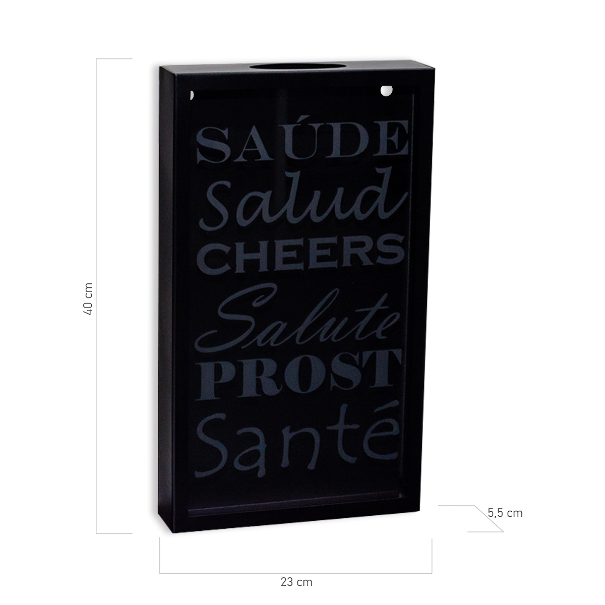 Saúde, Salud, Cheers, Salute, Prost, Santé. Para colocar as rolhas dos vinhos que bebemos dentro do quadro porta rolhas, para decorar e recordar bons momentos. Produto de aço e vidro fabricado no Brasil. Para fixar em parede de alvenaria com os parafusos e buchas que acompanham o produto. A Coleção Happy Hour é uma celebração à vida. A vida não é só para ser vivida. É para ser celebrada. Reuna a família e os amigos. As rolhas não acompanham o produto.