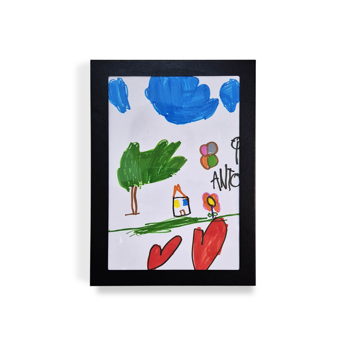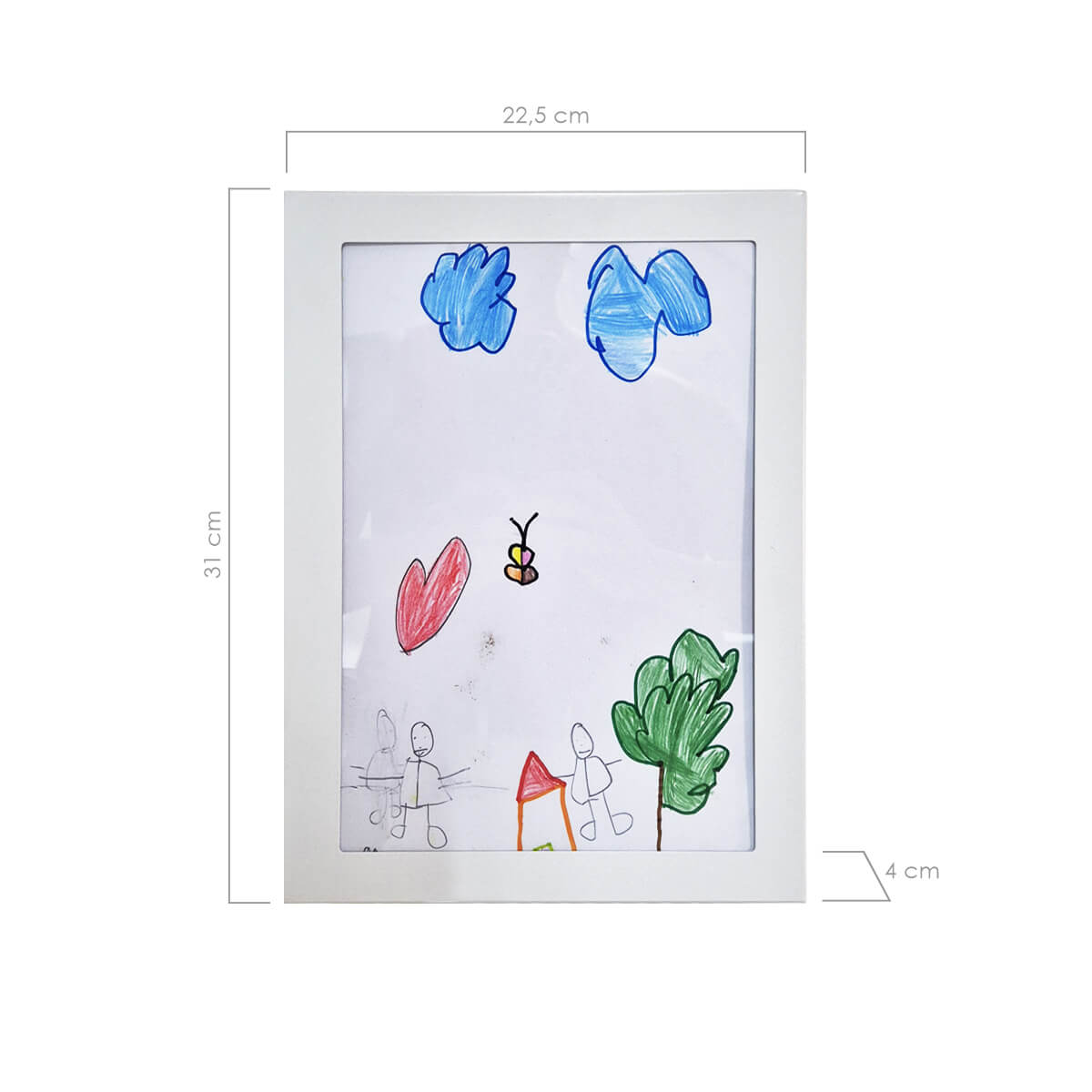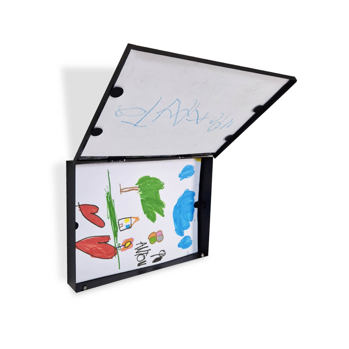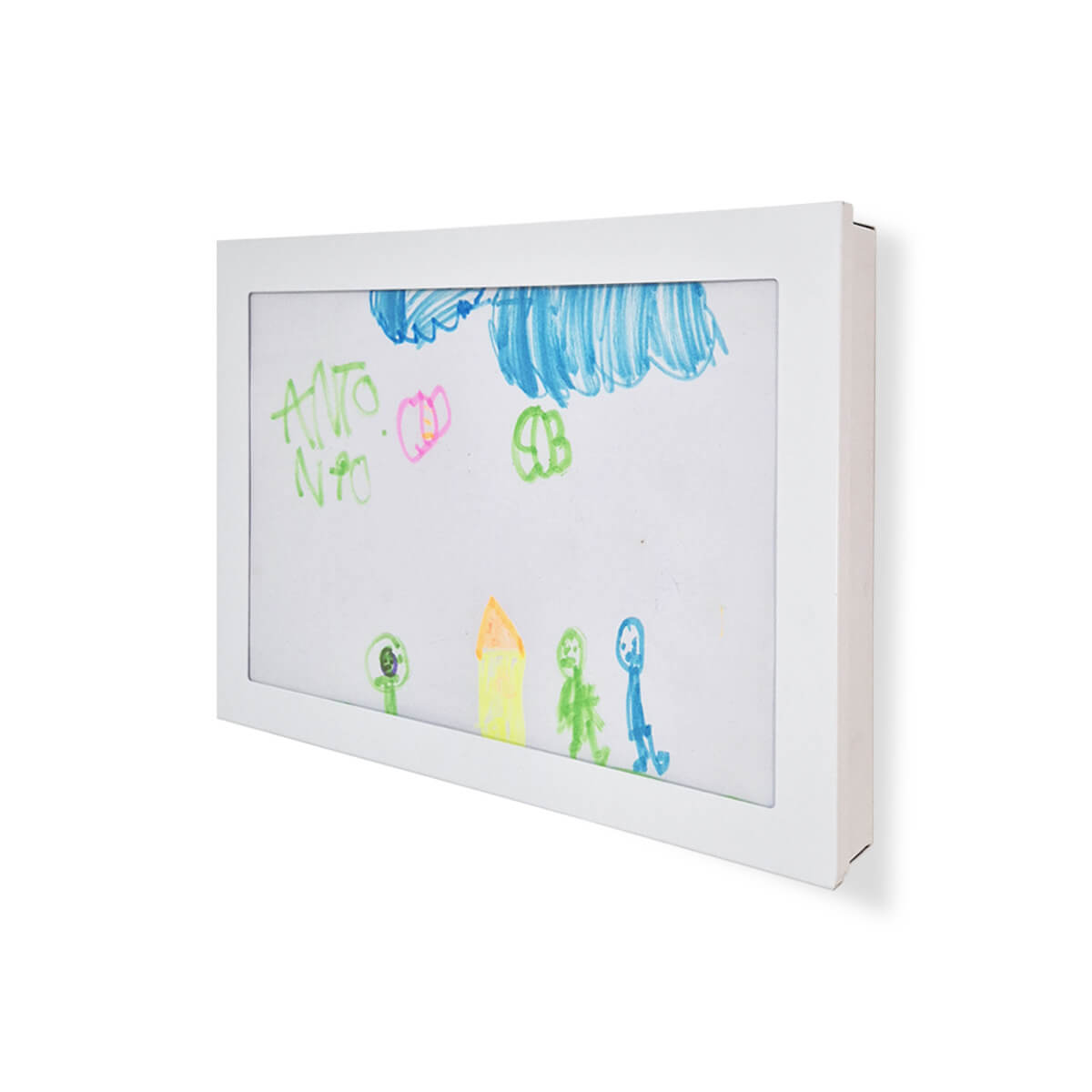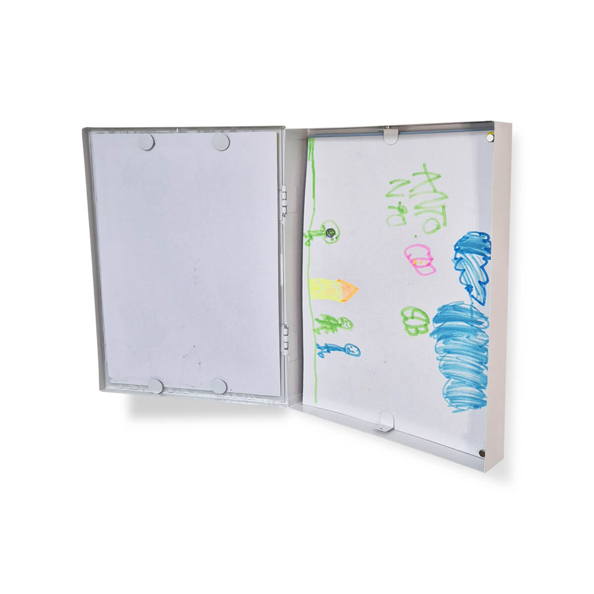 Para guardar os desenhos das crianças nesse incrível quadro caixa, ficando sempre um desenho em evidência, na parede. Para decorar, lembrar e inspirar. Produto de aço fabricado no Brasil. Para fixar em parede de alvenaria com os parafusos e buchas que acompanham o produto. Também acompanham 6 ímãs para prender os desenhos no fundo do quadro.