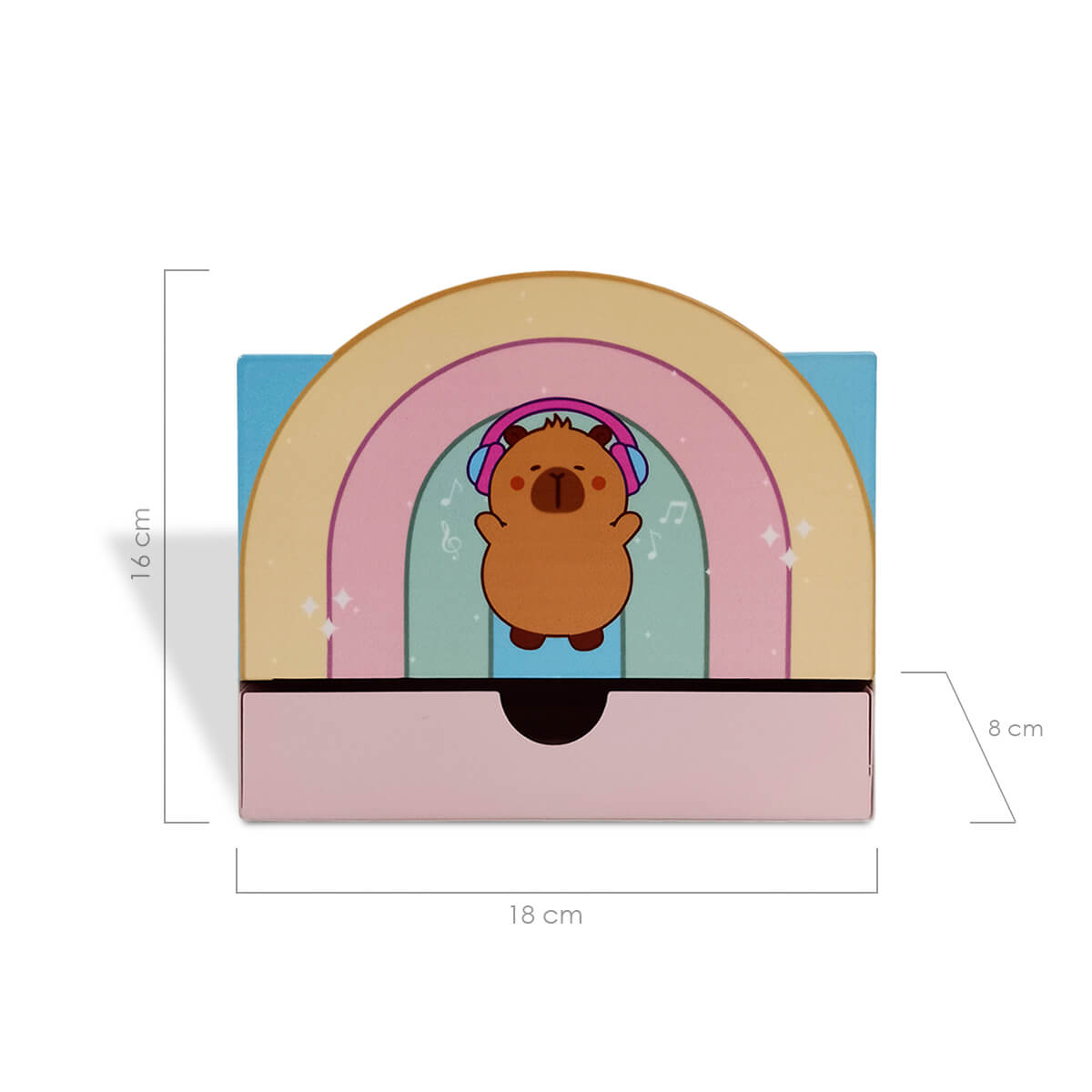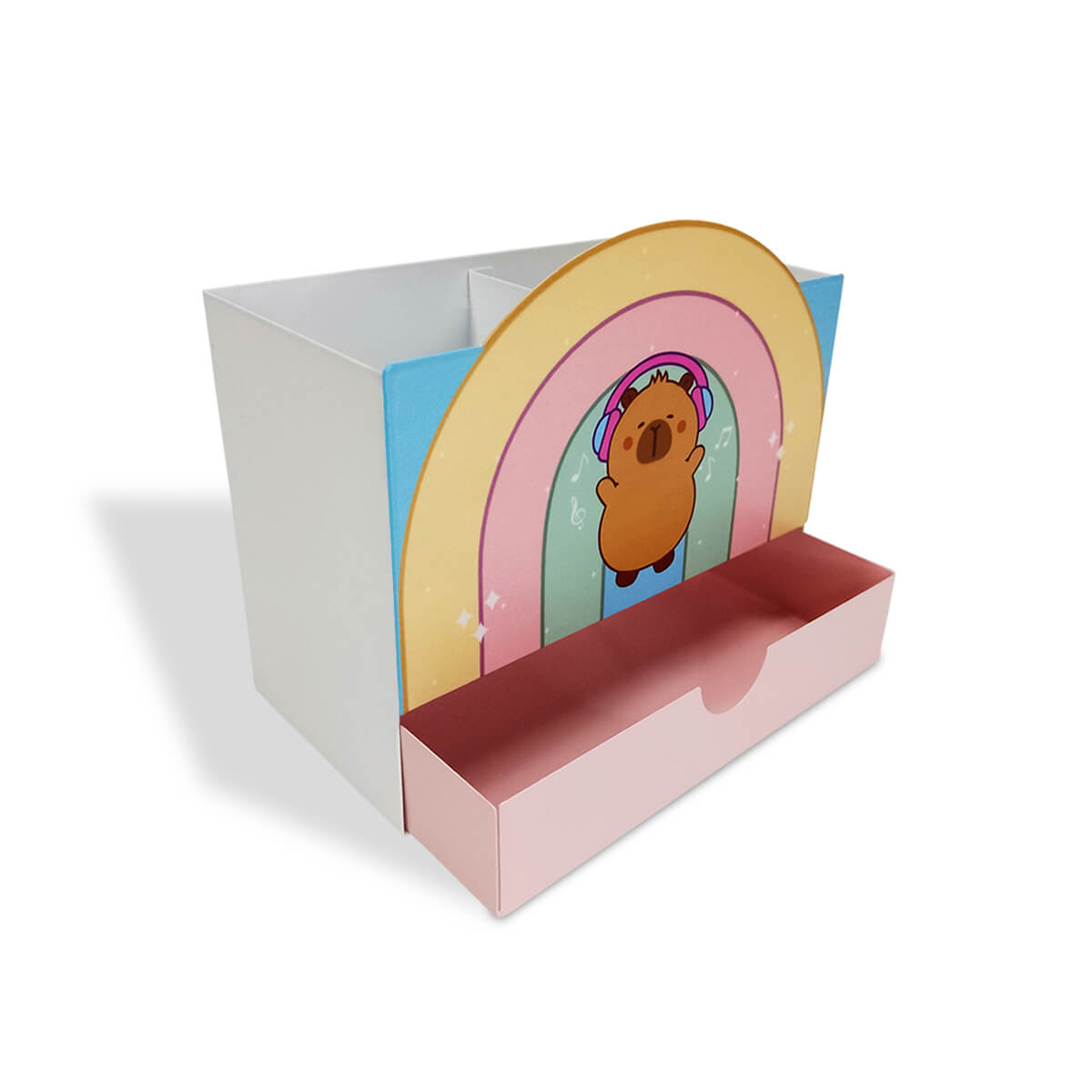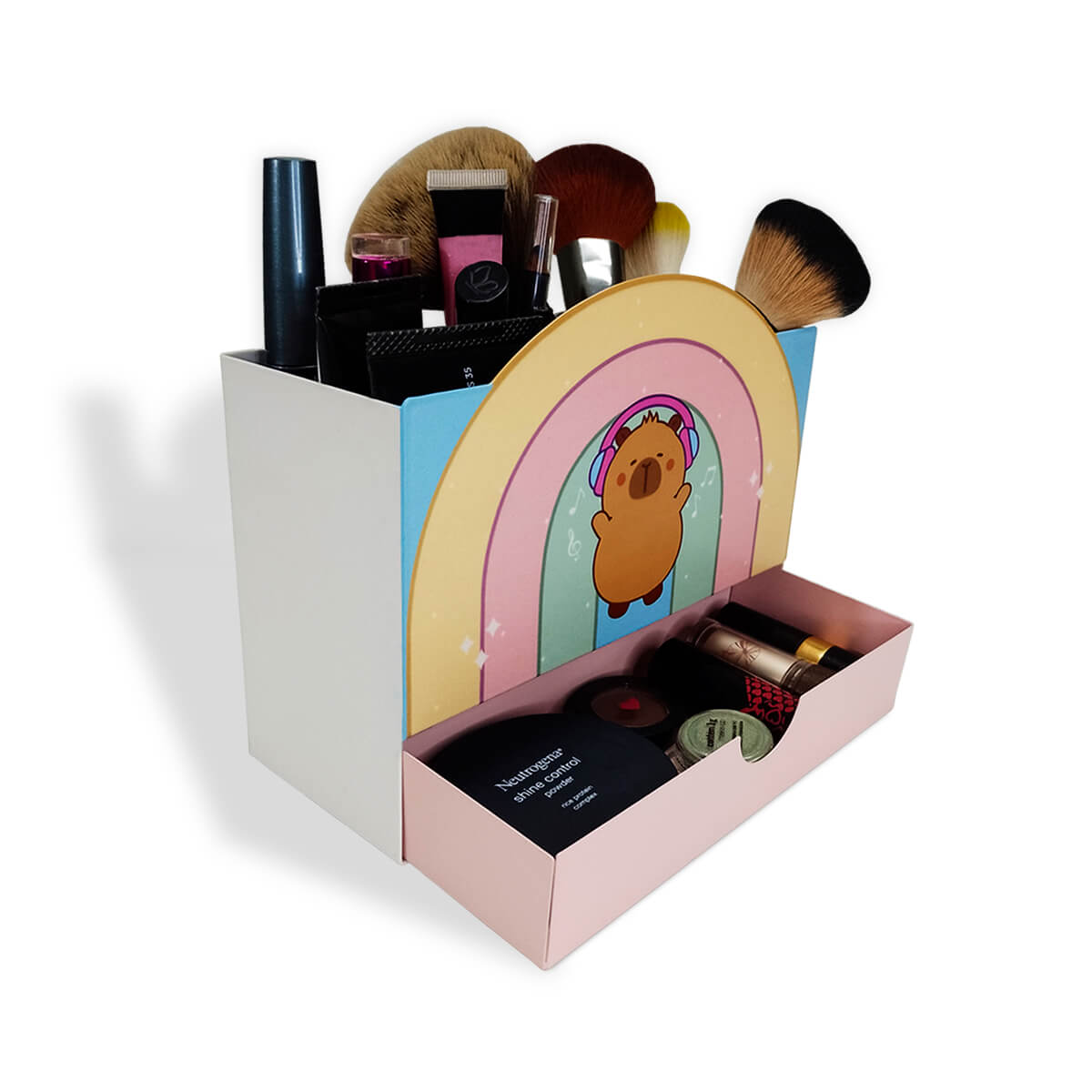 Para organizar de maneira fácil e prática suas maquiagens: rímel, lápis, pincéis, batons... Também pode ser utilizada para organizar sua mesa de estudos: lápis, canetas, tesoura... Produto de aço, no formato de capivara, com dois compartimentos e uma gaveta, fabricado no Brasil. Todo dia é dia de se divertir! Em qualquer hora e em qualquer lugar! Então, por que não decorar os nossos ambientes com produtos que além de funcionais e práticos sejam divertidos? Os acessórios não acompanham o produto.