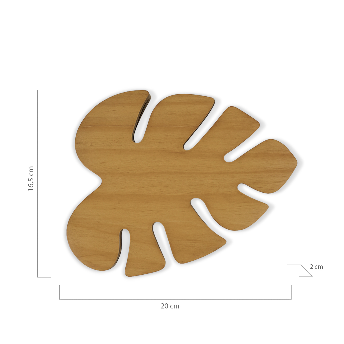 Descanso de panela, suporte de panela ou porta panela, no formato de uma folha da planta costela de Adão. Para colocar a panela quente em cima. Produto de madeira fabricado no Brasil. A coleção Floresta Urbana decora e traz um pouco da natureza para o seu dia-a-dia. A panela não acompanha o produto.