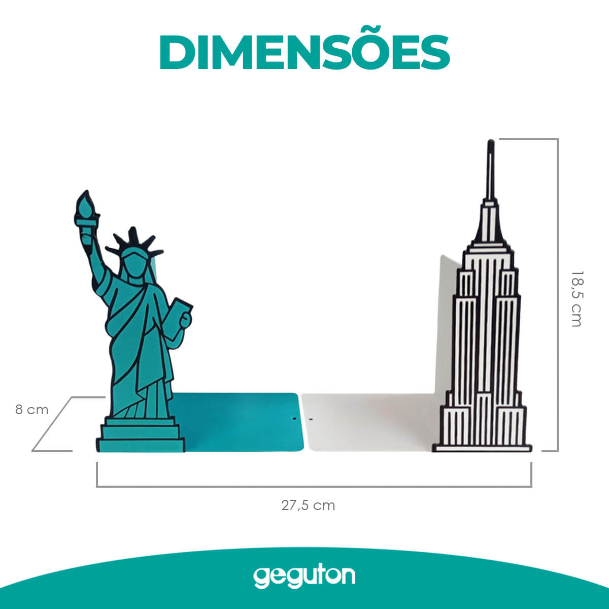 Para decorar e organizar livros com os ícones NY, o famoso Empire State Building e a Estátua da Liberdade. Produto de aço carbono com pintura epóxi. Fabricado no Brasil. Porque viajar é trocar a roupa da alma, apurar os sentidos, abrir os horizontes, pintar o mundo com novas cores, e desafiar os nossos limites. Vamos viajar, estudar, explorar o mundo. Para quem ama viajar e fãs de NY. Os livros não acompanham o produto.