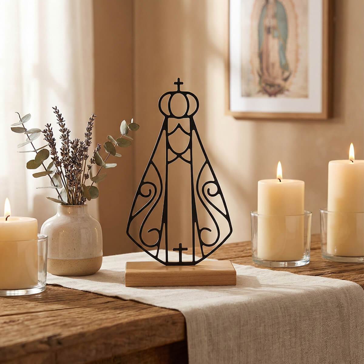 Escultura no formato da Nossa Senhora Aparecida, padroeira do Brasil. Produto de aço carbono com pintura epóxi e madeira de reflorestamento. Fabricado no Brasil. A coleção Amor é inspirada nesse sentimento afetivo que faz com que uma pessoa queira o bem de outra. Faça a diferença compartilhando o amor: cuide, respeite, encante, supreenda, presenteie e ame.