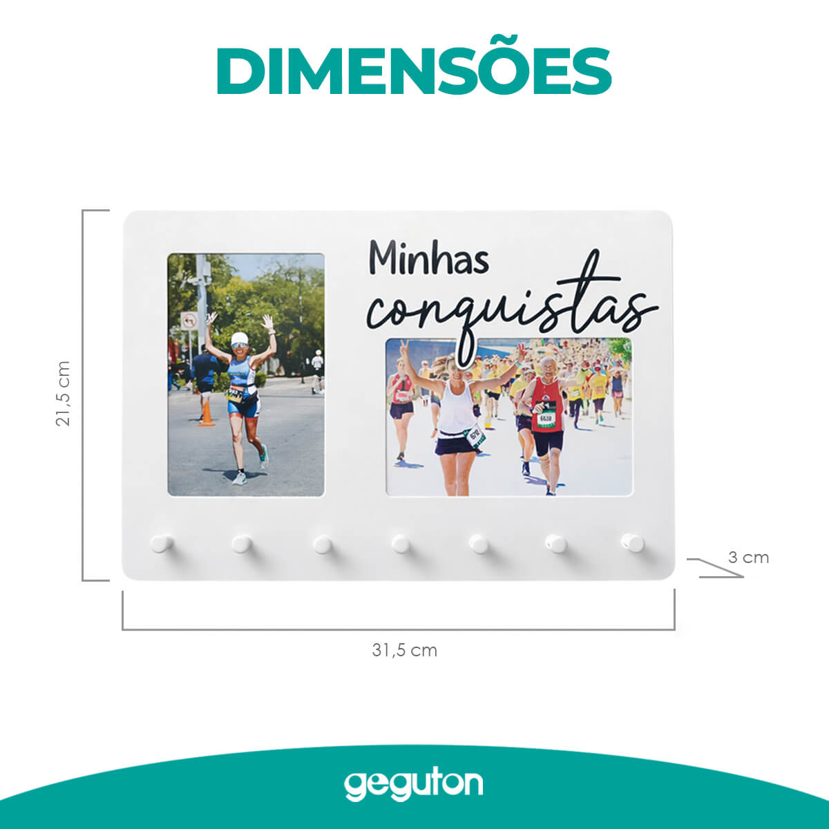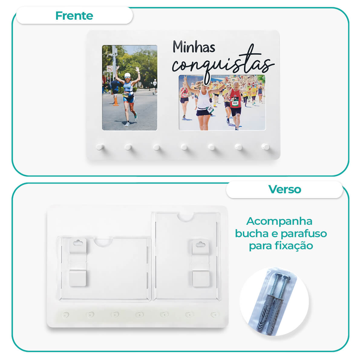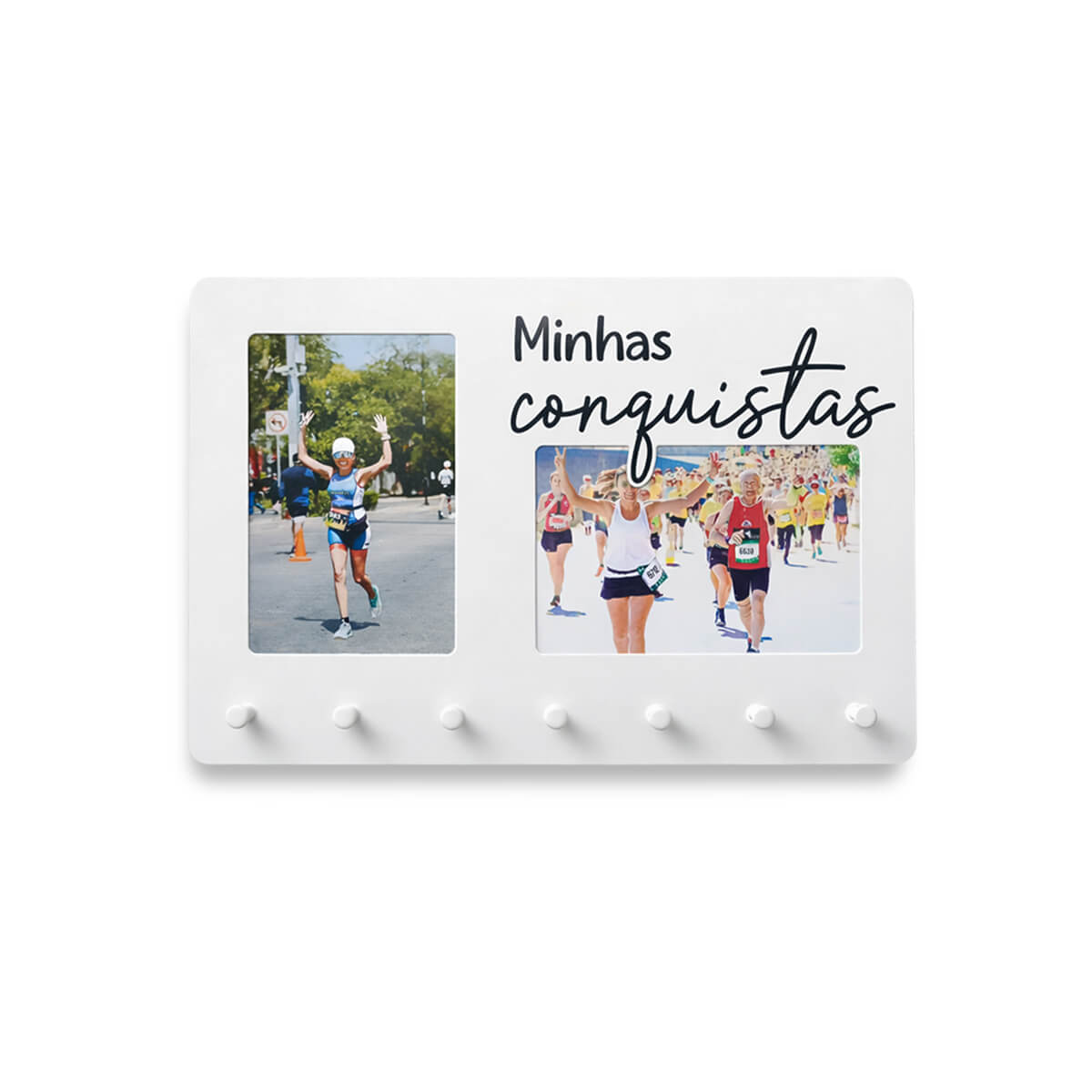 Minhas conquistas. Para eternizar vitórias, presentear e decorar. Para duas fotos 10x15cm, uma na posição vertical e outra na posição horizontal. Possui 7 ganchos para pendurar medalhas. Produto de aço carbono, na cor branco, com escrito preto. Fabricado no Brasil.