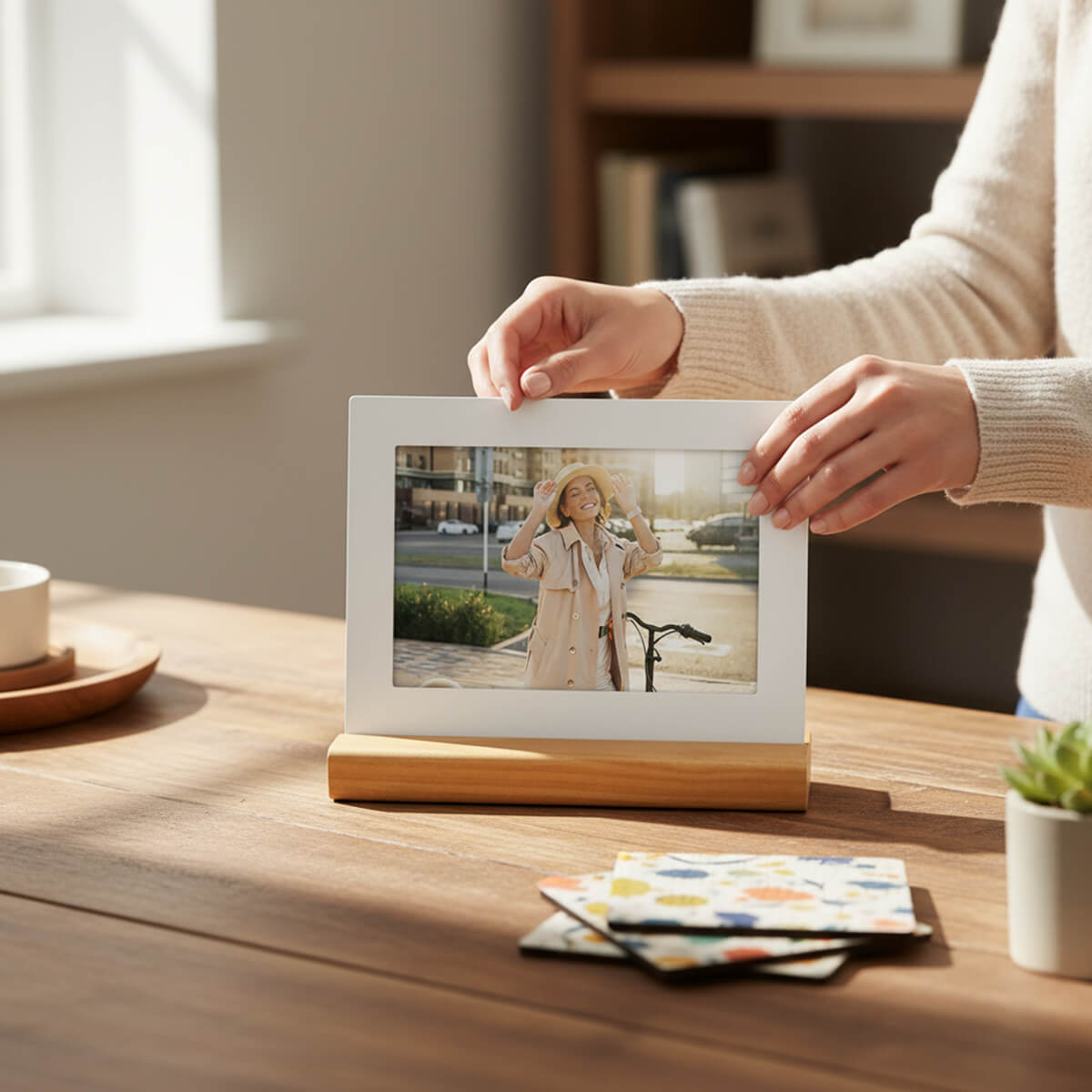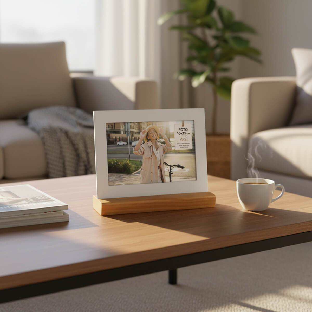 Eternize momentos especiais com este porta-retratos de design clean e contemporâneo. A combinação harmoniosa entre a moldura branca acetinada e a base em madeira natural traz um toque de sofisticação minimalista, perfeito para destacar suas memórias favoritas com leveza e estilo em qualquer ambiente da casa.