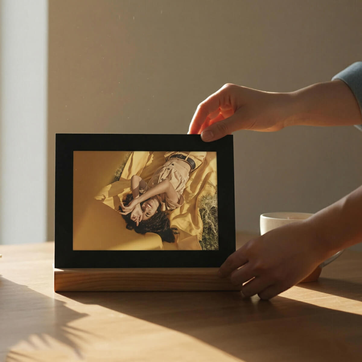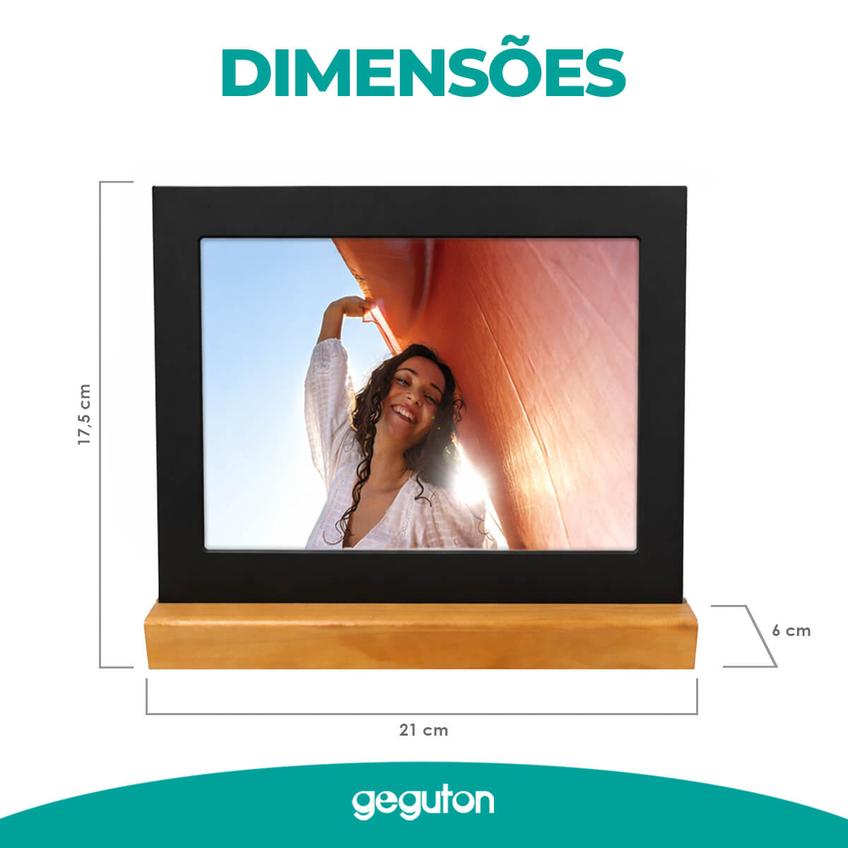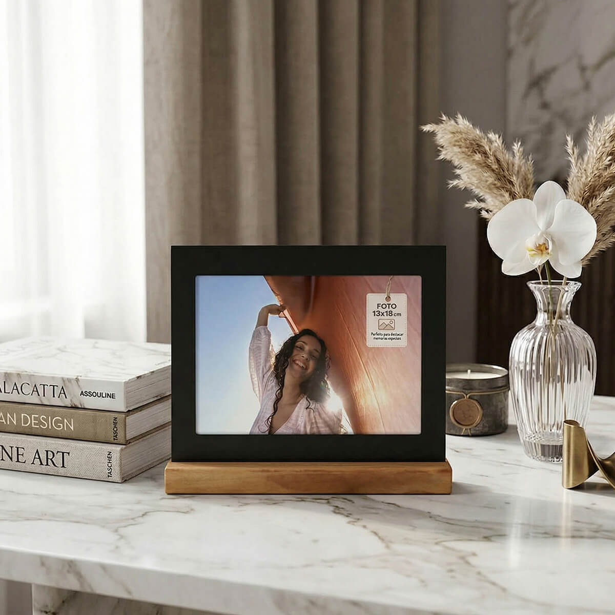 Com uma estética industrial e moderna, este porta-retratos destaca suas fotos através de uma moldura preta fosca imponente. A base em madeira clara cria o contraste perfeito, oferecendo estabilidade e um visual contemporâneo que transforma qualquer registro fotográfico em uma verdadeira peça de arte decorativa para o seu lar ou escritório.