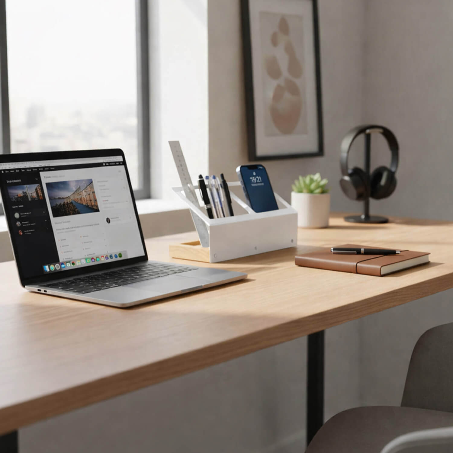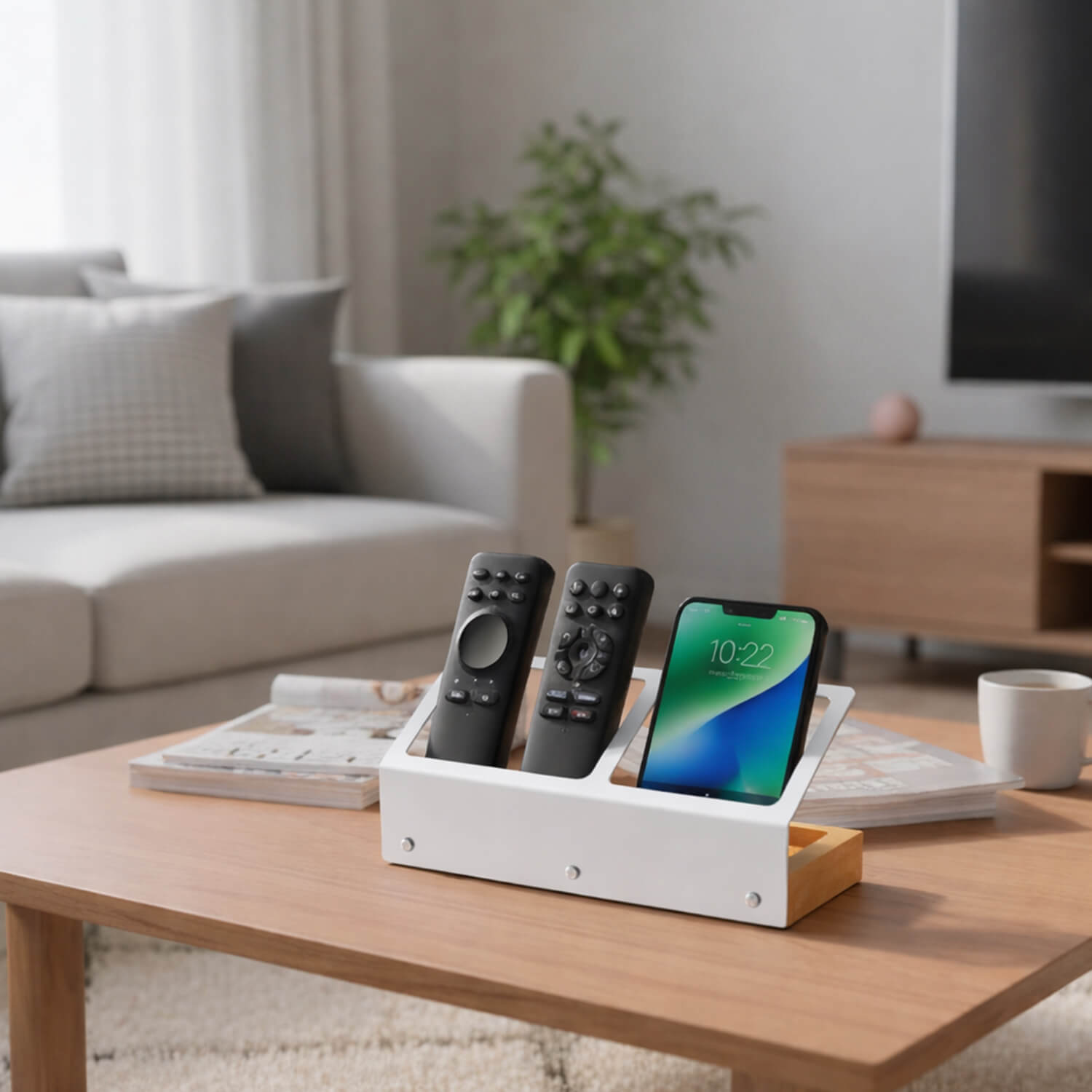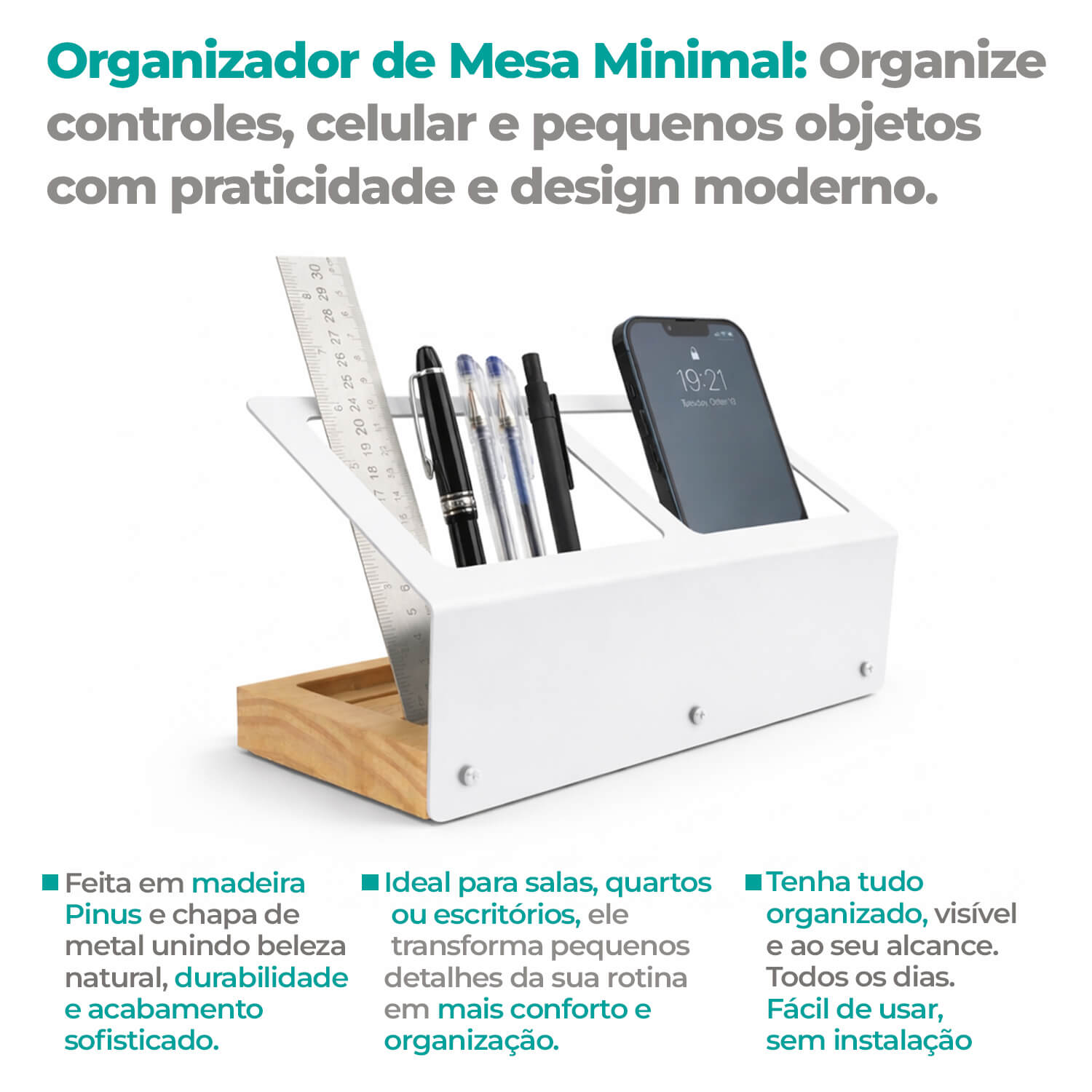 Mantenha sua rotina organizada com elegância e praticidade através deste organizador minimalista de mesa. Unindo o toque acolhedor da madeira com a modernidade do acabamento em metal branco, ele é perfeito para acomodar controles, smartphones e pequenos objetos, transformando o caos em um cenário de harmonia e design funcional para o seu lar.