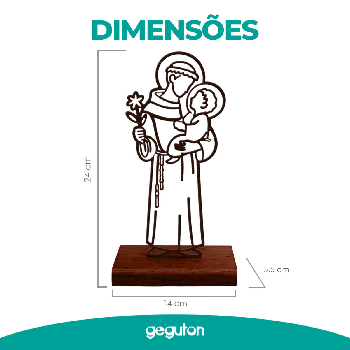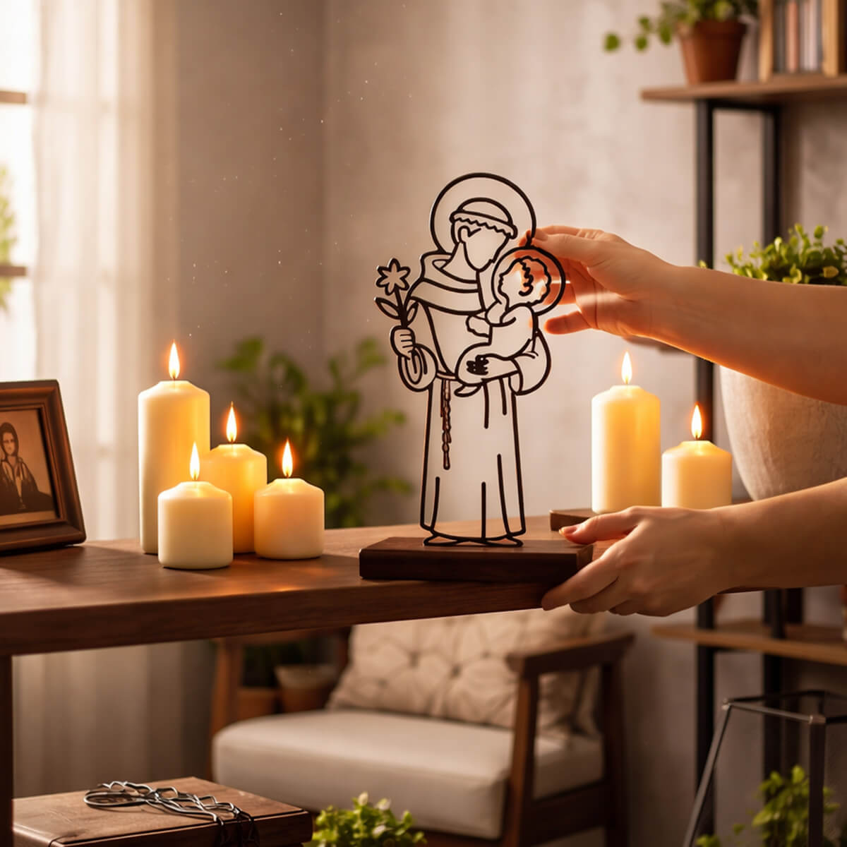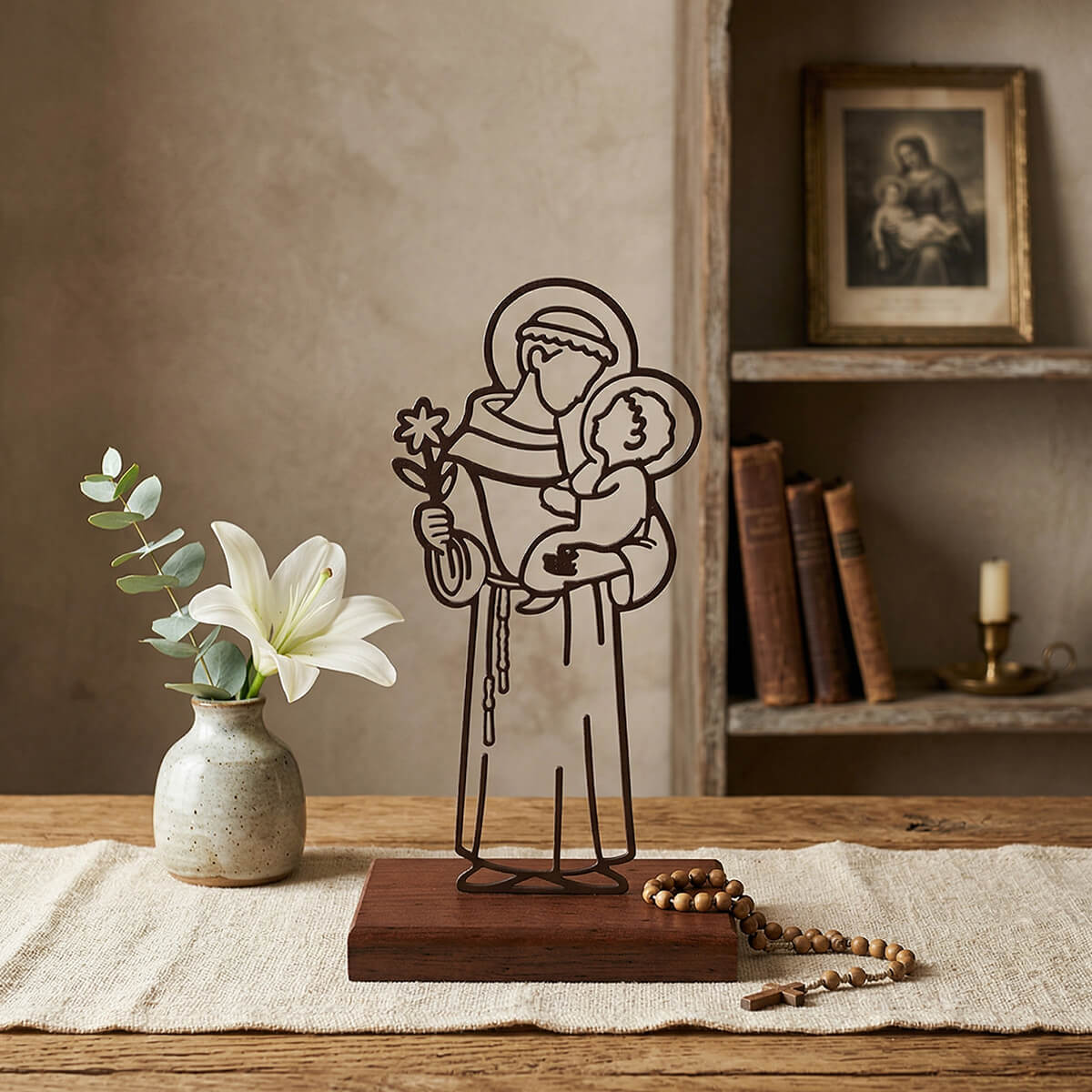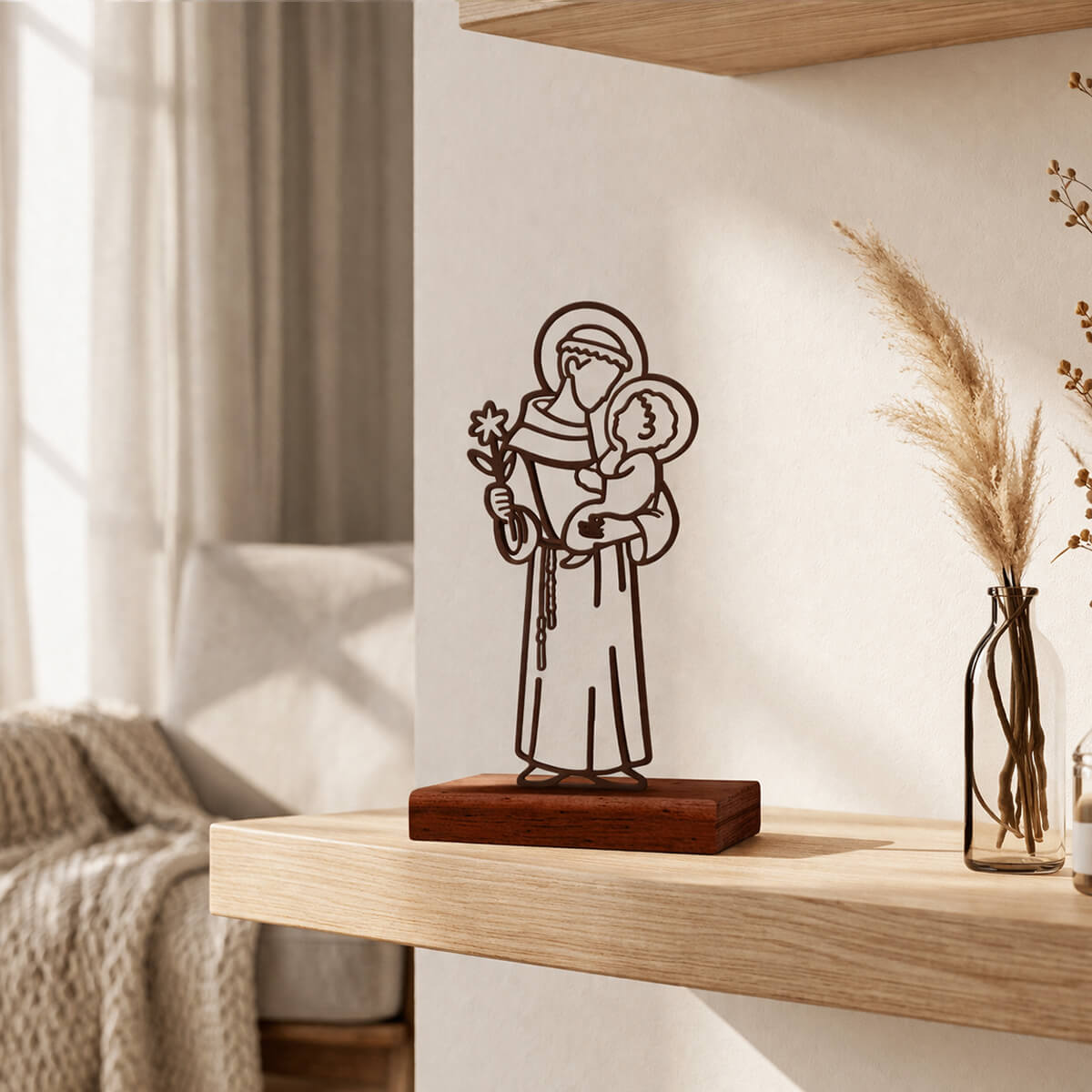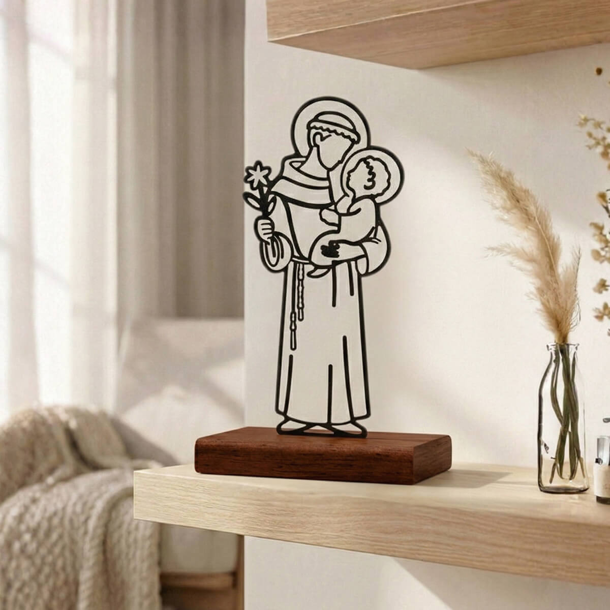 Esta delicada escultura em metal de Santo Antônio com o Menino Jesus une espiritualidade e design minimalista em uma peça única. Com traços fluidos e base em madeira natural, ela traz uma atmosfera de proteção, fé e serenidade para o lar. Perfeita para quem busca expressar sua devoção com elegância e sofisticação em pequenos detalhes decorativos.