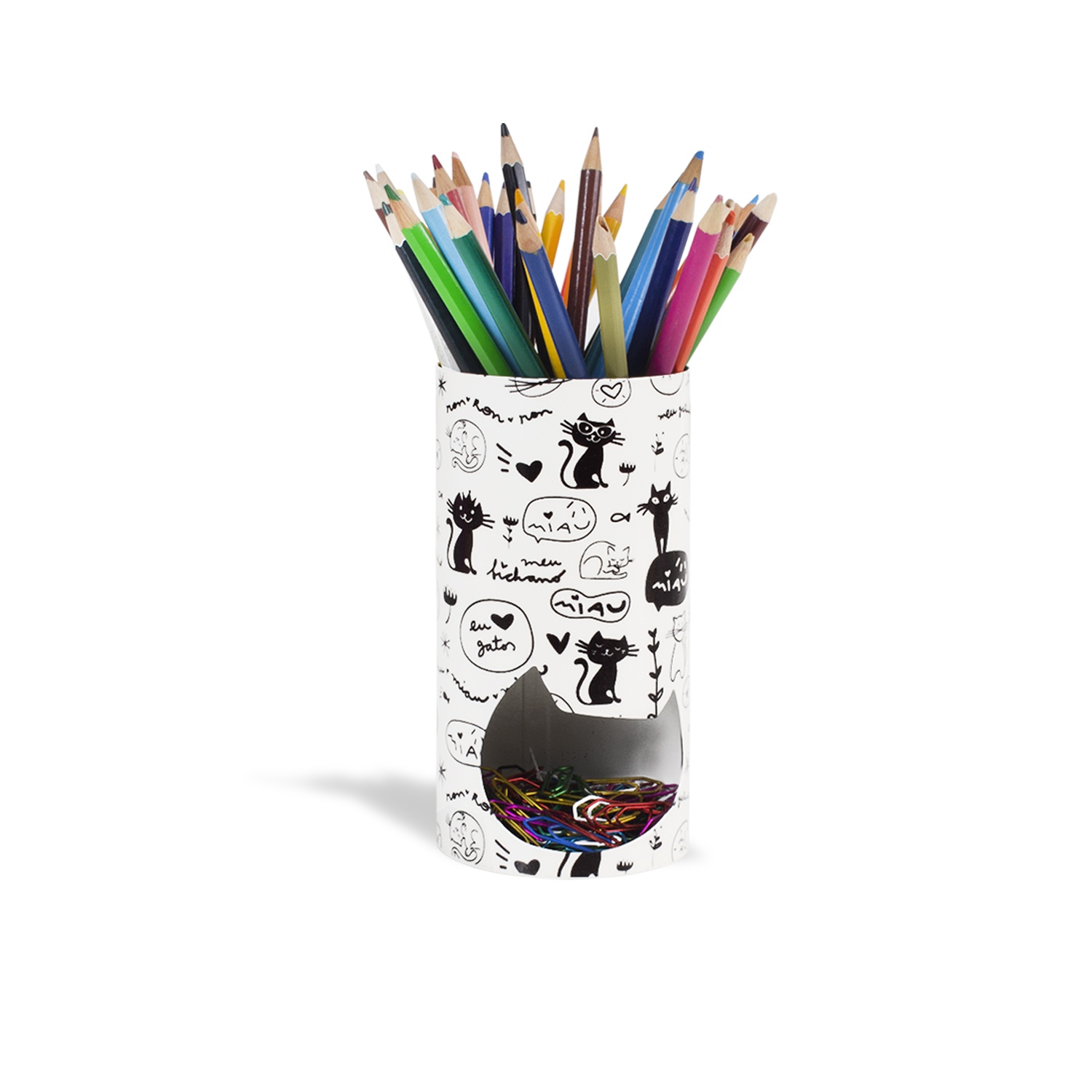 Para gatinhas, organizarem e decorarem a mesa de trabalho. O formato torre possibilita colocar clips, borracha, apontador na parte de baixo do porta caneta, lápis, caneta e tesoura na parte de cima. Produto de aço fabricado no Brasil. Todo dia é dia de se divertir! Em qualquer hora e em qualquer lugar! Então, por que não decorar os nossos ambientes com produtos que além de funcionais e práticos sejam divertidos? Também pode ser utilizado para colocar pincéis de maquiagem, escova de cabelo, tic-tac e grampos na parte de baixo. Sugestão de presente para meninas. Os lápis, canetas, tesoura não acompanham o produto.