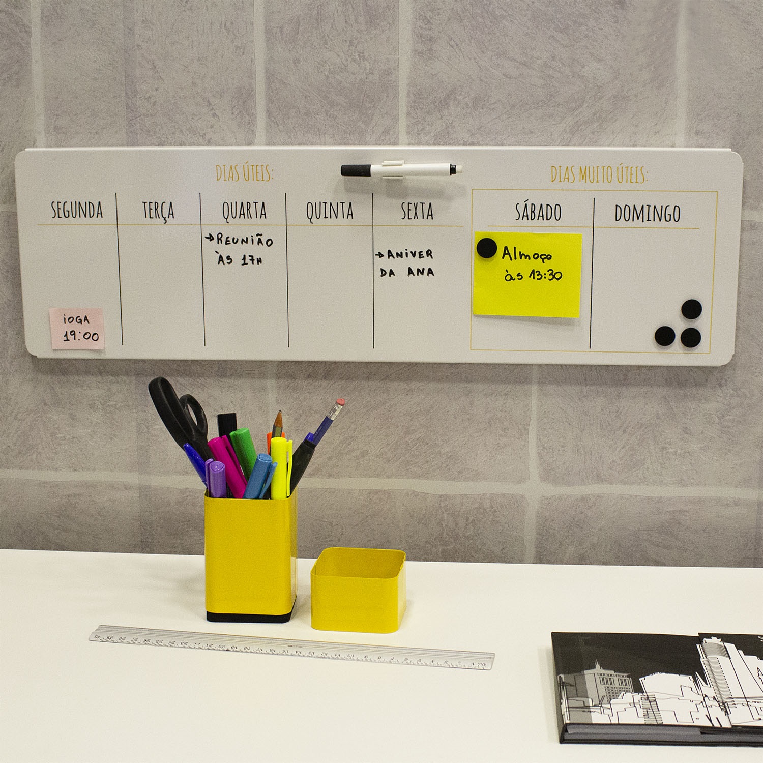 Conteúdo da Embalagem: 1 mural, 1 caneta preta marcador de quadro branco, 1 suporte c/ímã para caneta, 4 imãs, 2 parafusos com bucha para fixação em paredes de alvenaria.