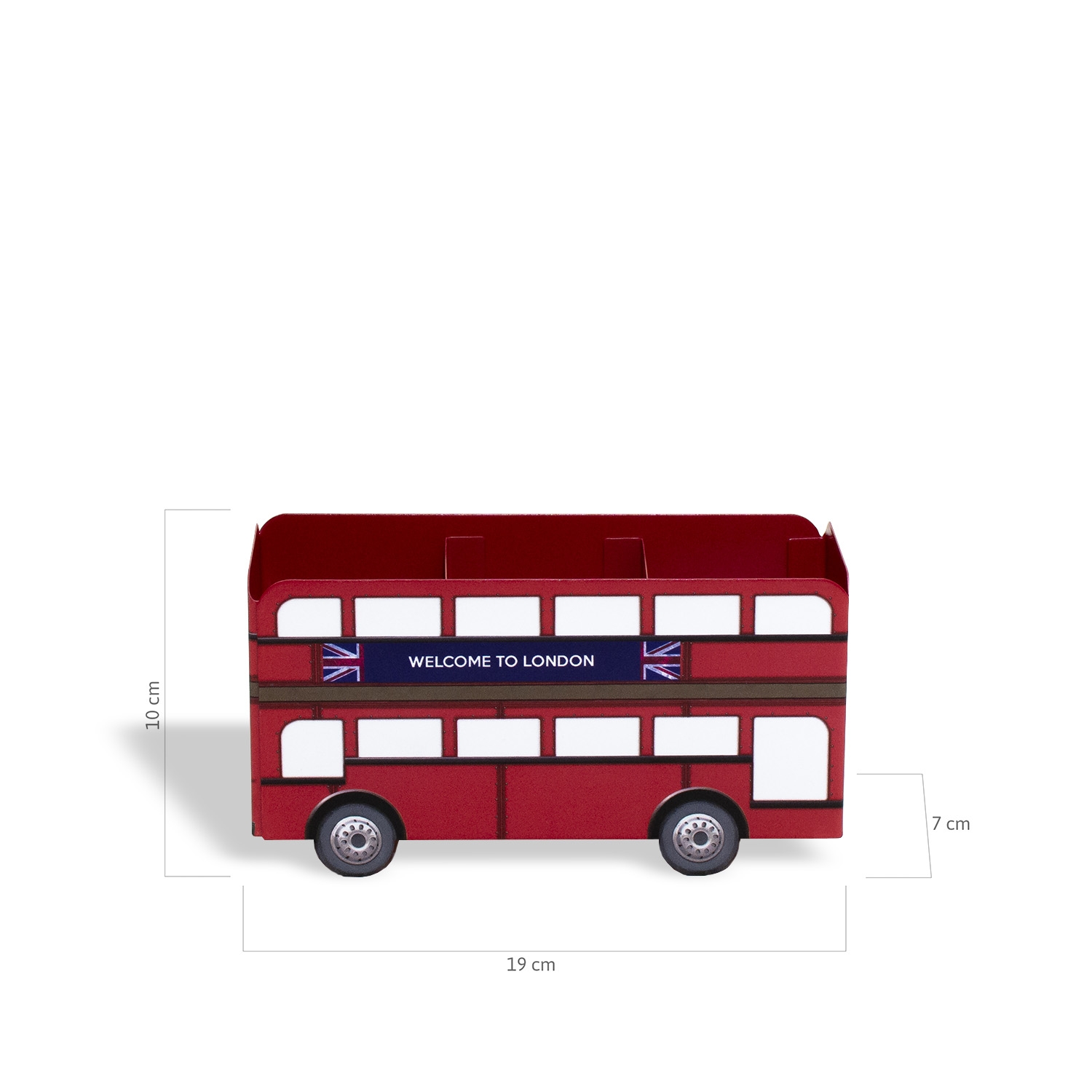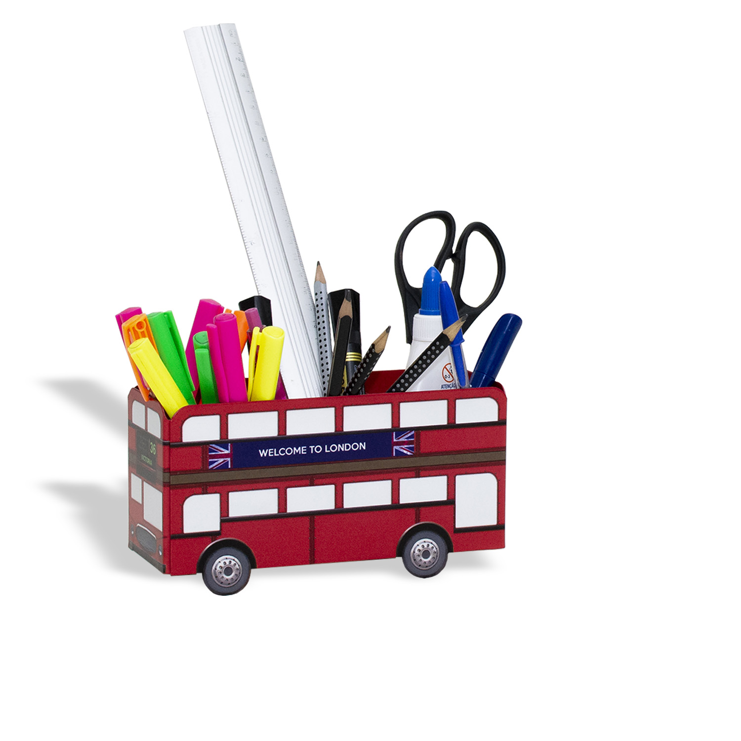 Inspirado no ônibus de Londres - Double-decker bus, para organizar e decorar a mesa de trabalho de uma forma lúdica e divertida. Produto de aço fabricado no Brasil. Porque viajar é trocar a roupa da alma, apurar os sentidos, abrir os horizontes, pintar o mundo com novas cores, e desafiar os nossos limites. Vamos viajar, estudar, explorar o mundo. Sugestão de presente para meninos. Os lápis, canetas, tesoura não acompanham o produto.
