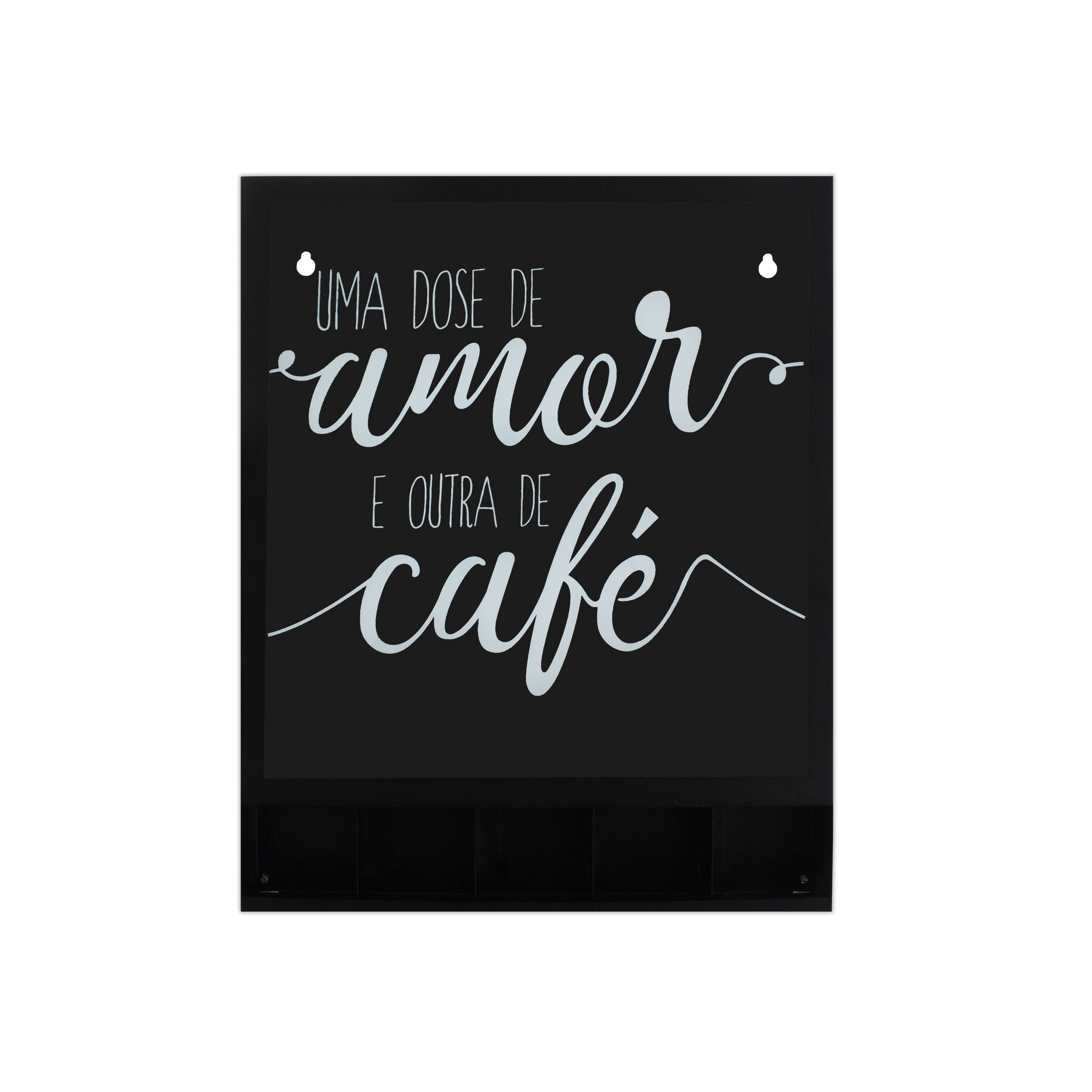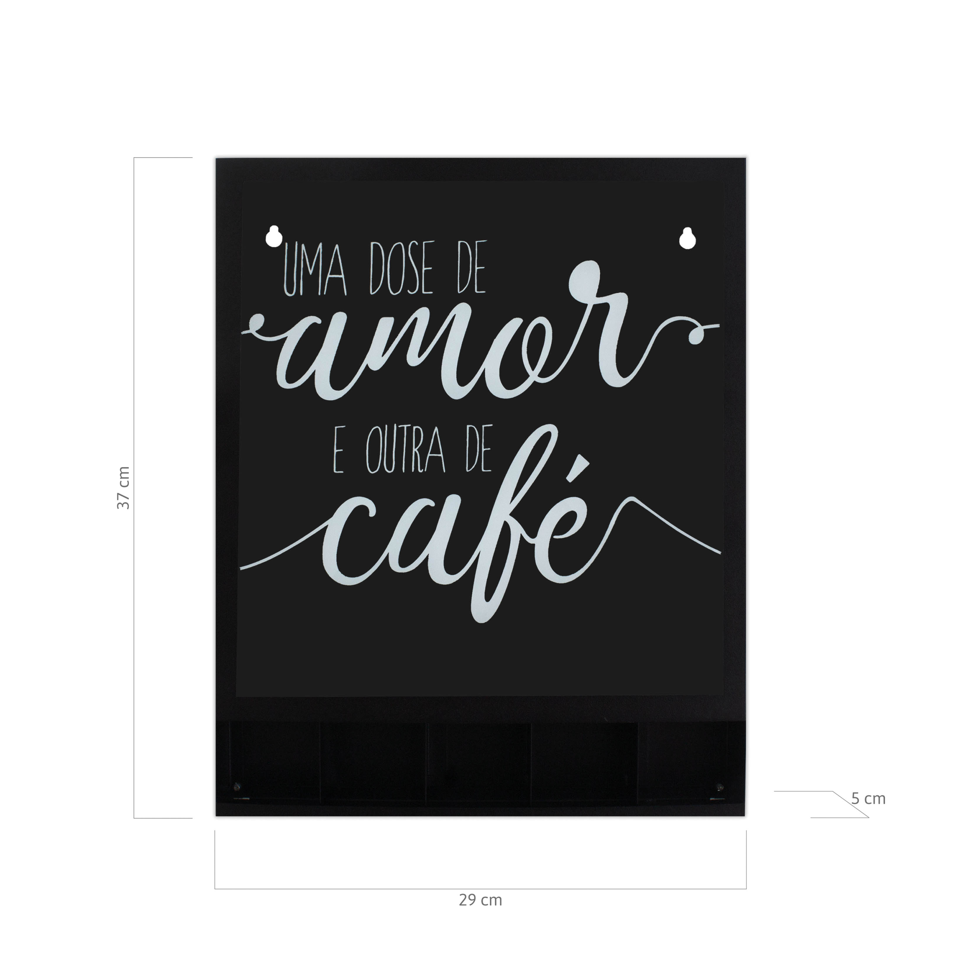 Uma dose de amor e outra de café. Com capacidade para aproximadamente 35 cápsulas de Dolce Gusto ou 50 cápsulas de Três Corações. Decore, inspire e organize seu cantinho do café. Para fixar em paredes de alvenaria com os parafusos e buchas que acompanham o produto. Produto de aço e vidro fabricado no Brasil. A Coleção Bistrô é inspirada nos aconchegantes e pequenos restaurantes franceses que servem uma refeição caseira, trabalham com comida, bebidas alcoólicas, chás e cafés, como um bar e restaurante. Sugestão de presente para quem ama café. As cápsulas não acompanham o produto.
