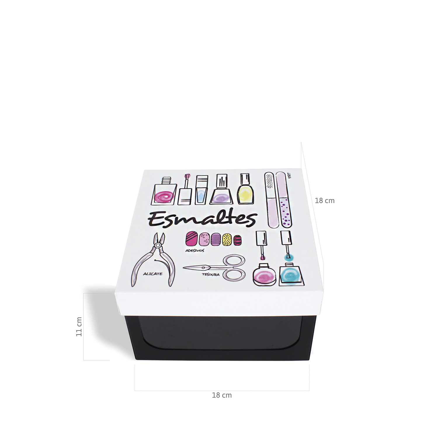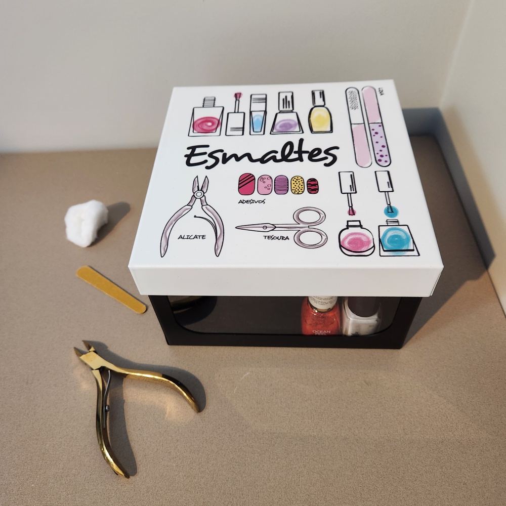 Capacidade: aproximadamente 25 esmaltes + kit cuidados com as unhas.