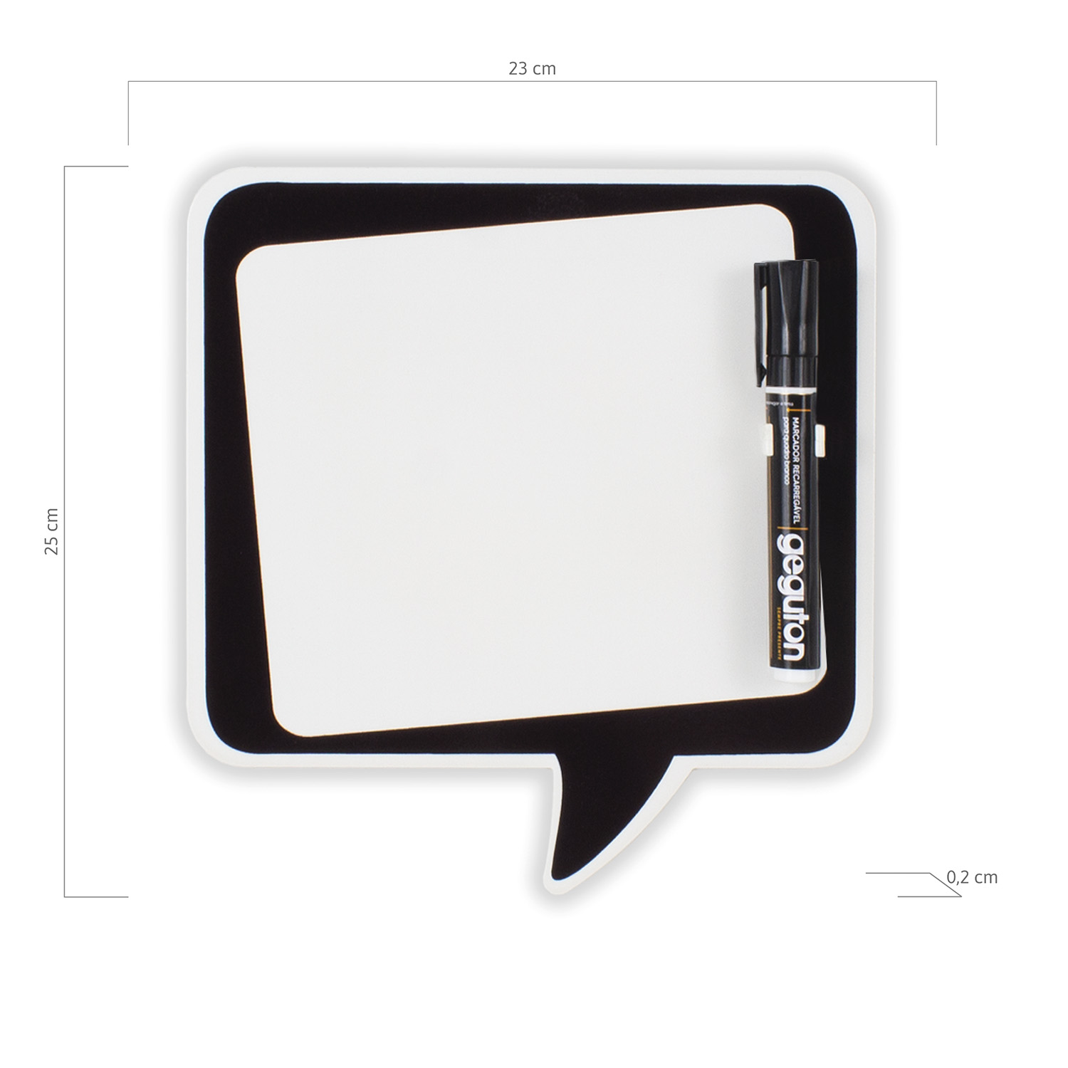 Conteúdo da Embalagem: 1 porta recado com fita dupla-face, 1 caneta preta de quadro branco com suporte de ímã.