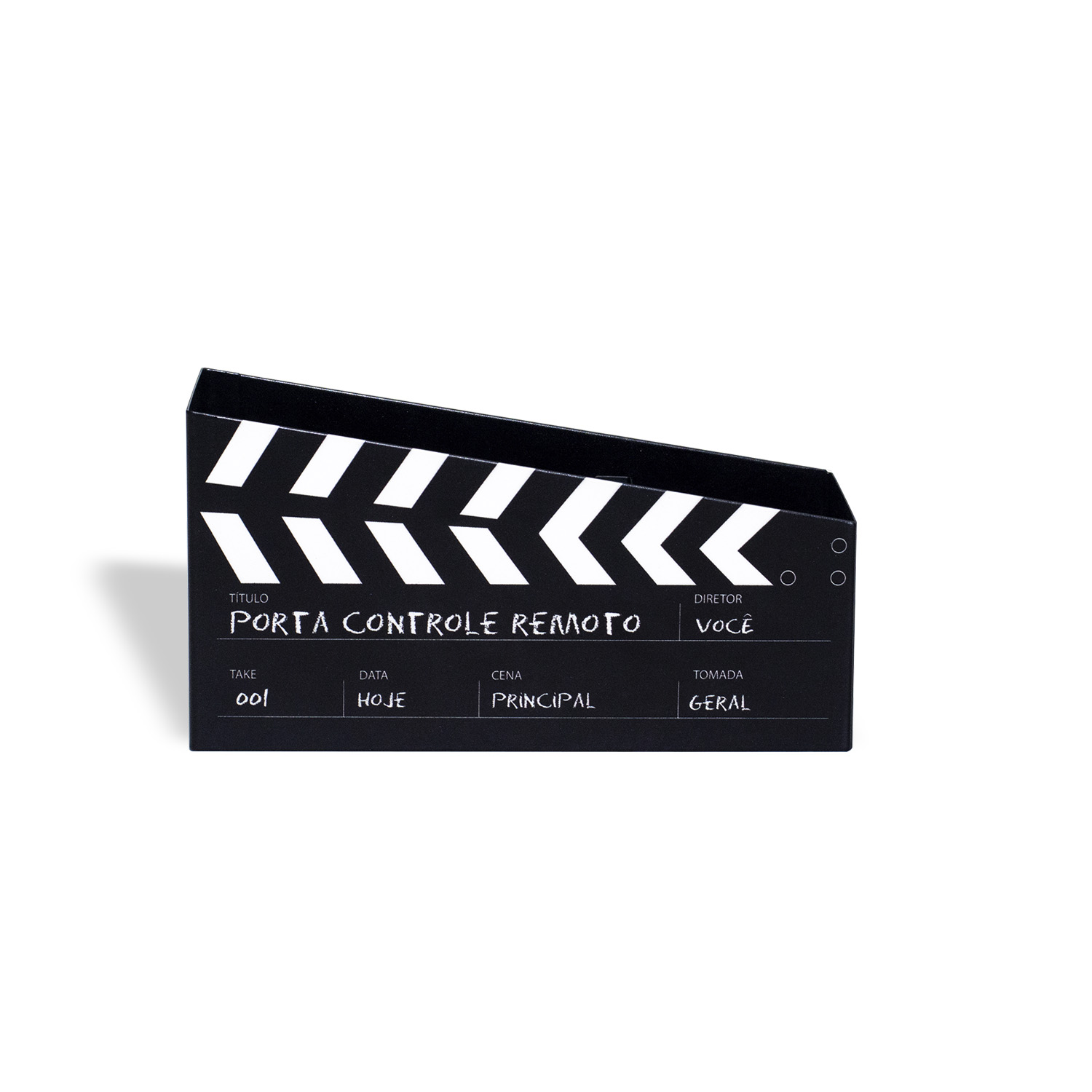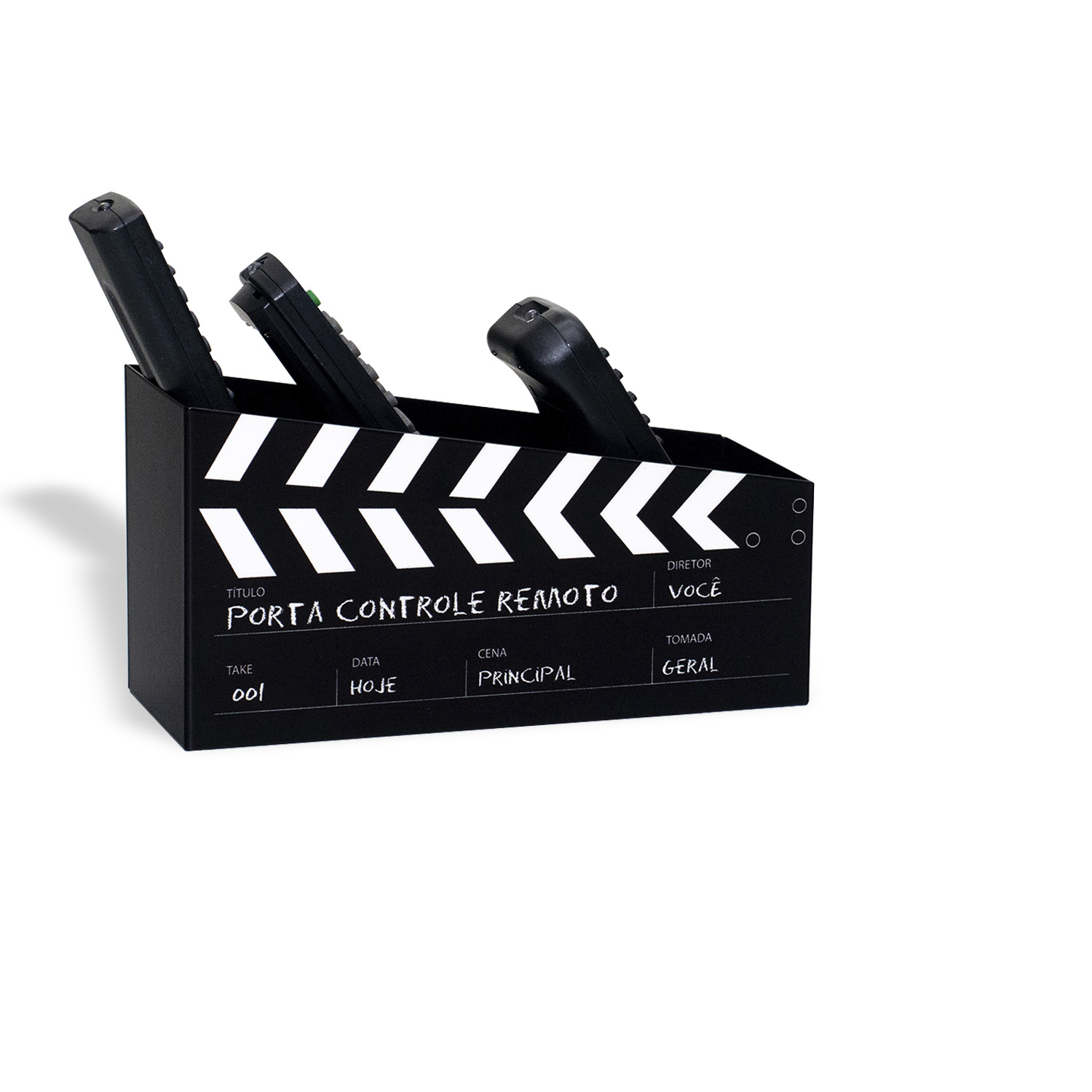 porta controle cinemaRef: PT01.1944.LIS Inspirado em uma claquete antiga de cinema, divertido e jovem - possui 3 compartimentos para organizar os controles (tv, ar-condicionado) do seu ambiente. Produto de aço fabricado no Brasil. Todo dia é dia de se divertir! Em qualquer hora e em qualquer lugar! Então, por que não decorar os nossos ambientes com produtos que além de funcionais e práticos sejam divertidos? Qual a programação para hoje à noite? Os controles não acompanham o produto.