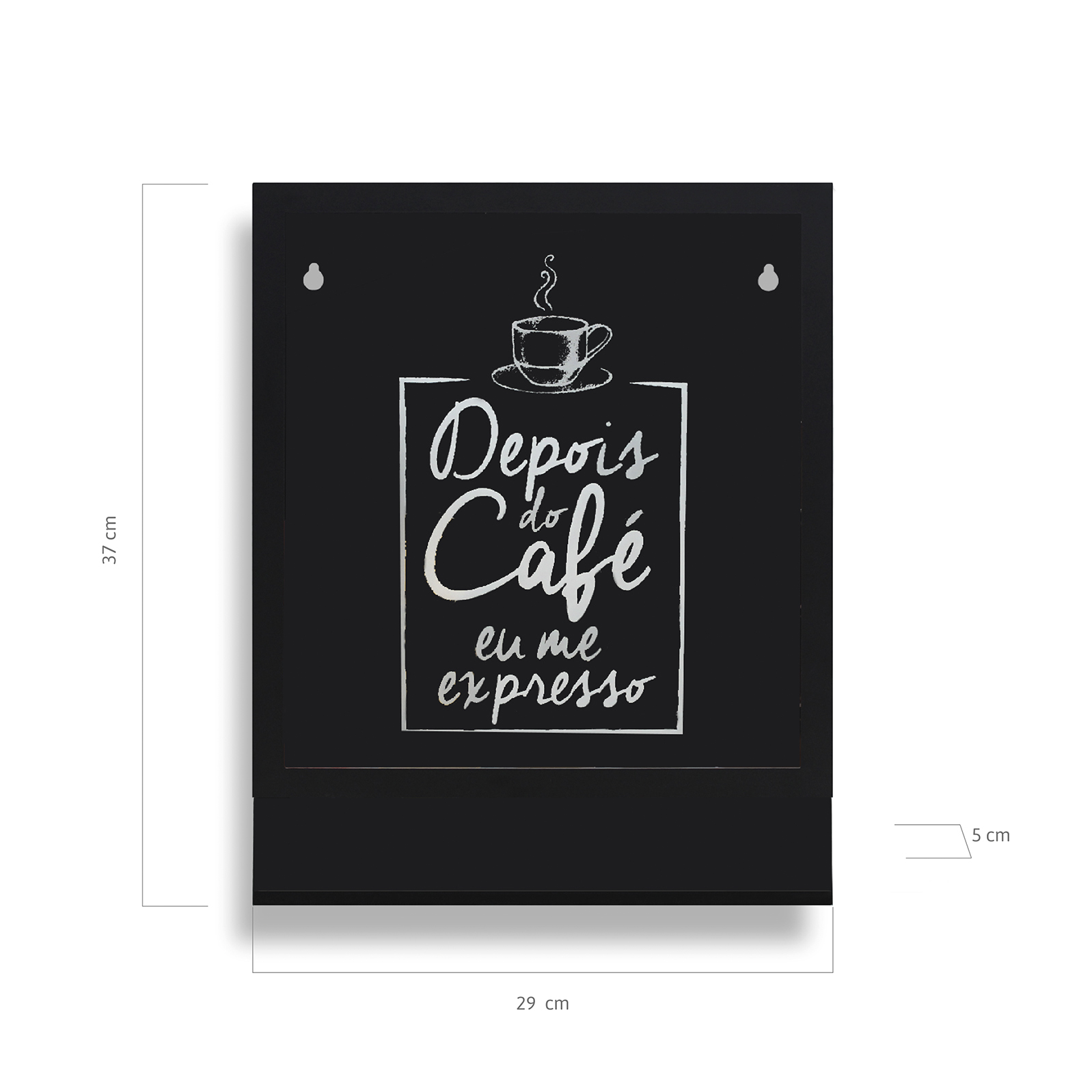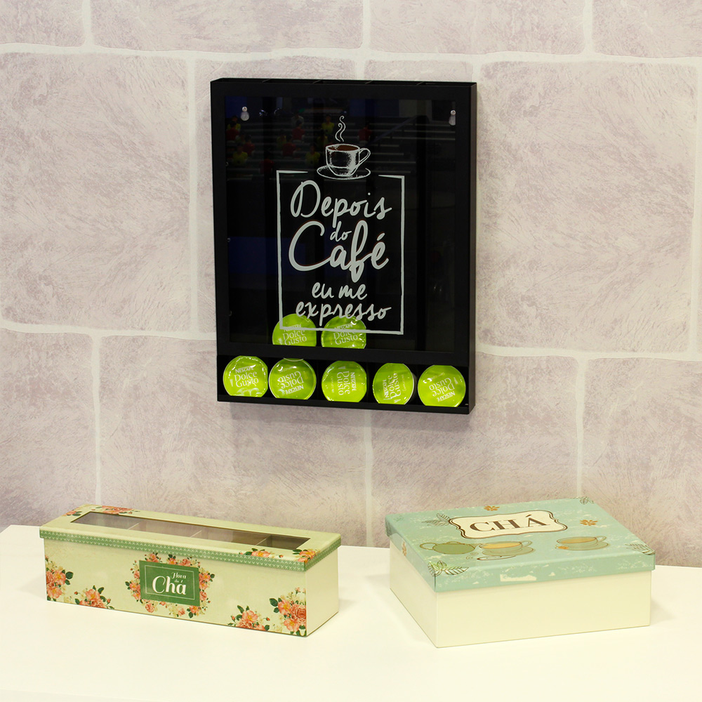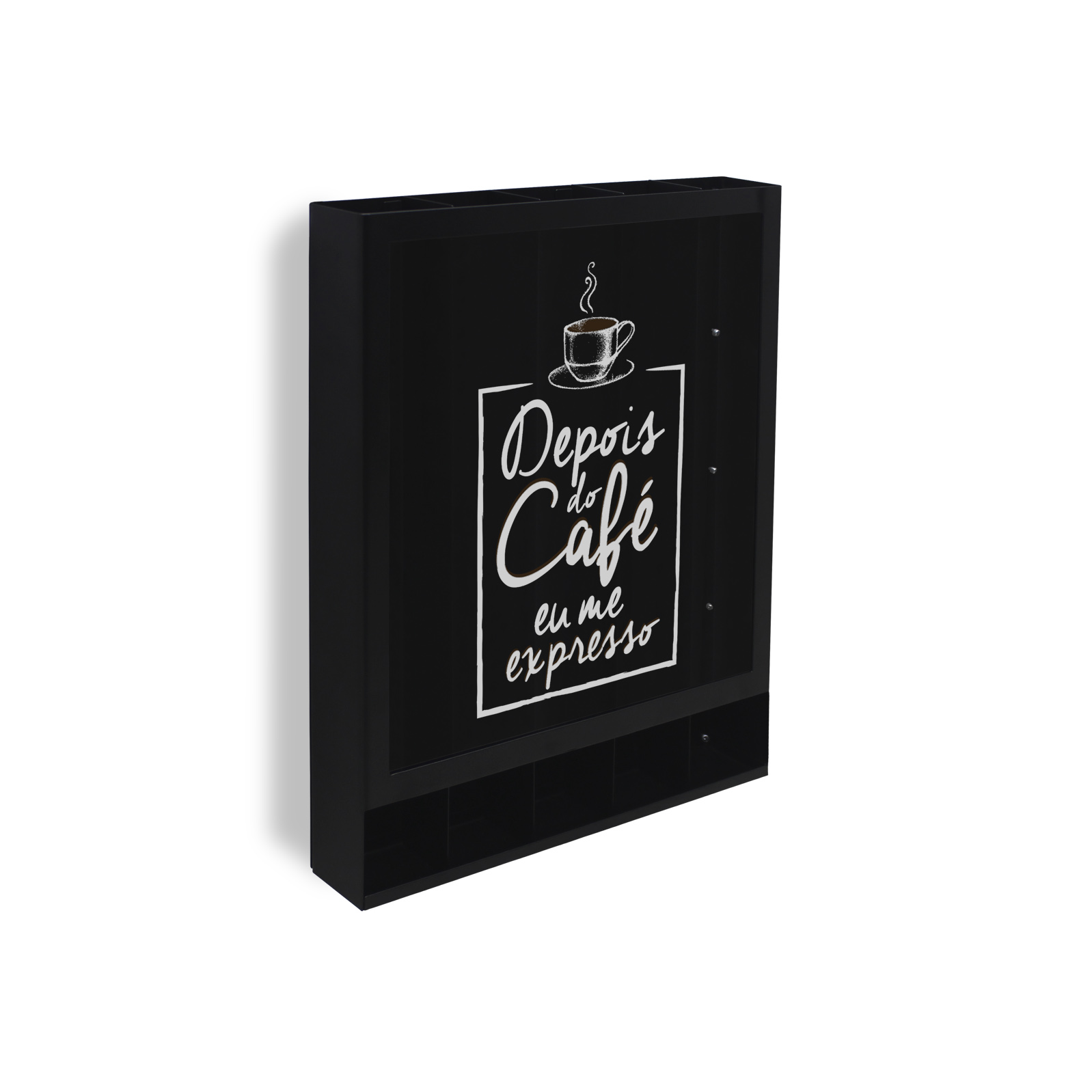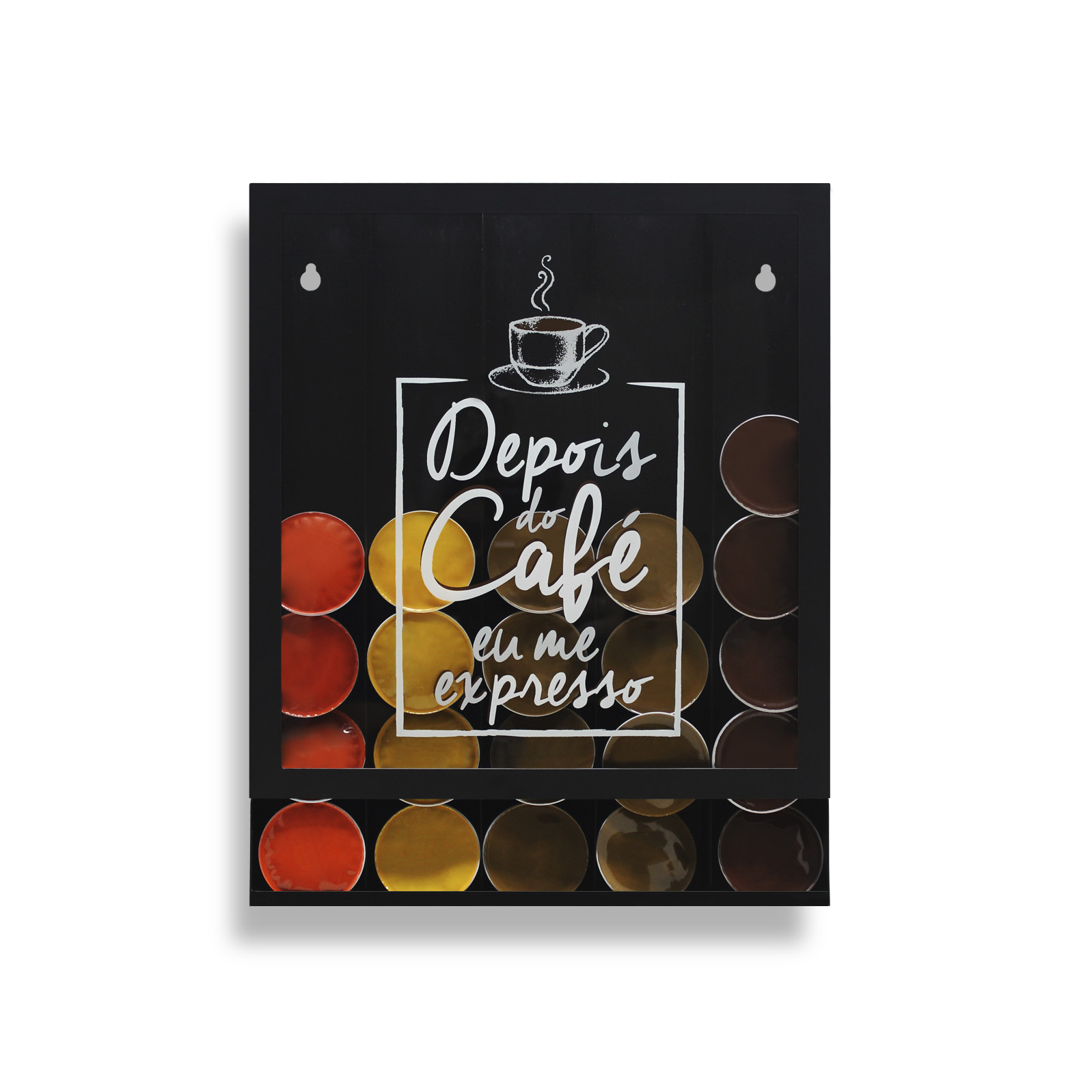 Depois do café eu me expresso. Com capacidade para aproximadamente 35 cápsulas de Dolce Gusto ou 50 cápsulas de Três Corações. Decore, inspire e organize seu cantinho do café. Para fixar em paredes de alvenaria com os parafusos e buchas que acompanham o produto. Produto de aço e vidro fabricado no Brasil. A Coleção Bistrô é inspirada nos aconchegantes e pequenos restaurantes franceses que servem uma refeição caseira, trabalham com comida, bebidas alcoólicas, chás e cafés, como um bar e restaurante. Sugestão de presente para quem ama café. As cápsulas não acompanham o produto.