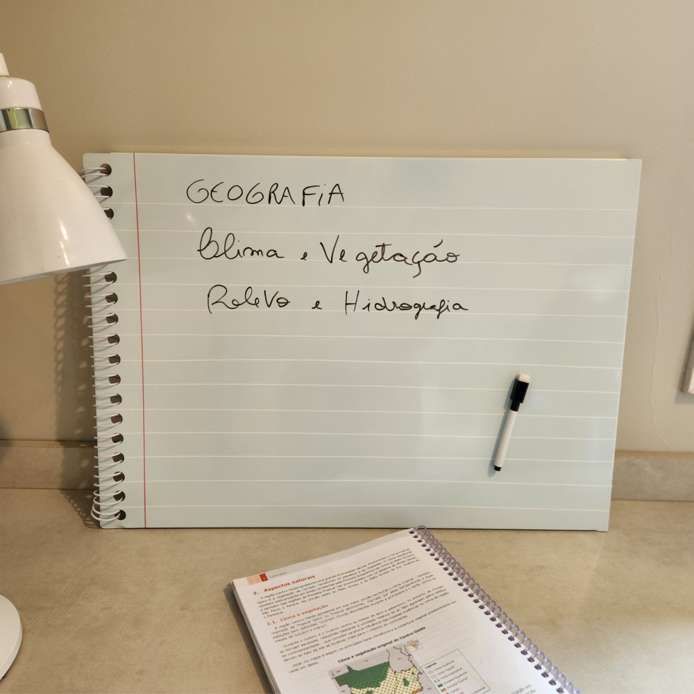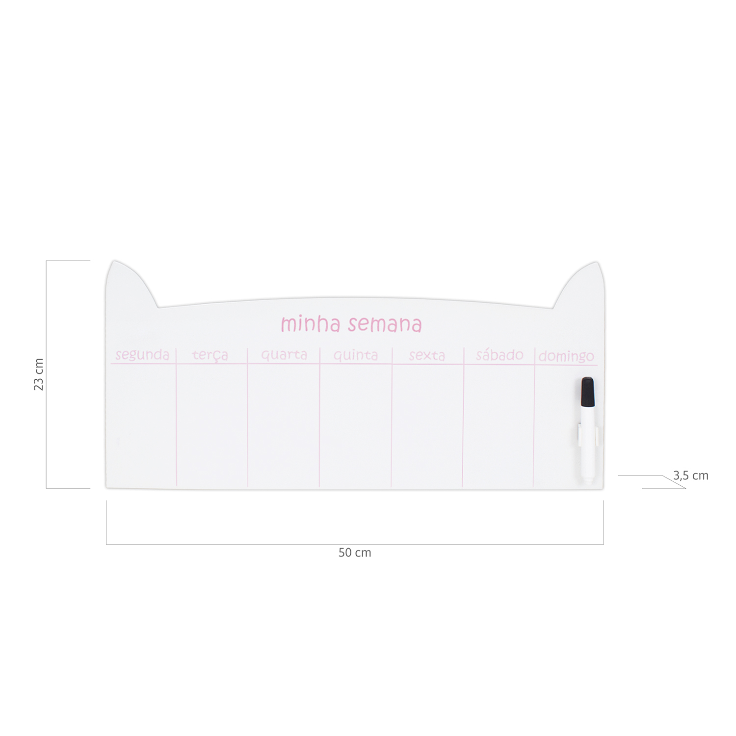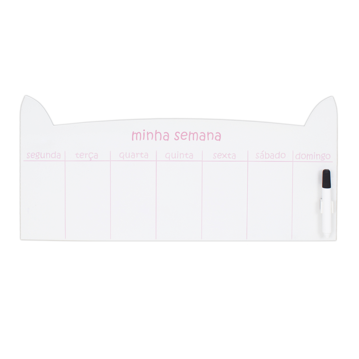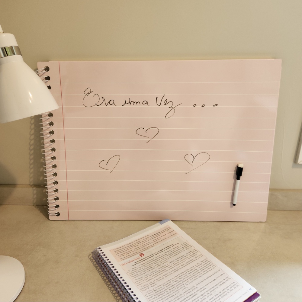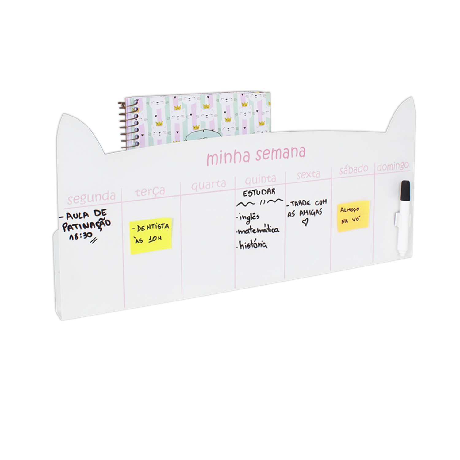 Para planejar a semana, é um calendário interativo, onde você pode escrever e apagar com a caneta marcador de quadro branco que acompanha. Além disso, tem um espaço atrás, que cumpre a função de prateleira, onde é possível colocar cadernos, livros. Este painel prateleira de aço foi projetado para fixar em paredes de alvenaria com os parafusos e buchas que acompanham o produto. Por ser de aço você também pode utilizar imãs. Produto fabricado no Brasil. A Coleção Anote Aí é inspirada na necessidade que temos de nos expressar através de desenhos, lembretes, recados, de fazer anotações de algo que deve ser feito, que não pode cair no esquecimento, de uma forma prática e funcional. Dê de presente para uma gatinha organizar suas atividades escolares. O caderno não acompanha o produto.