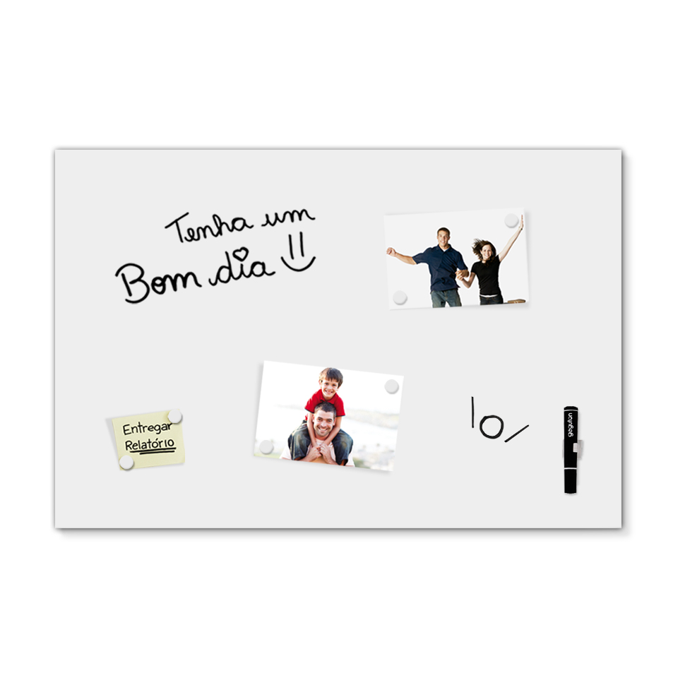 Conteúdo da Embalagem: 1 painel, 1 caneta preta marcador de quadro branco com suporte de imã, 2 parafusos com bucha para fixação em paredes de alvenaria.