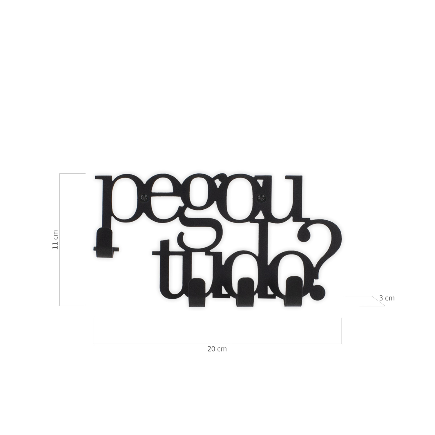 Pegou tudo? Divertido e jovem, para pendurar as chaves e lembrar você se não esqueceu de nada antes de sair. Este porta chaves foi projetado para fixar em parede de alvenaria com os parafusos e buchas que acompanham o produto. Todo dia é dia de se divertir! Em qualquer hora e em qualquer lugar! Então, por que não decorar os nossos ambientes com produtos que além de funcionais e práticos sejam divertidos? As chaves, chaveiros não acompanham o produto.