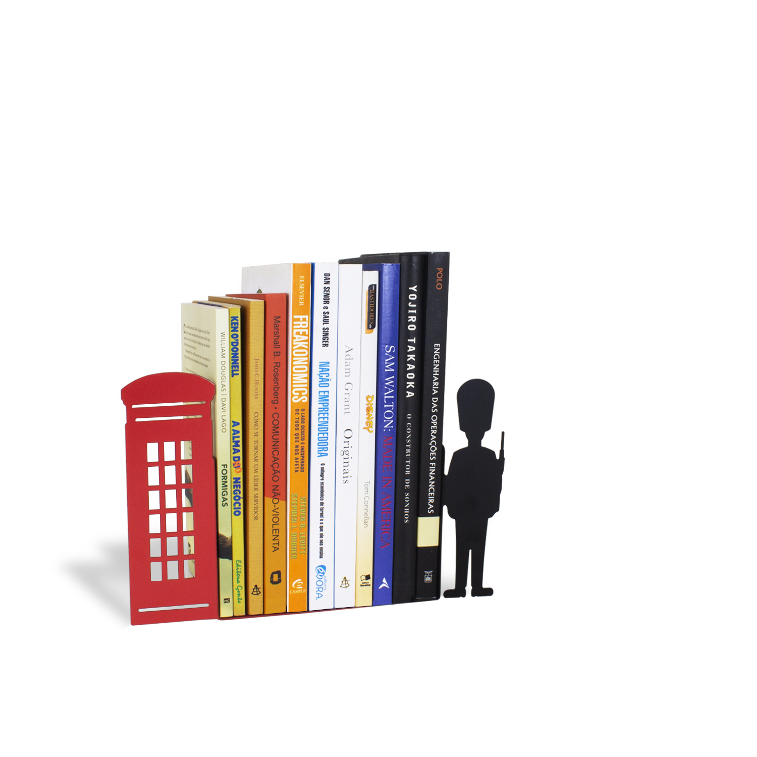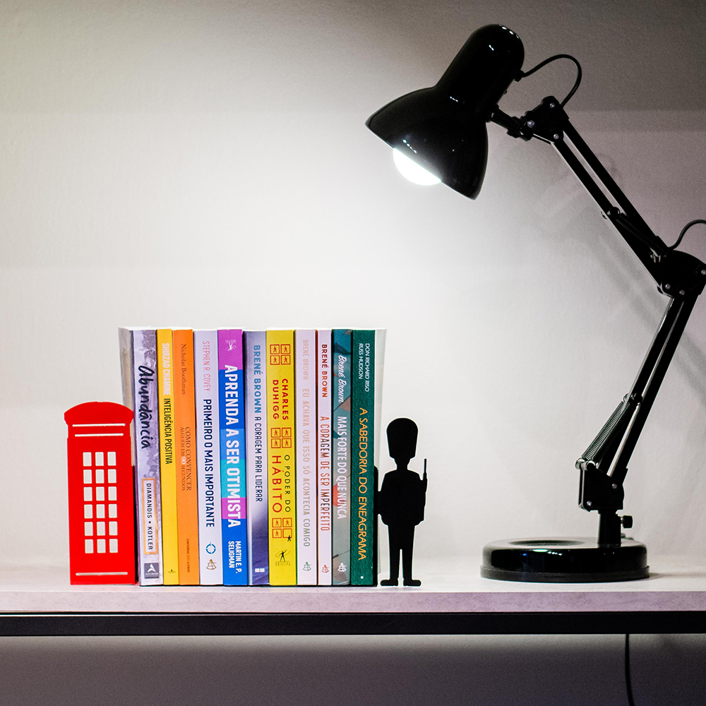 Para segurar e organizar livros decorando, divertindo e ensinando. De um lado a famosa cabine telefônica de Londres e do outro um guarda da Rainha. Produto de aço recortado fabricado no Brasil. Porque viajar é trocar a roupa da alma, apurar os sentidos, abrir os horizontes, pintar o mundo com novas cores, e desafiar os nossos limites. Vamos viajar, estudar, explorar o mundo. Os livros não acompanham o produto.