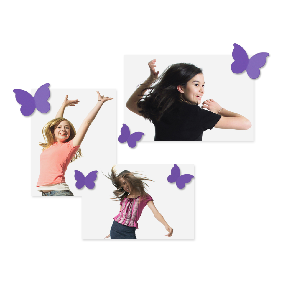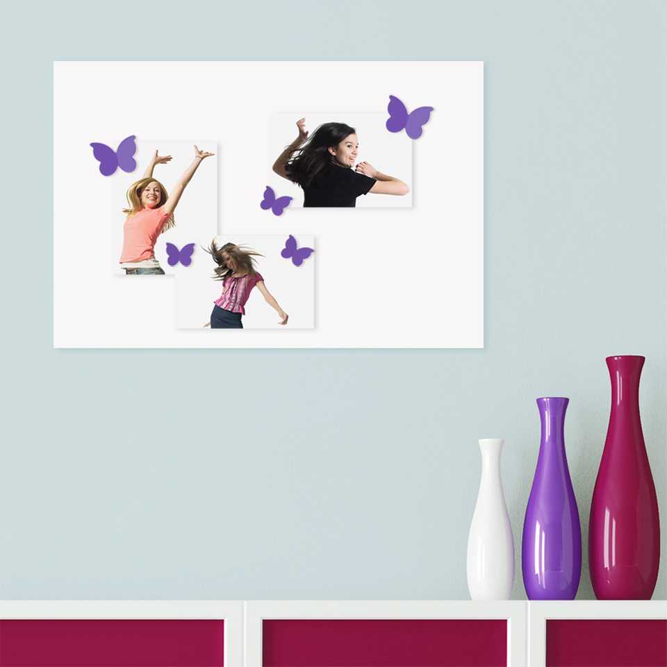 Super imã fofo para fixar suas fotos e recados com muito estilo. Dimensões das peças: Borboleta Maior: 5 x 4 cm / Borboleta Menor: 3 x 3 cm Composição: Chapa de aço com pintura epóxi lilás e super imã.